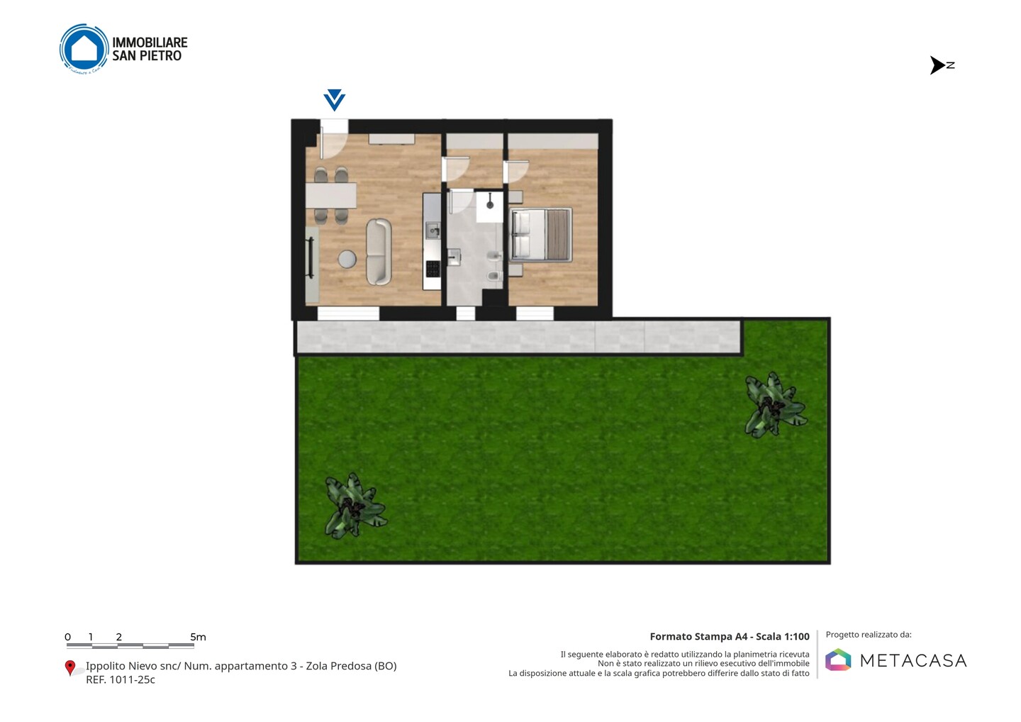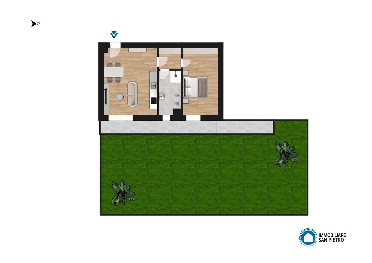 LOTTO 4-5 APP 3 posto al piano terra, affaccio su ampio giardino esclusivo, composto da ingresso su soggiorno con cucina a vista ed accesso al giardino, disimpegno zona notte, 1 camera matrimoniale con ulteriore accesso su giardino, 1 bagno finestrato.