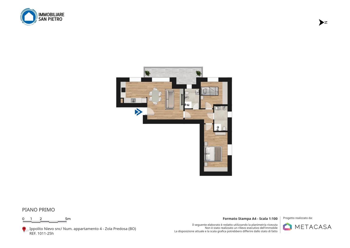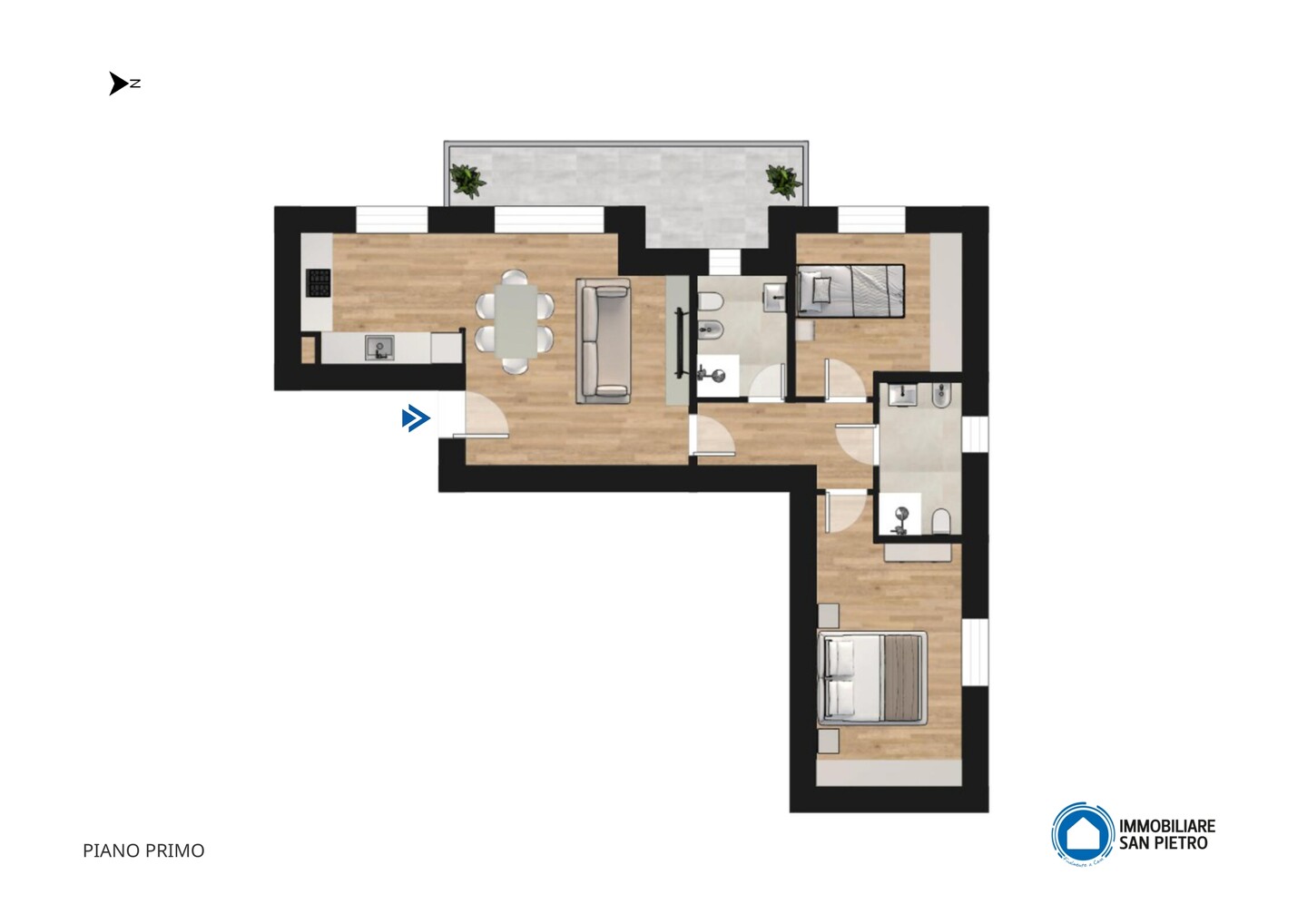LOTTO 4-5 APP 8 posto al primo piano con doppio affaccio, composto da ingresso su soggiorno con cucina a vista ed accesso al terrazzo, disimpegno zona notte, 1 camera matrimoniale ed una singola, 2 bagni finestrati.