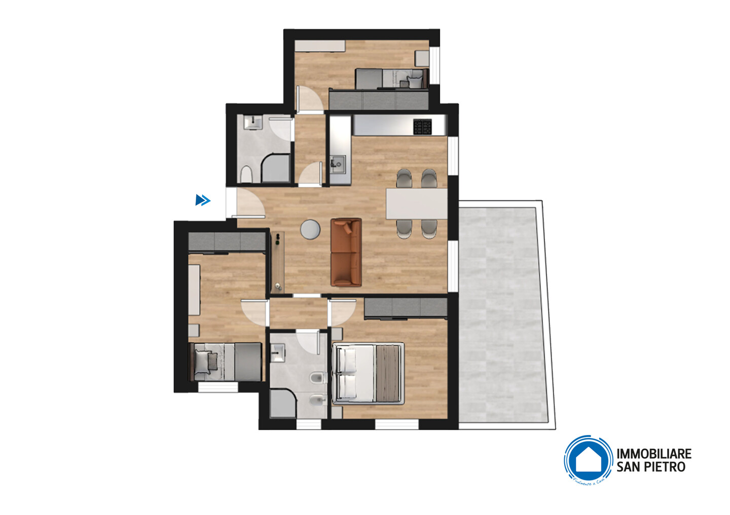 L’ingresso si apre su una luminosa zona giorno con sala e cucina a vista, affacciata su una terrazza di più di 15m.
