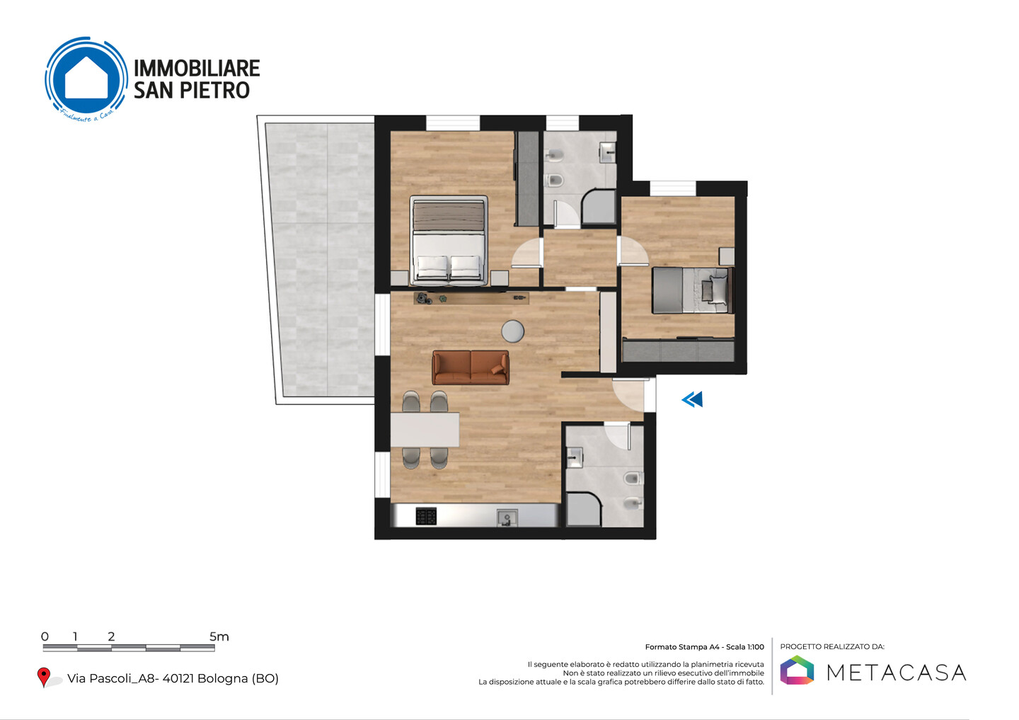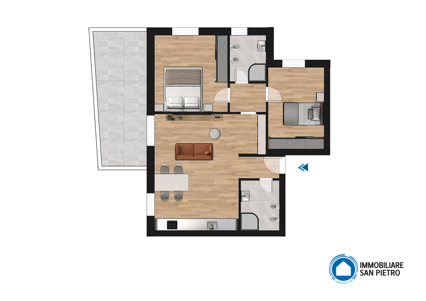 L’ingresso si apre su un accogliente soggiorno con cucina a vista che si affaccia su una terrazza abitabile. Un disimpegno separa la zona giorno dalla zona notte, che include due camere da letto e due bagni completi.