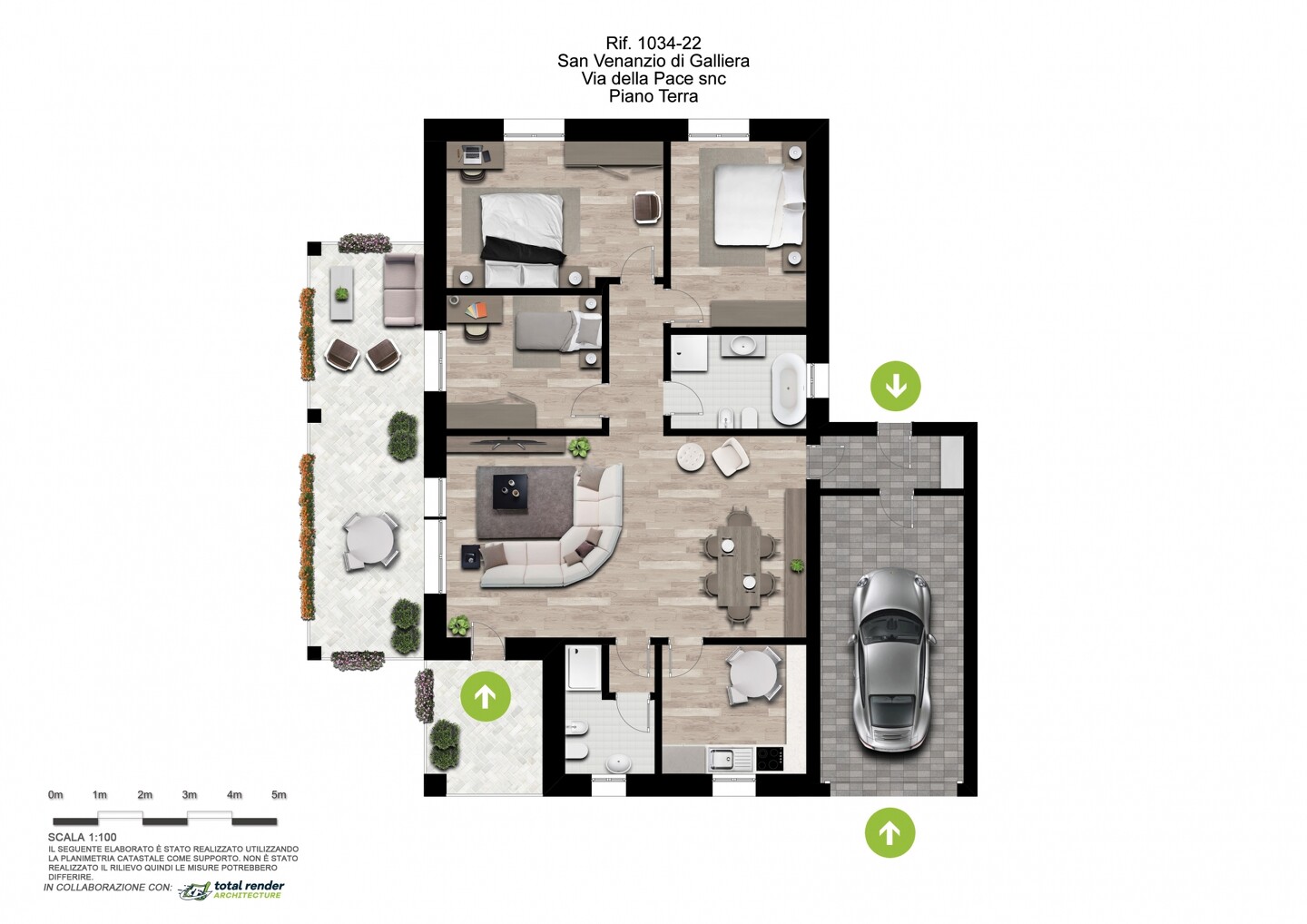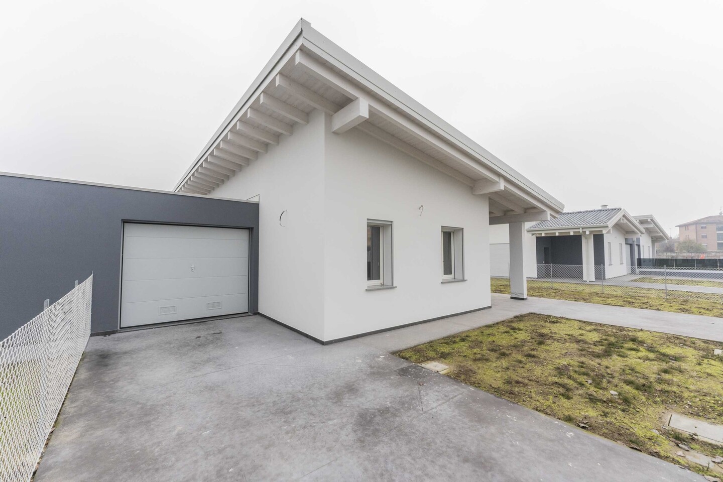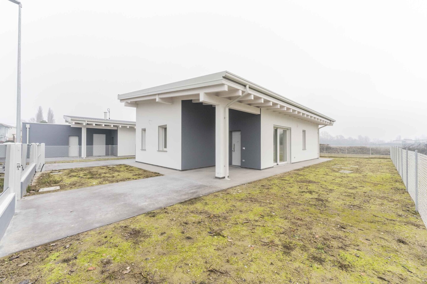 La porzione di bifamiliare (tipologia 3) è disposta totalmente al piano terra (senza barriere architettoniche), caratterizzata da ingresso indipendente dal giardino di 305 mq con spazioso portico. Internamente si compone di ingresso su salone di oltre 36 mq, cucina abitabile, disimpegno, 3 camere e 2 bagni, entrambi finestrati (uno dedicato alla zona giorno e uno alla zona notte). Completa la proprietà l’autorimessa.
