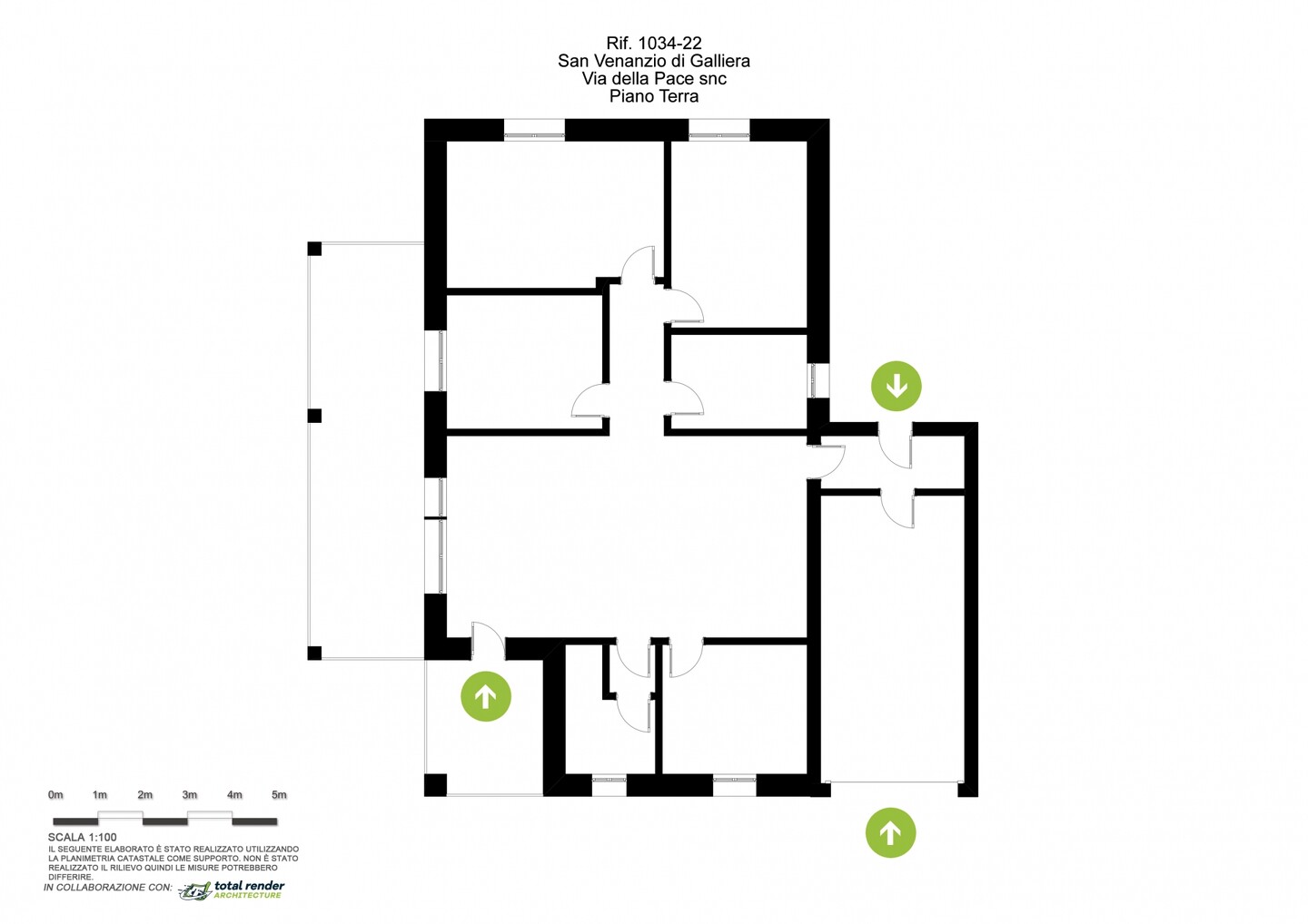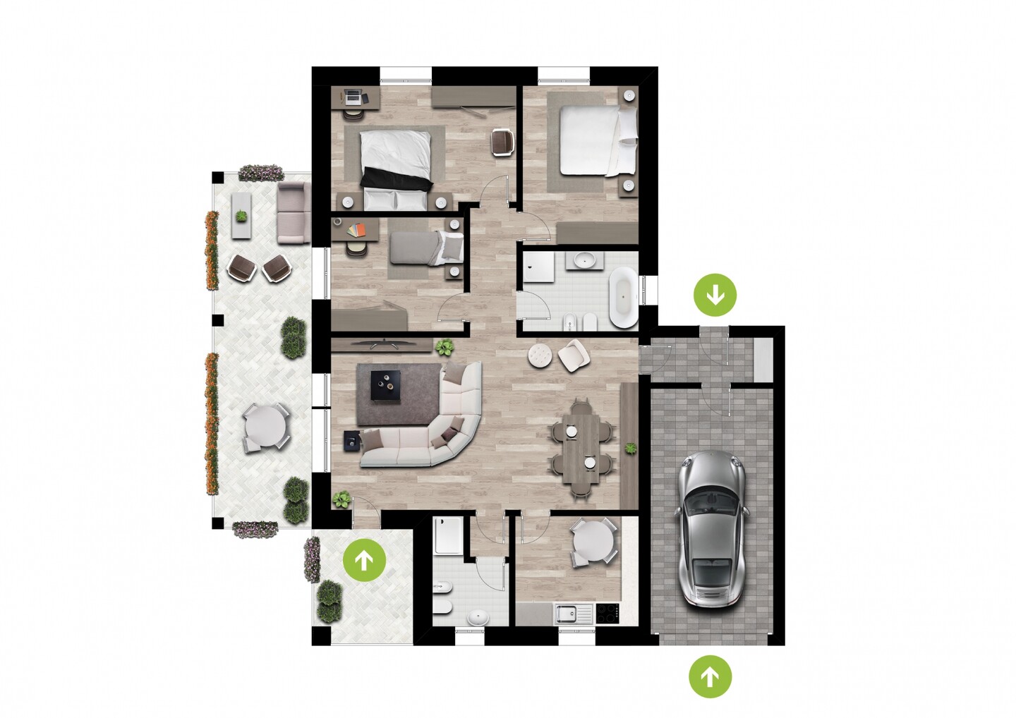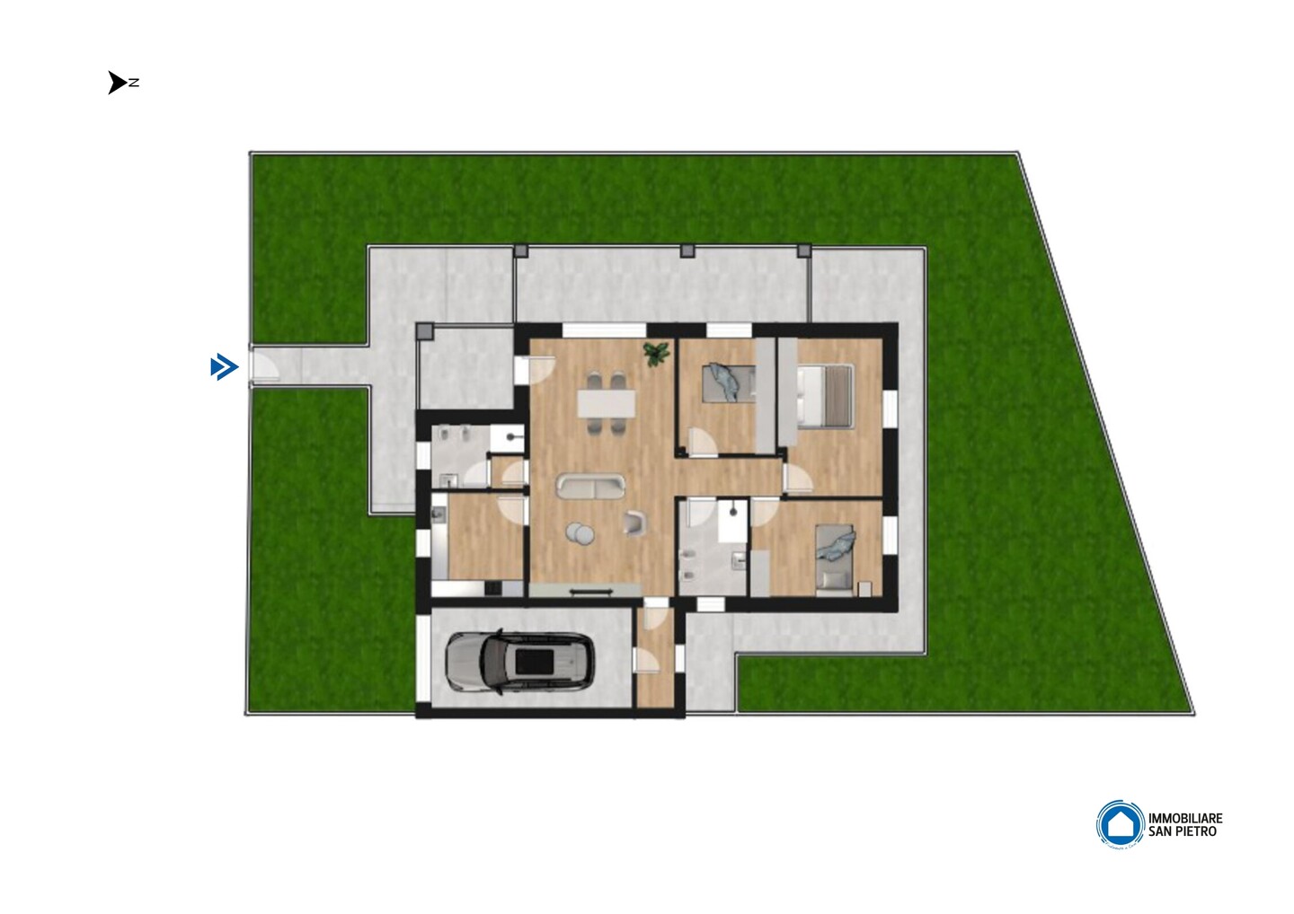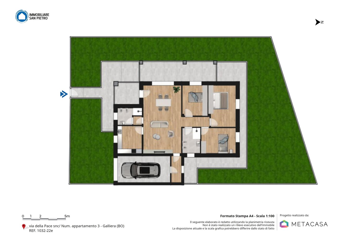 La porzione di bifamiliare (tipologia 3) è disposta totalmente al piano terra (senza barriere architettoniche), caratterizzata da ingresso indipendente dal giardino di 305 mq con spazioso portico. Internamente si compone di ingresso su salone di oltre 36 mq, cucina abitabile, disimpegno, 3 camere e 2 bagni, entrambi finestrati (uno dedicato alla zona giorno e uno alla zona notte). Completa la proprietà l’autorimessa.