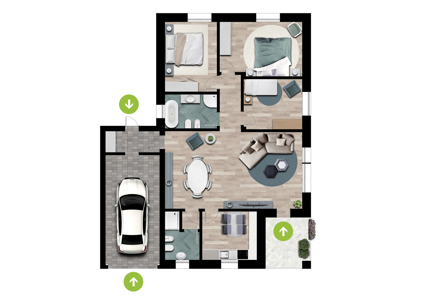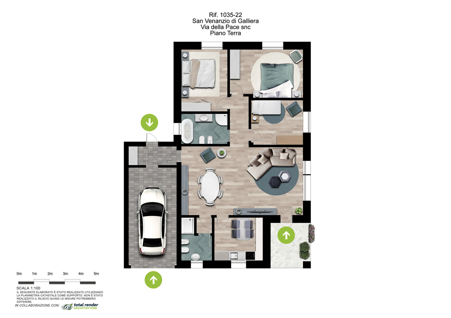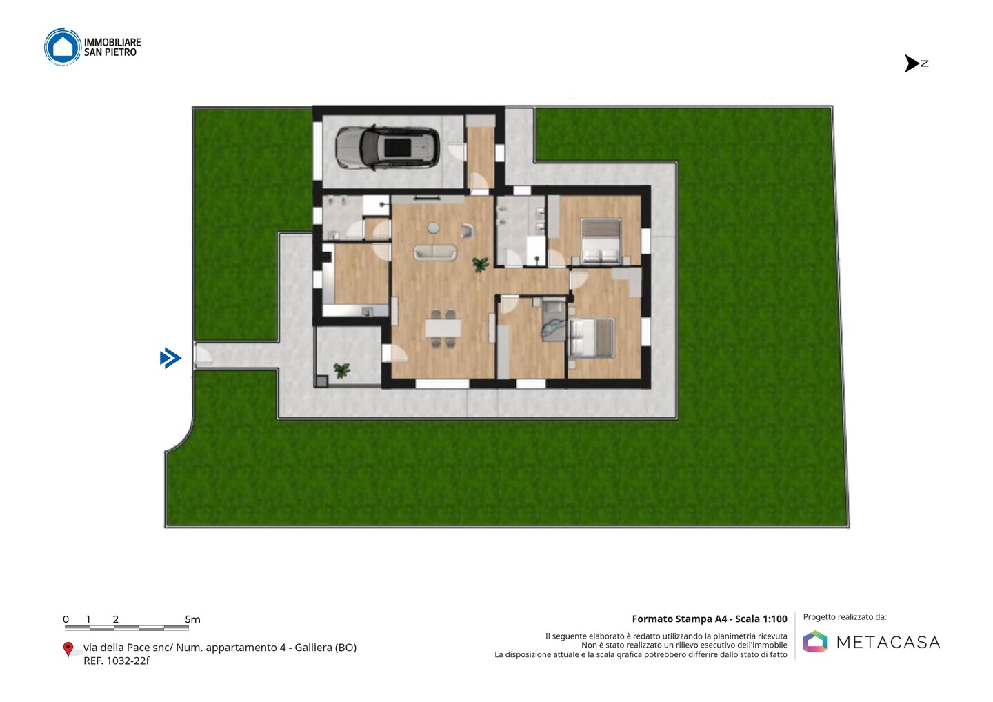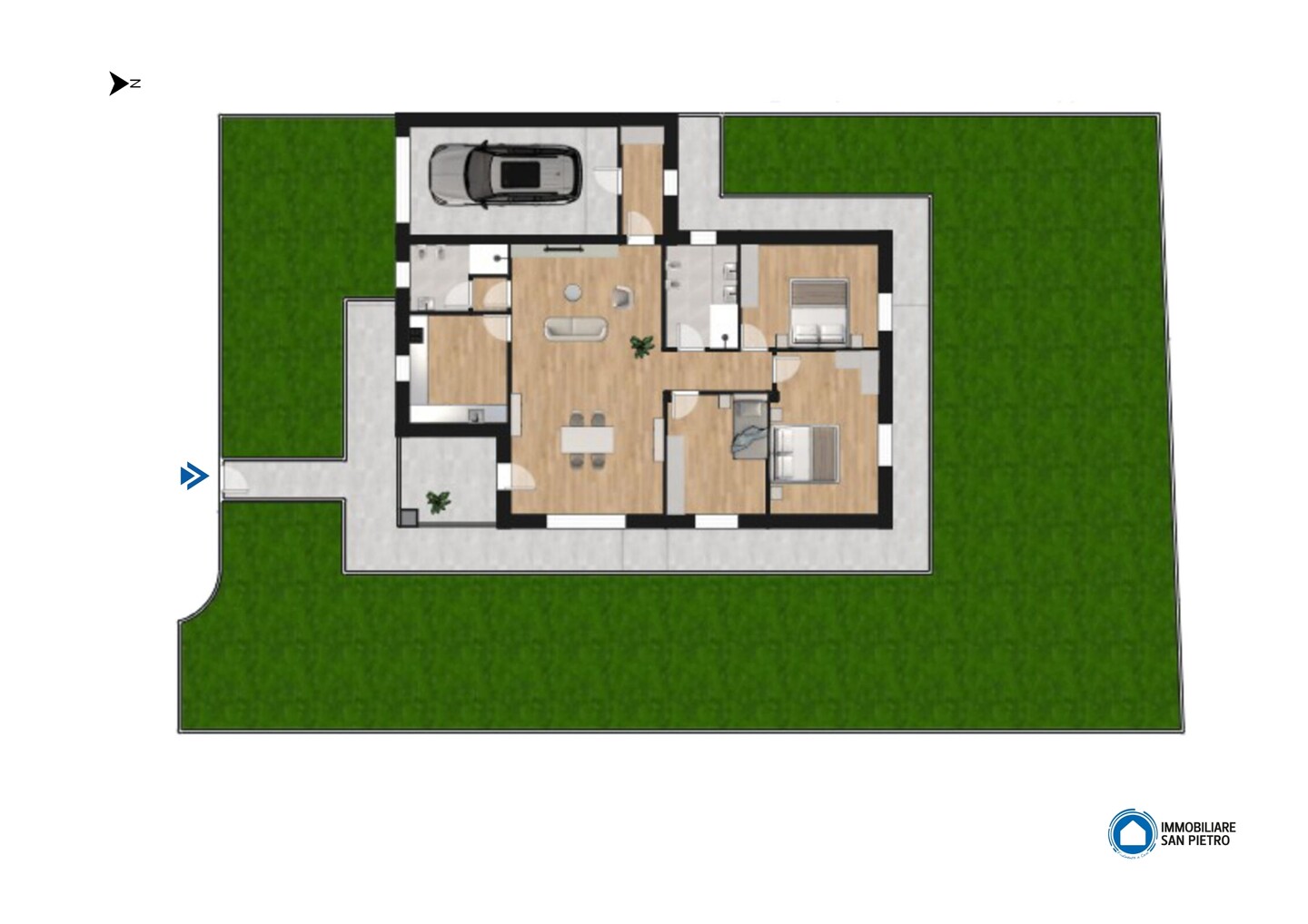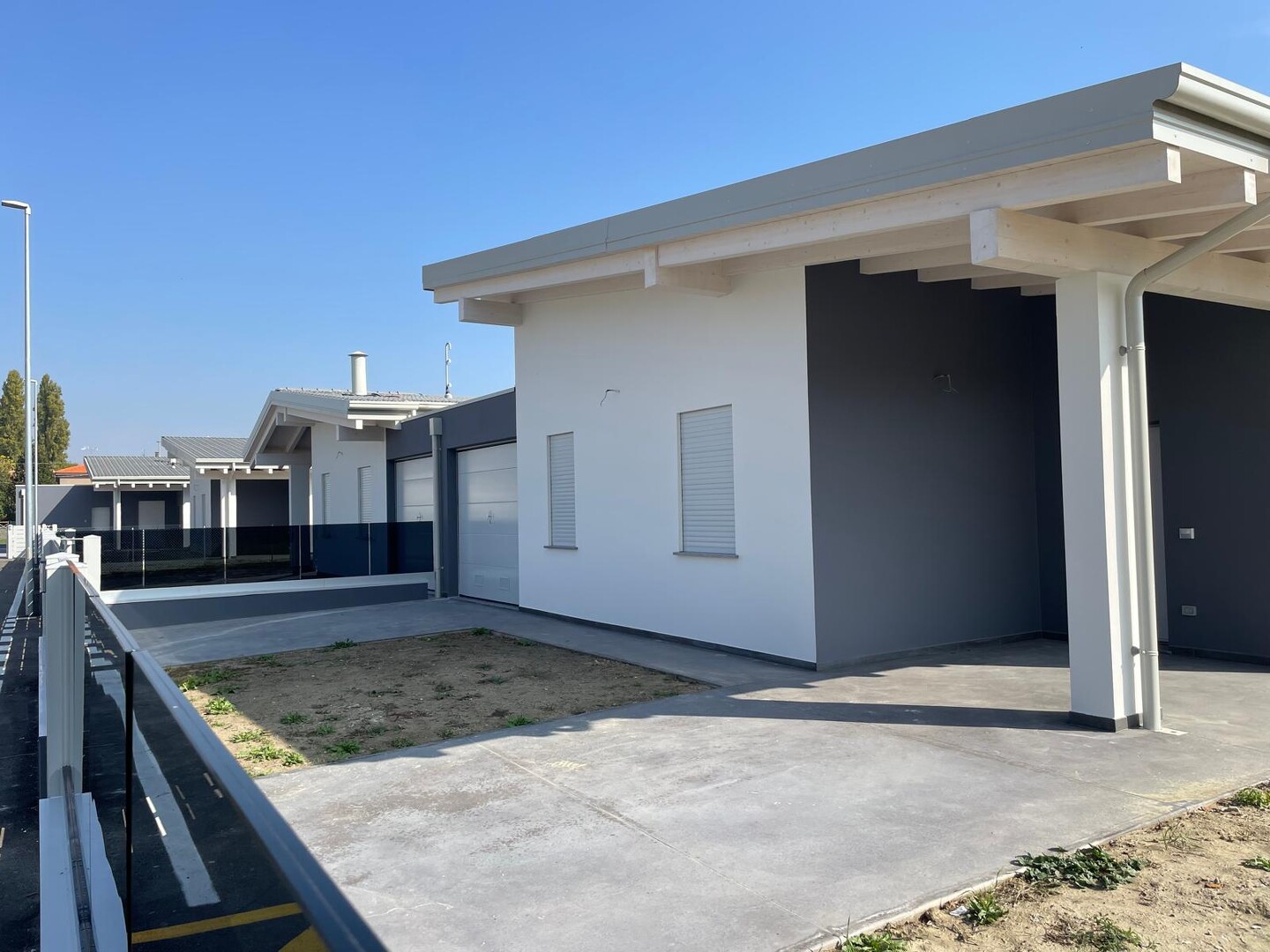 In elegante villa bifamiliare, disponiamo di porzione su unico piano (tipologia 4) con ingresso indipendente dal giardino privato di mq 365. Internamente si compone di ingresso su salone di oltre 36 mq e cucina abitabile, entrambe con accesso al portico, disimpegno, 3 camere e 2 bagni, entrambi finestrati (uno dedicato alla zona giorno e uno alla zona notte). Completa la proprietà l’autorimessa, collegata anche internamente all’immobile.
