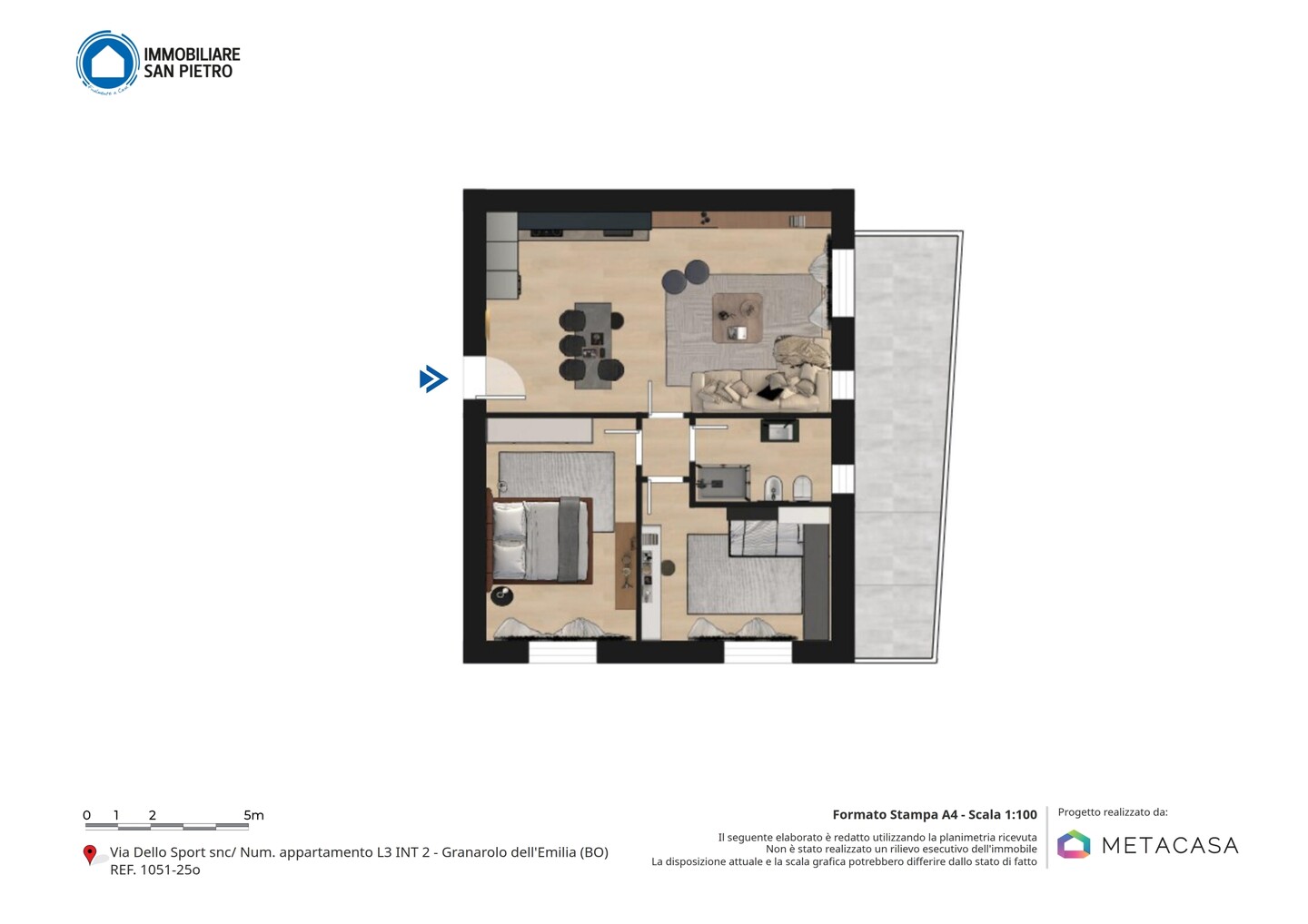 In un contesto residenziale moderno e ben collegato, nasce questo appartamento trilocale al piano primo, pensato per chi desidera un’abitazione funzionale, luminosa e pronta da vivere. L’ingresso conduce direttamente nella zona giorno open space, che integra cucina e soggiorno in un unico ambiente accogliente e ben organizzato, con accesso diretto al terrazzo loggiato, perfetto per pranzi all’aperto o momenti di relax. La zona notte è ben separata e comprende una camera matrimoniale, una seconda camera ideale come stanza singola, studio o ospiti, e un bagno finestrato . Le finiture moderne, l’efficienza energetica e la qualità costruttiva garantiscono un elevato comfort abitativo. Un’opportunità ideale per giovani coppie, piccoli nuclei familiari o come investimento di qualità nel cuore di Granarolo dell’Emilia.