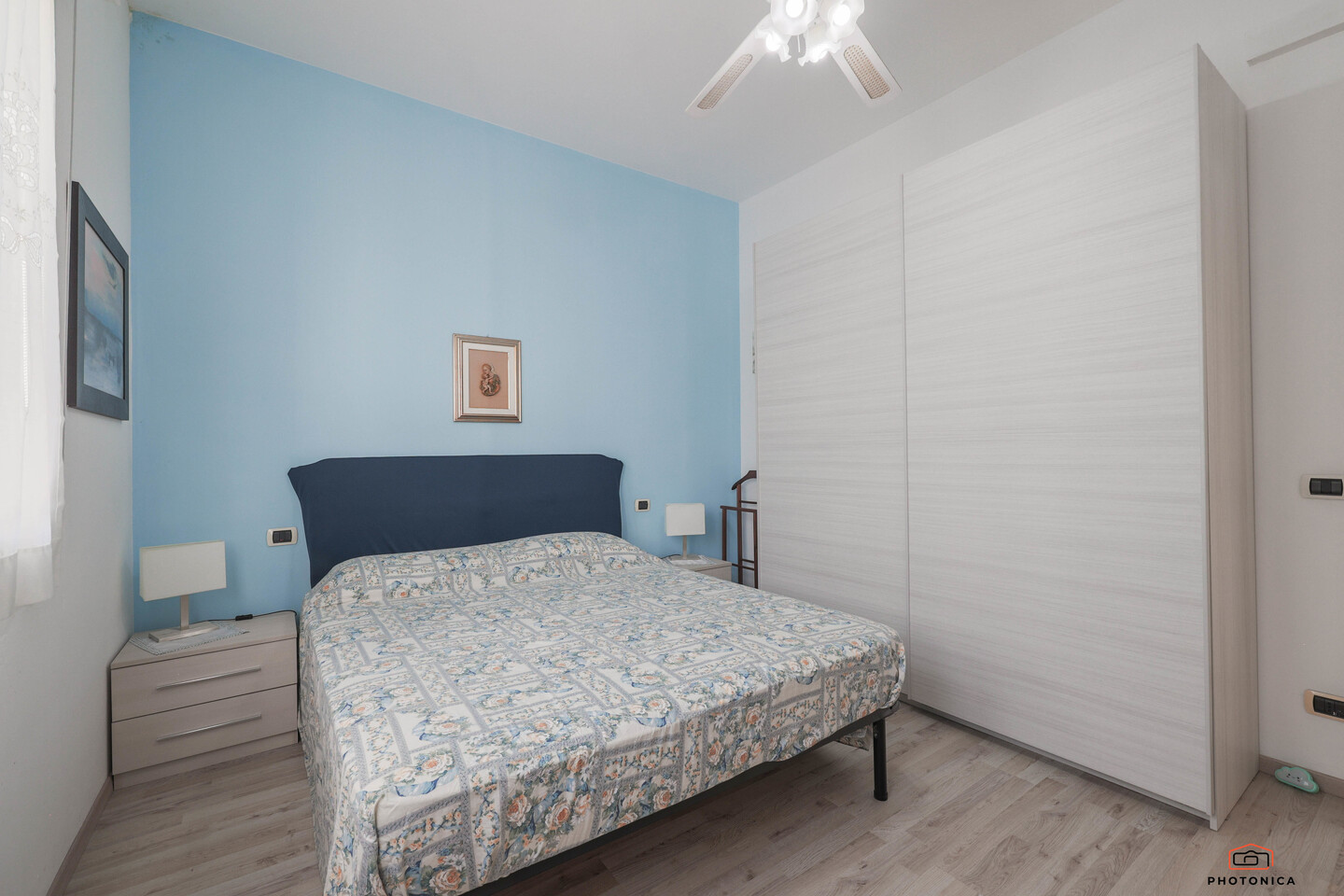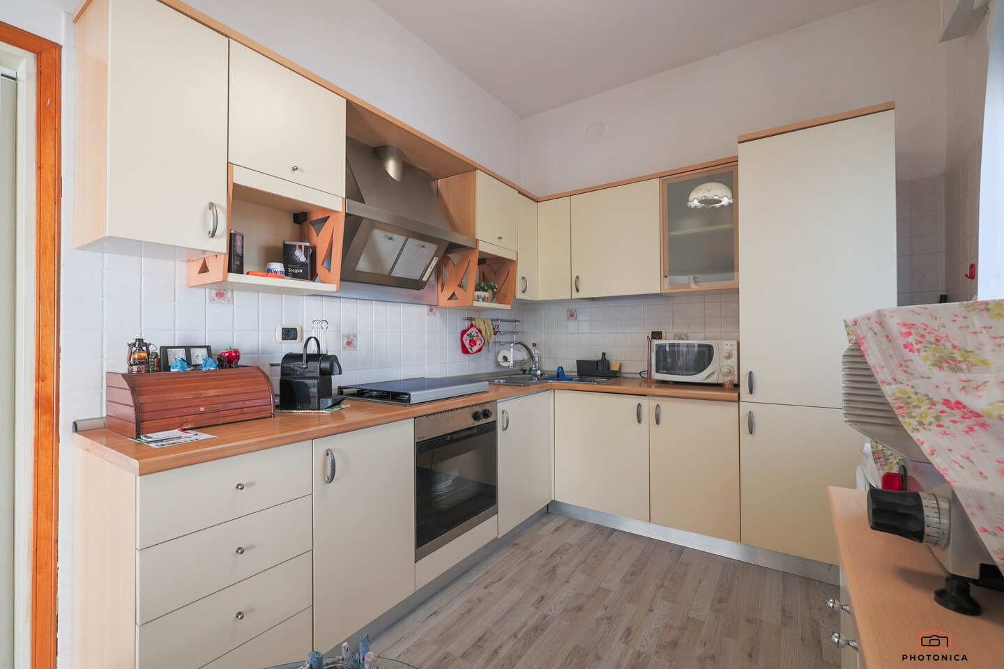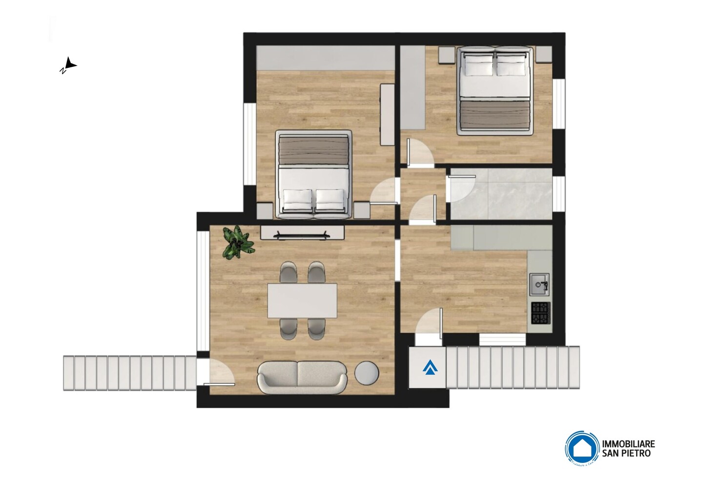 L’abitazione si sviluppa al primo piano con ingresso su luminoso soggiorno, collegato a una cucina separata e abitabile. La zona notte, ben separata, è composta da due camere da letto – una matrimoniale e una singola – oltre a un comodo bagno finestrato.