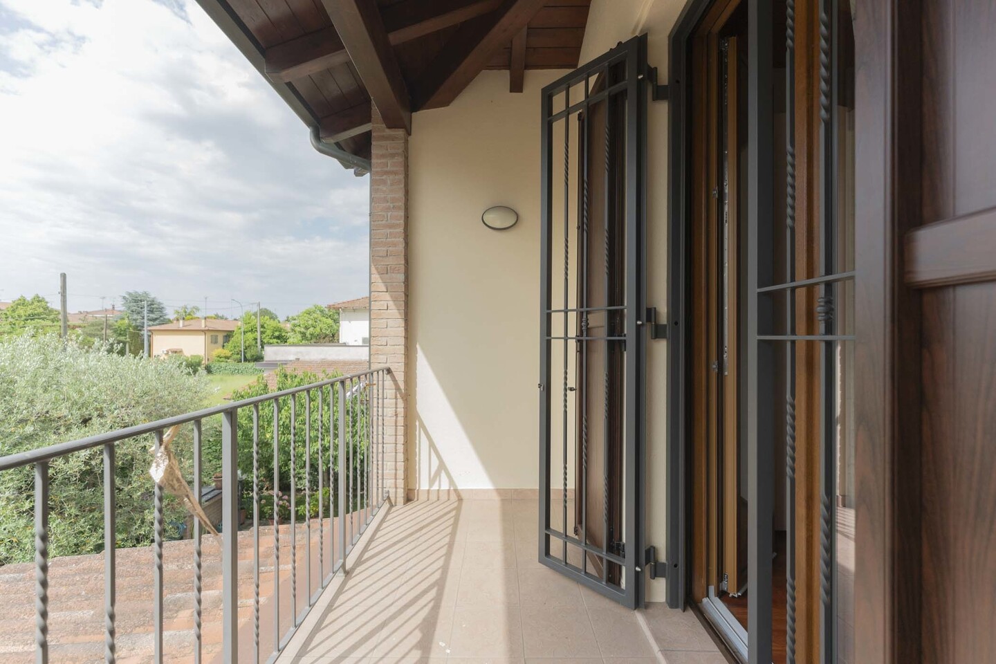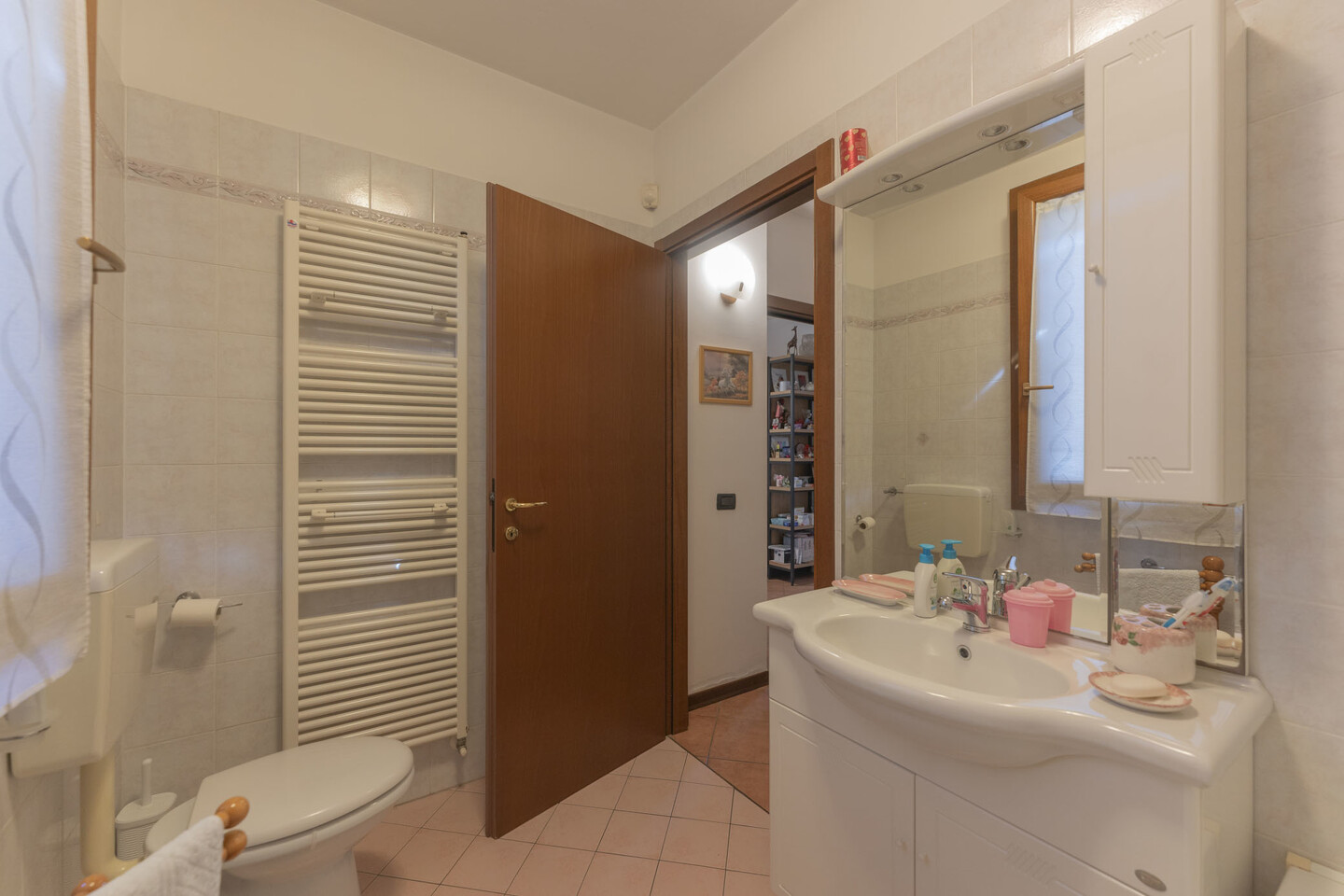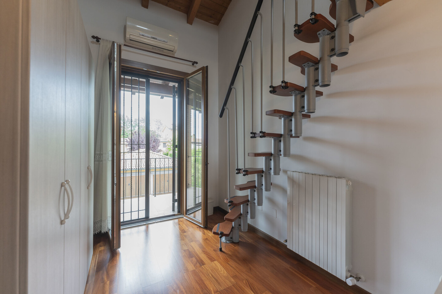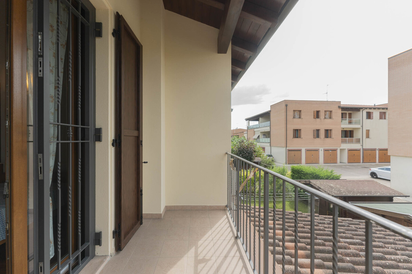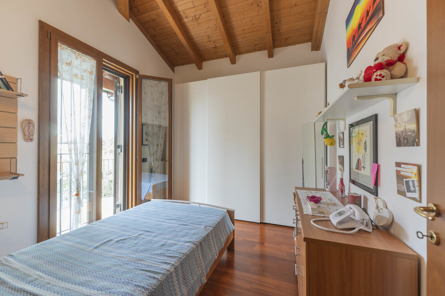 L’immobile è sviluppato su due livelli e così composto: al piano terra ingresso indipendente tramite portico esterno su soggiorno, cucina abitabile, disimpegno e bagno. Una scala conduce al primo piano dove troviamo 3 camere da letto (una matrimoniale, una doppia e una singola con soppalco ad uso studio) da due delle quali è possibile accedere direttamente ai due balconi presenti nell’abitazione ed il secondo bagno. Completano la proprietà garage, cantina, giardino privato, due portici esterni (uno davanti e uno sul retro della casa, quest’ultimo accessibile dalla cucina).