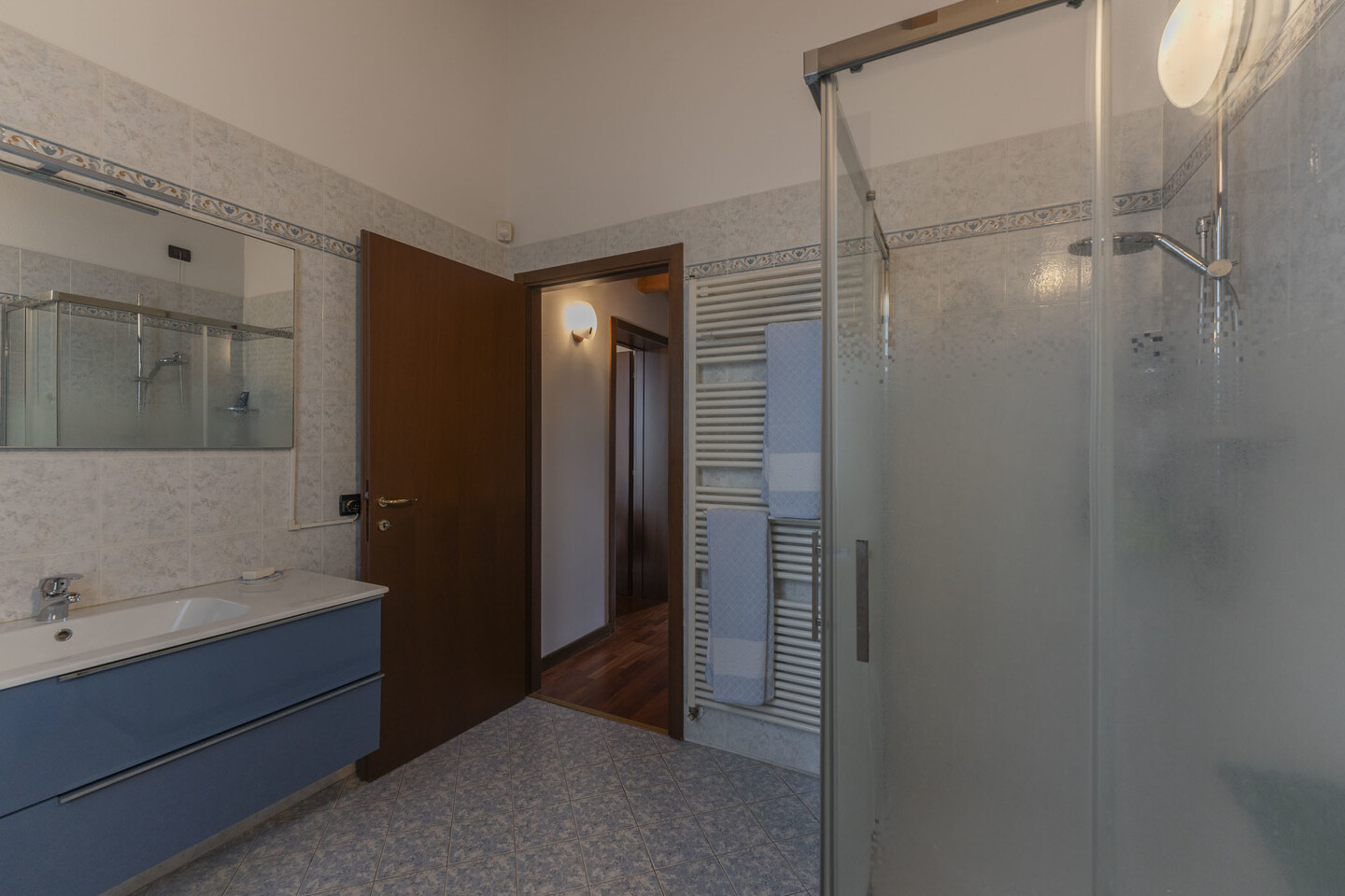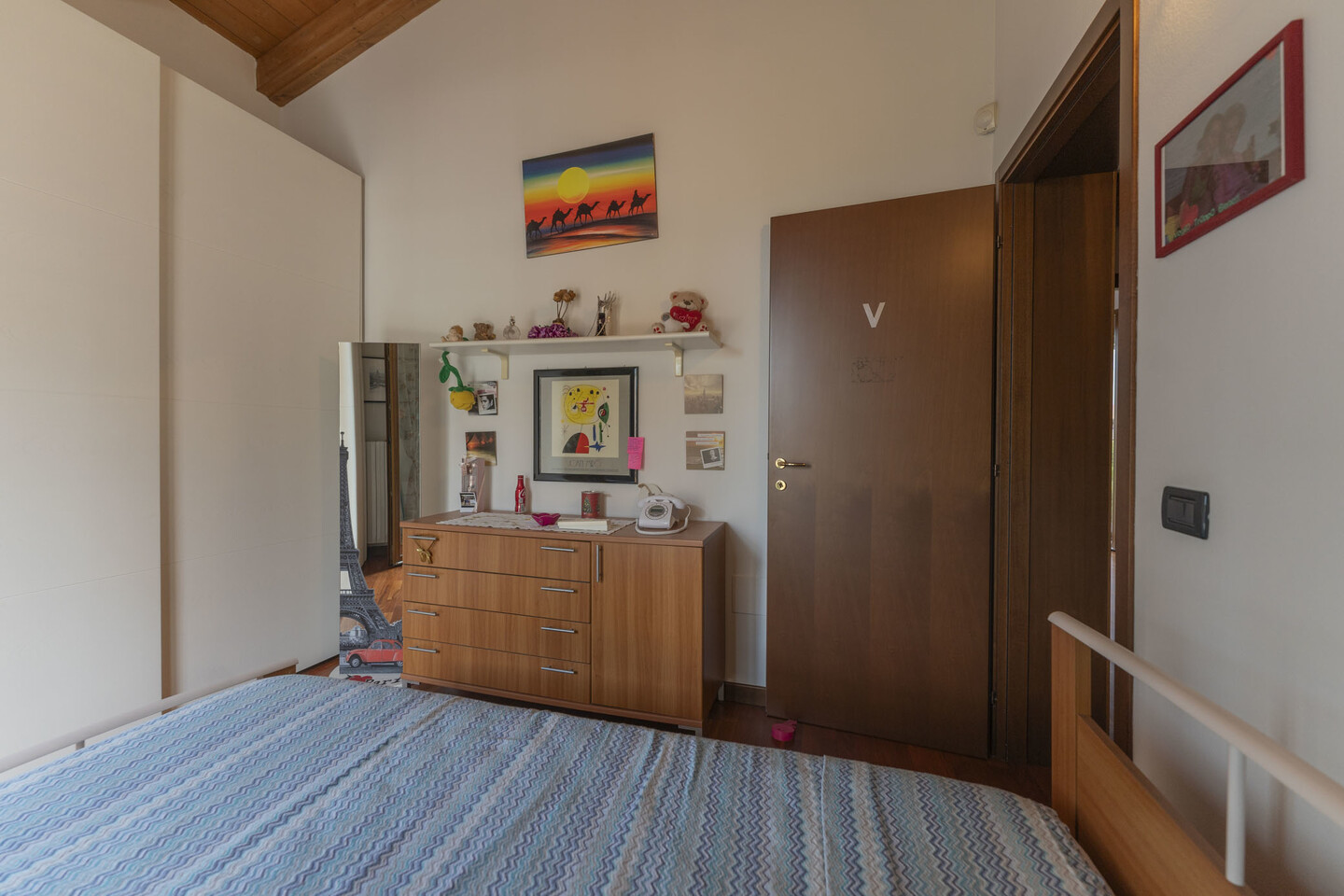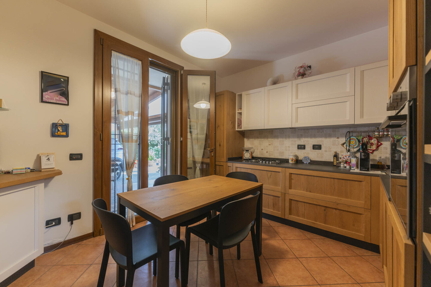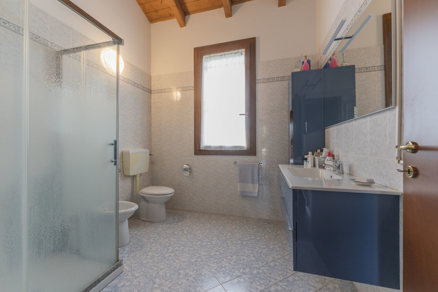 L’immobile è sviluppato su due livelli e così composto: al piano terra ingresso indipendente tramite portico esterno su soggiorno, cucina abitabile, disimpegno e bagno. Una scala conduce al primo piano dove troviamo 3 camere da letto (una matrimoniale, una doppia e una singola con soppalco ad uso studio) da due delle quali è possibile accedere direttamente ai due balconi presenti nell’abitazione ed il secondo bagno. Completano la proprietà garage, cantina, giardino privato, due portici esterni (uno davanti e uno sul retro della casa, quest’ultimo accessibile dalla cucina).
