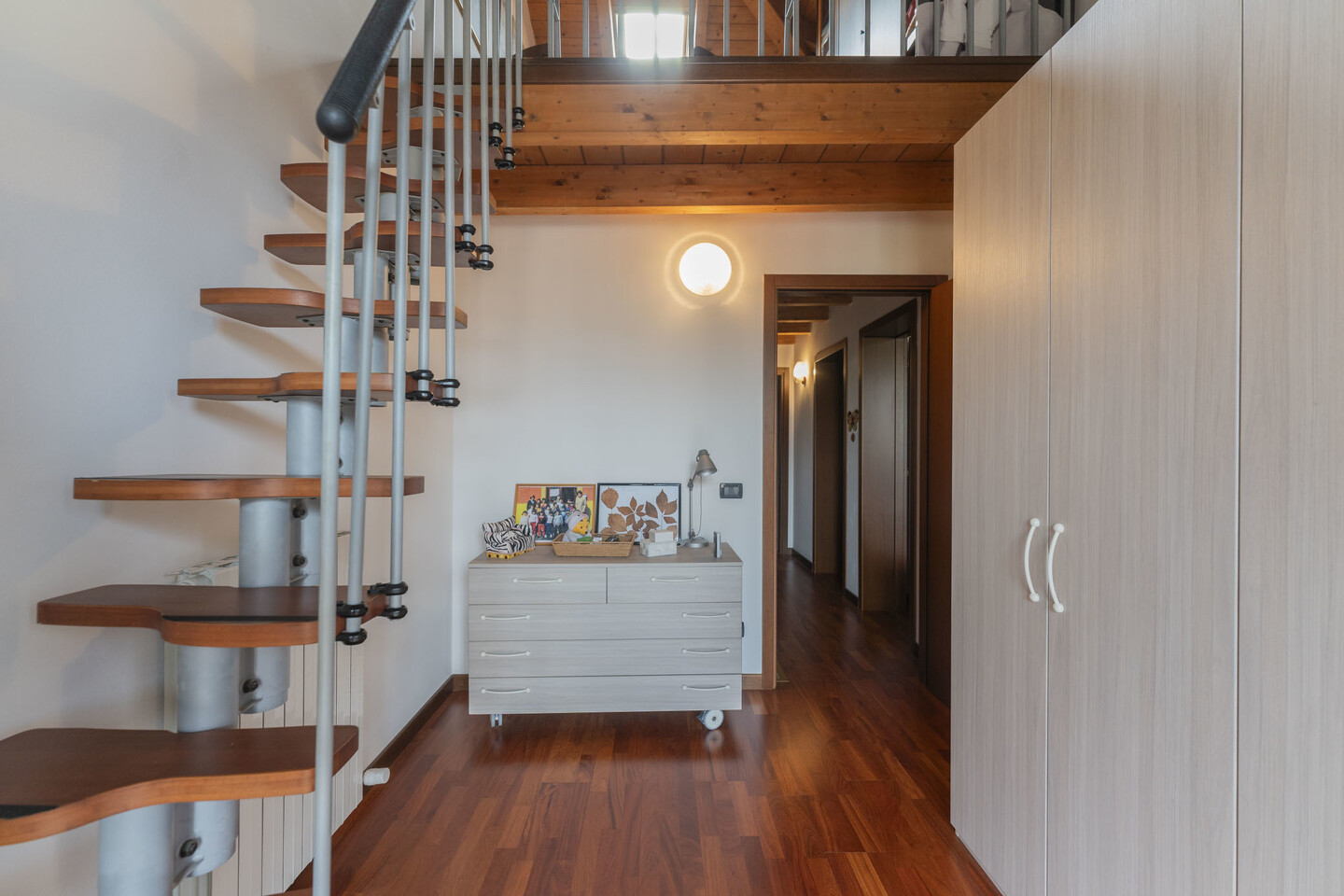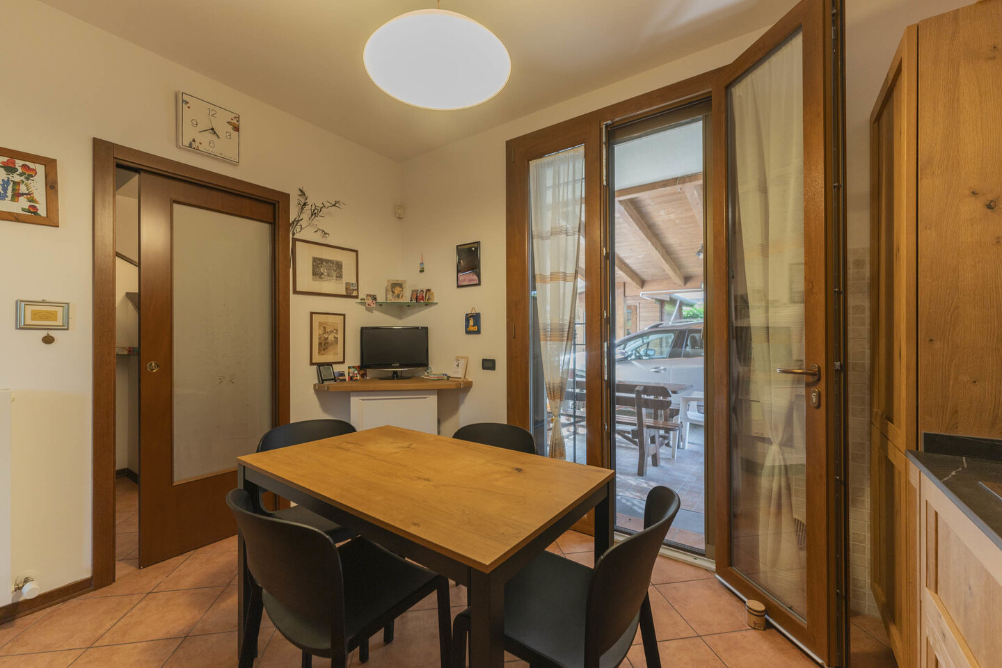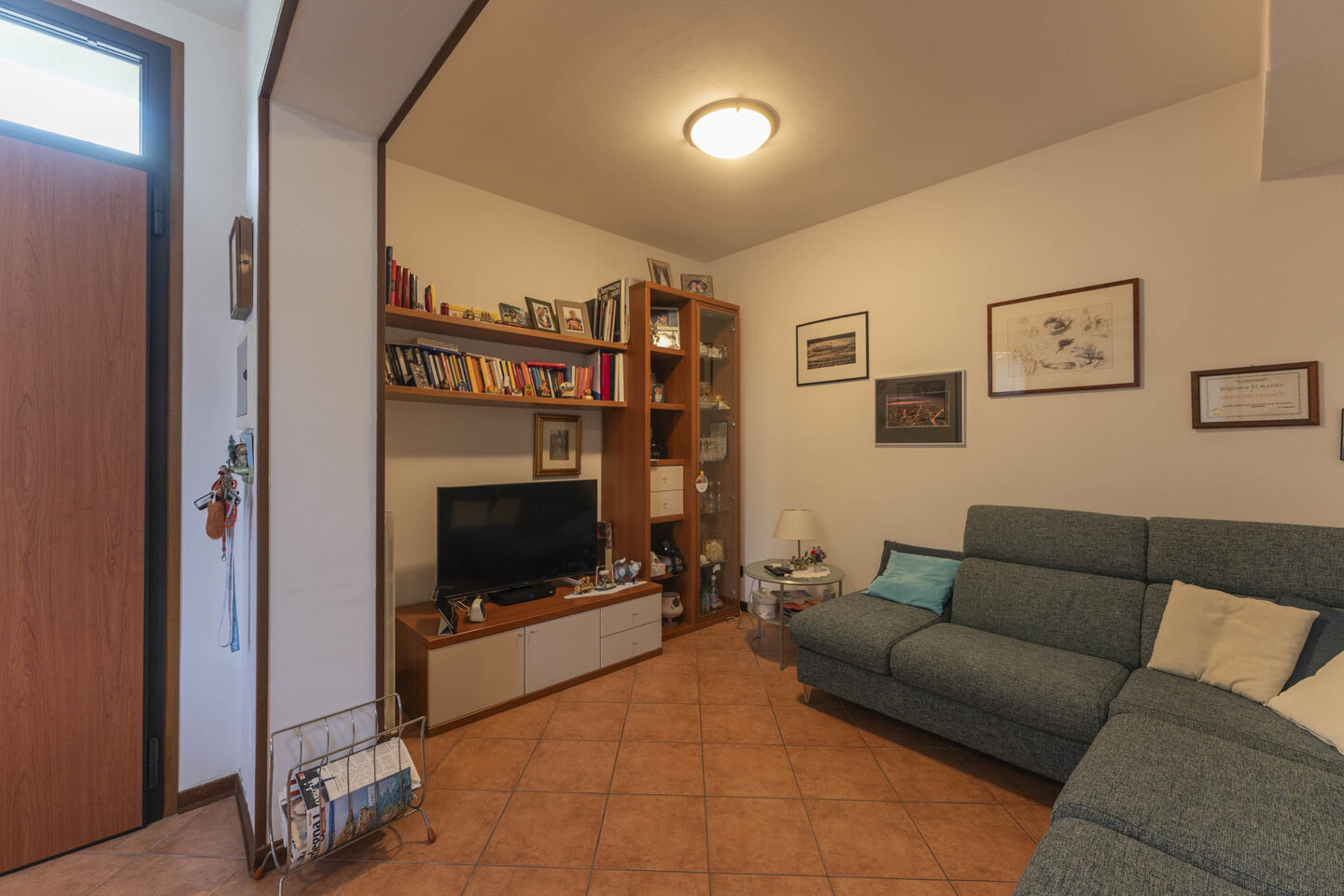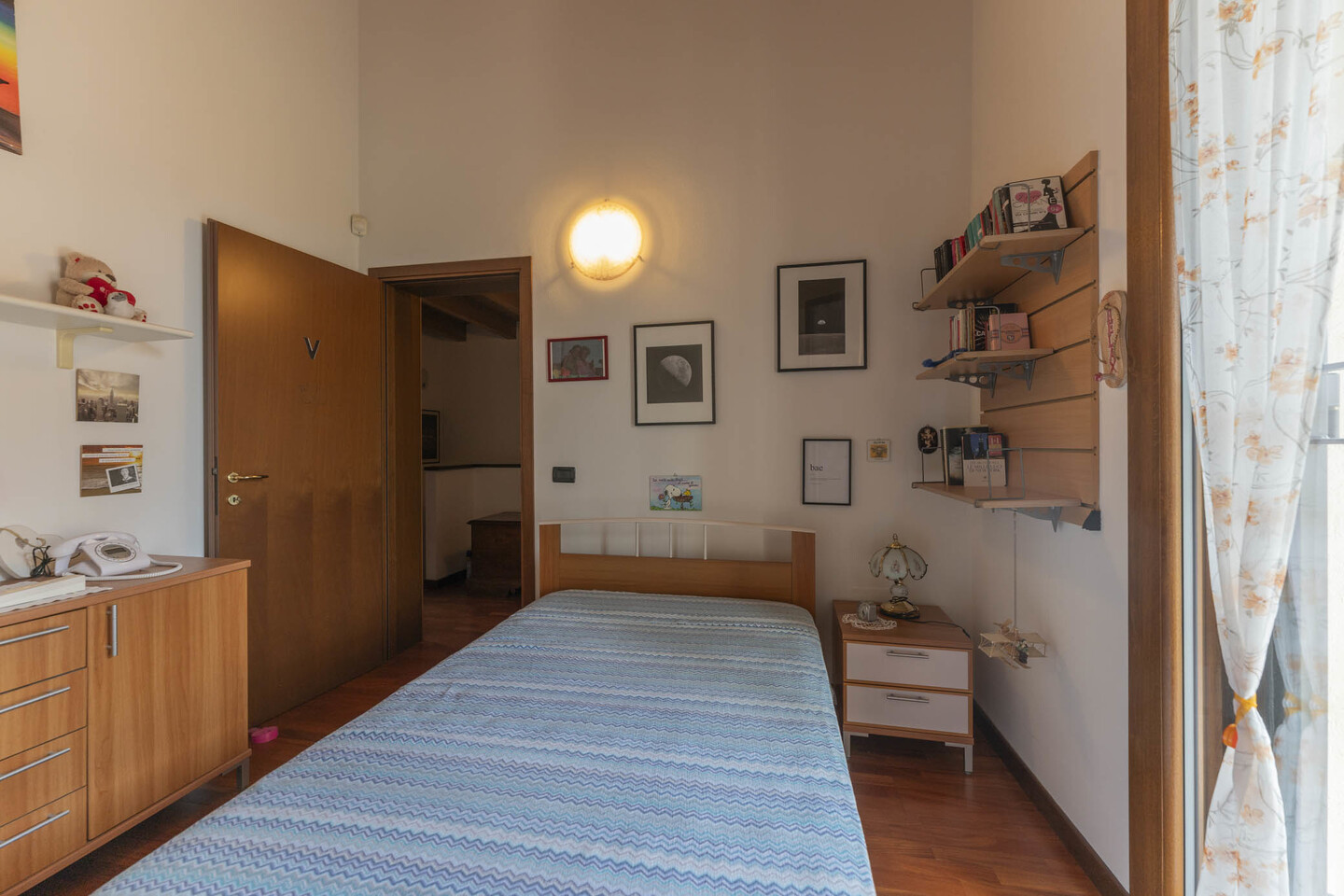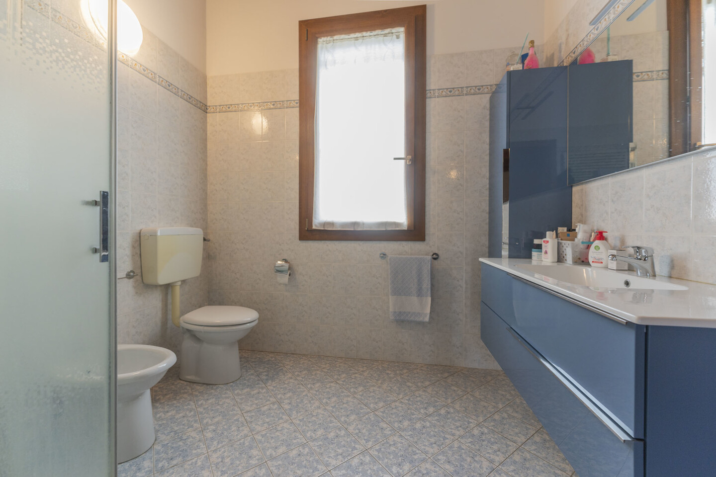 L’immobile è sviluppato su due livelli e così composto: al piano terra ingresso indipendente tramite portico esterno su soggiorno, cucina abitabile, disimpegno e bagno. Una scala conduce al primo piano dove troviamo 3 camere da letto (una matrimoniale, una doppia e una singola con soppalco ad uso studio) da due delle quali è possibile accedere direttamente ai due balconi presenti nell’abitazione ed il secondo bagno. Completano la proprietà garage, cantina, giardino privato, due portici esterni (uno davanti e uno sul retro della casa, quest’ultimo accessibile dalla cucina).