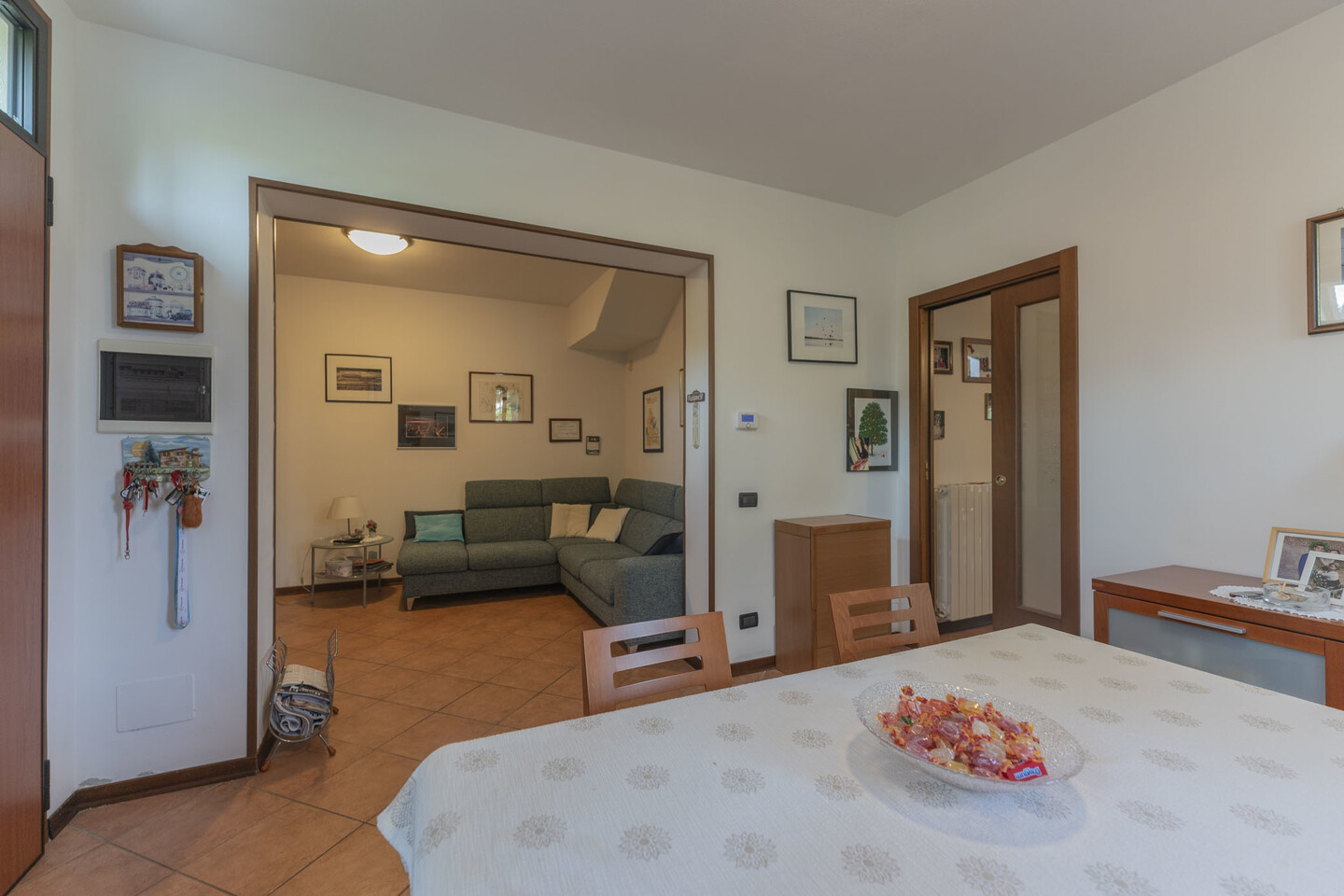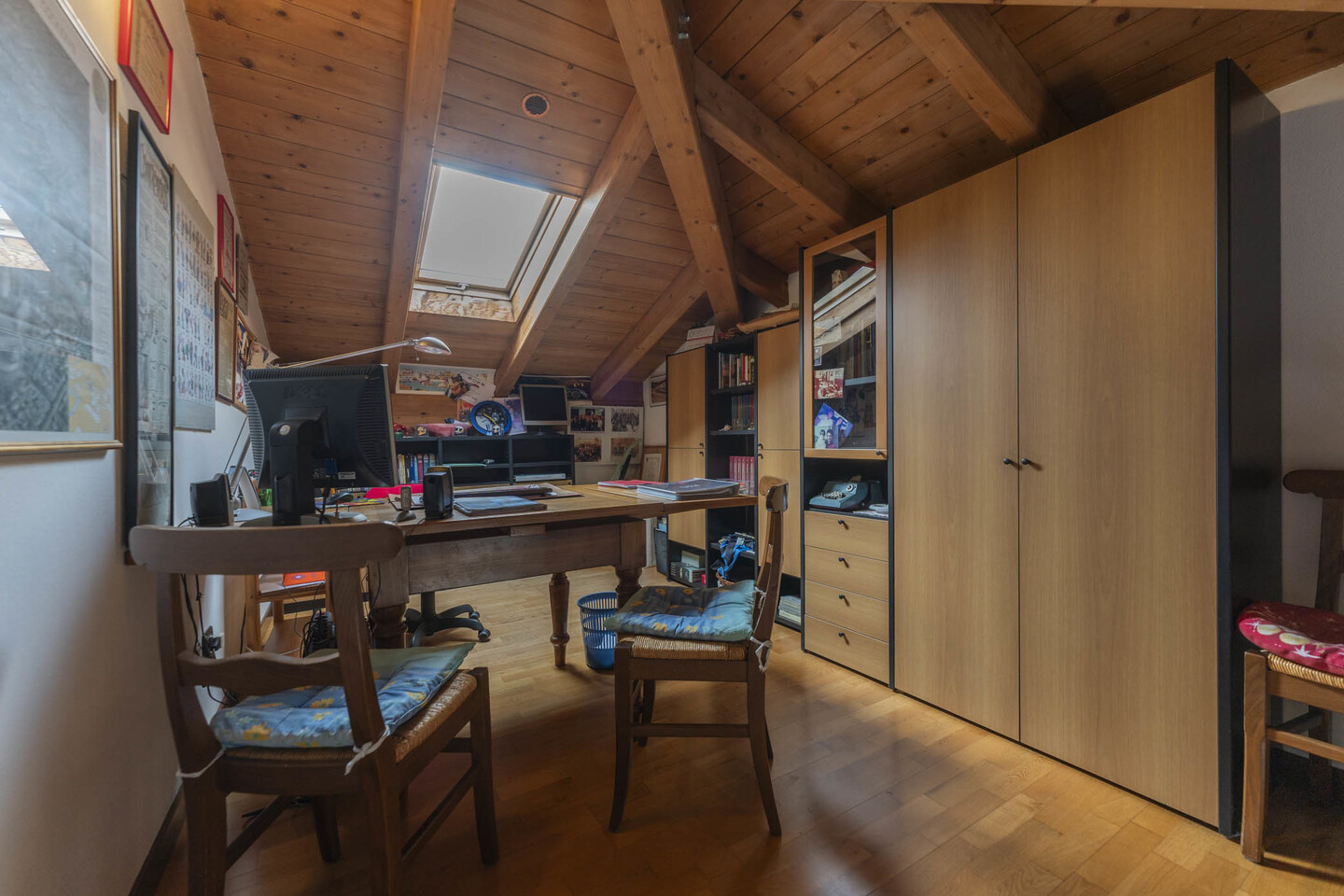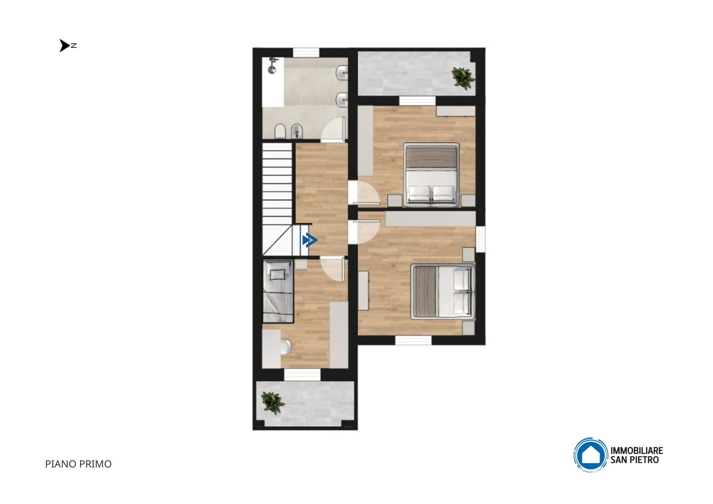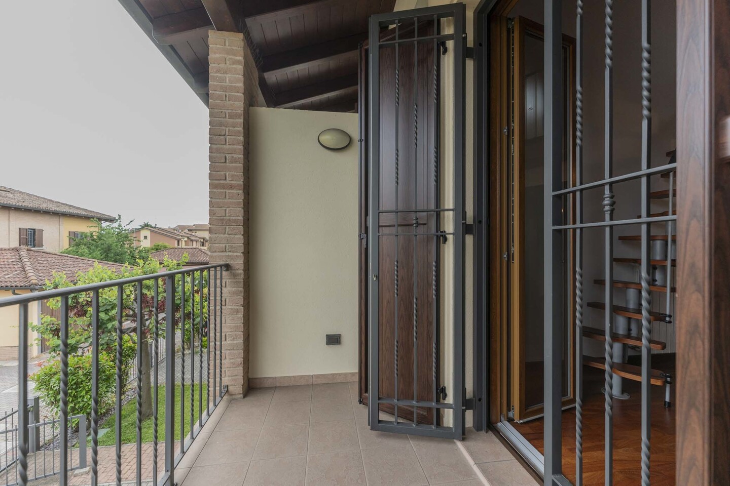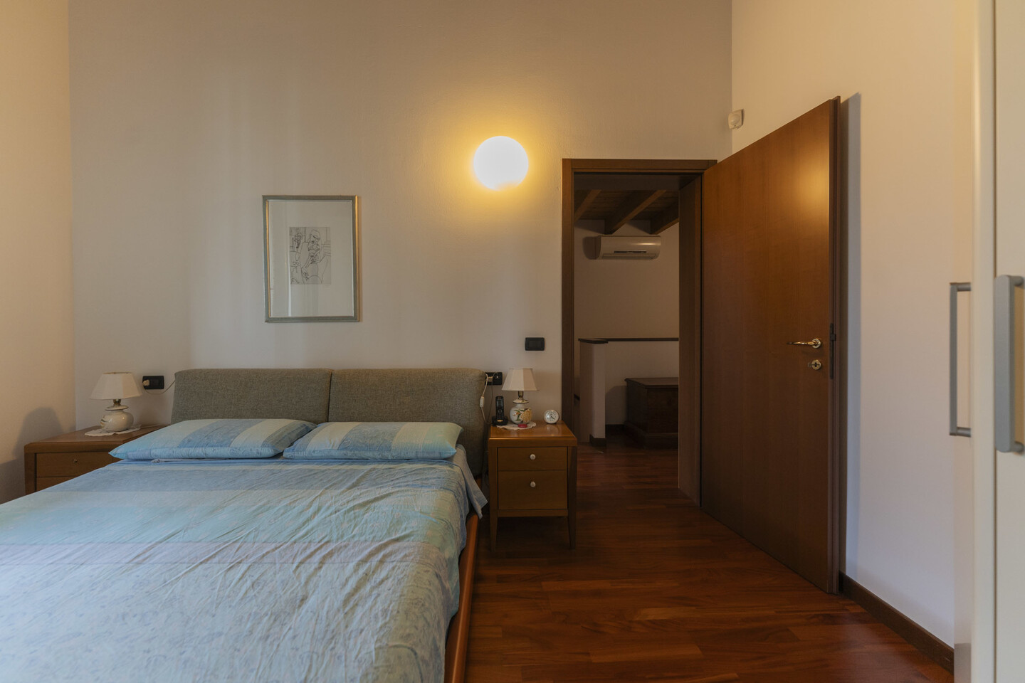 L’immobile è sviluppato su due livelli e così composto: al piano terra ingresso indipendente tramite portico esterno su soggiorno, cucina abitabile, disimpegno e bagno. Una scala conduce al primo piano dove troviamo 3 camere da letto (una matrimoniale, una doppia e una singola con soppalco ad uso studio) da due delle quali è possibile accedere direttamente ai due balconi presenti nell’abitazione ed il secondo bagno. Completano la proprietà garage, cantina, giardino privato, due portici esterni (uno davanti e uno sul retro della casa, quest’ultimo accessibile dalla cucina).
