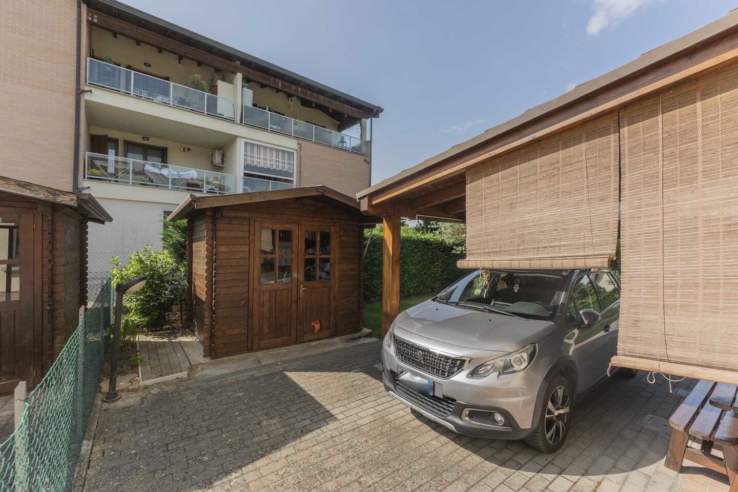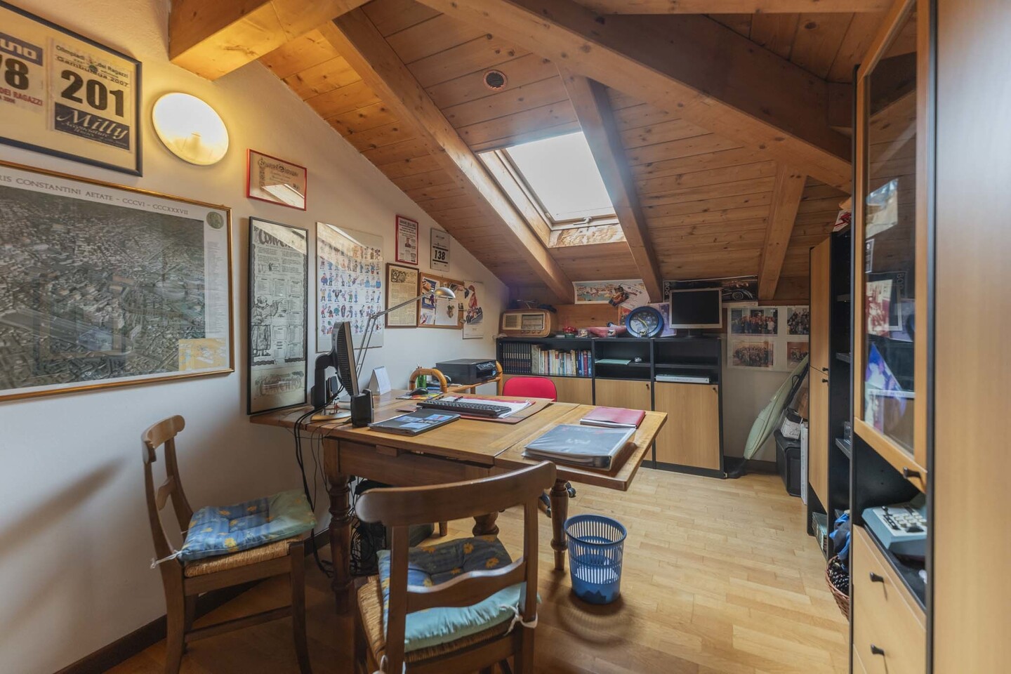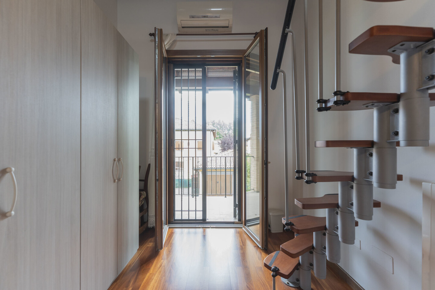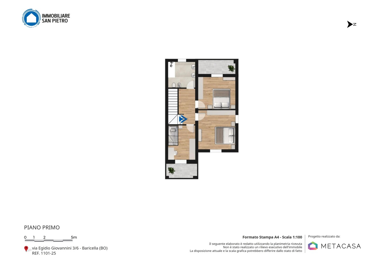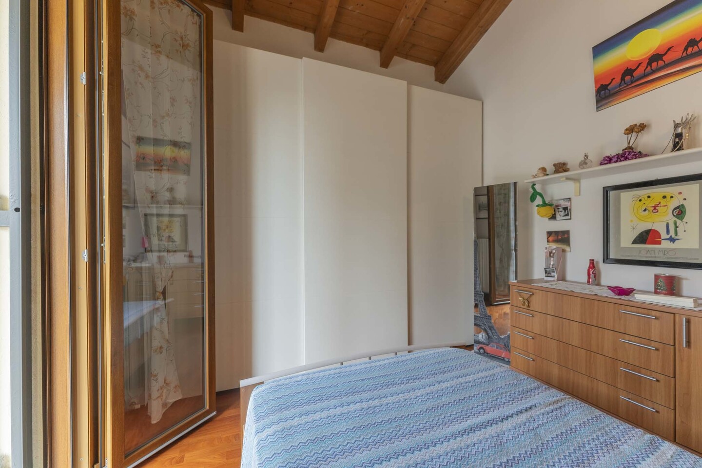 L’immobile è sviluppato su due livelli e così composto: al piano terra ingresso indipendente tramite portico esterno su soggiorno, cucina abitabile, disimpegno e bagno. Una scala conduce al primo piano dove troviamo 3 camere da letto (una matrimoniale, una doppia e una singola con soppalco ad uso studio) da due delle quali è possibile accedere direttamente ai due balconi presenti nell’abitazione ed il secondo bagno. Completano la proprietà garage, cantina, giardino privato, due portici esterni (uno davanti e uno sul retro della casa, quest’ultimo accessibile dalla cucina).