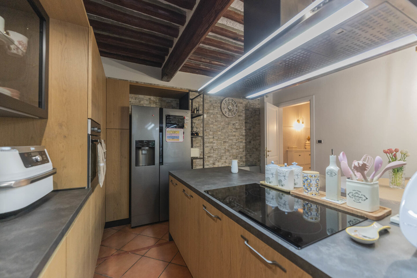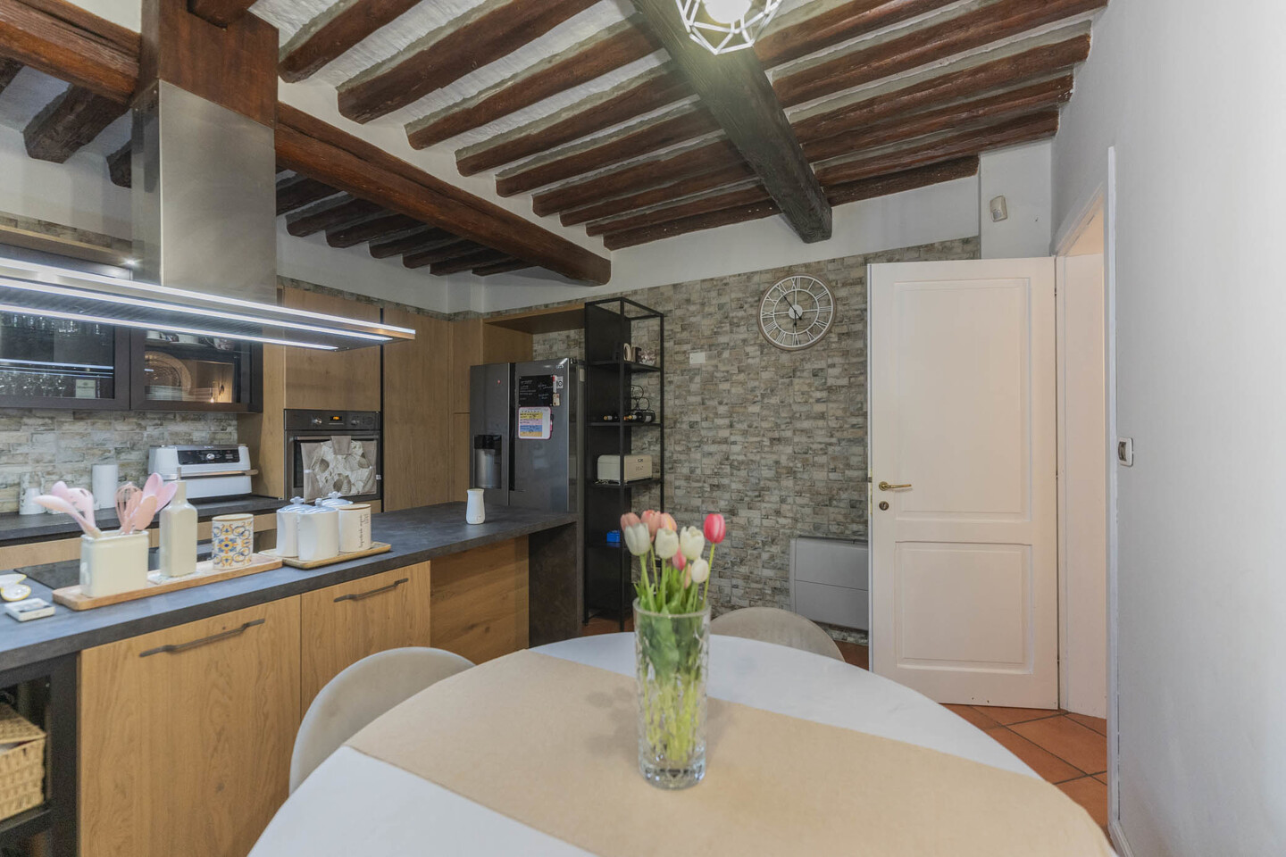 Al piano terra si apre un ampio soggiorno con camino, cucina abitabile con isola completamente arredata e completa di elettrodomestici, ripostiglio e bagno finestrato.