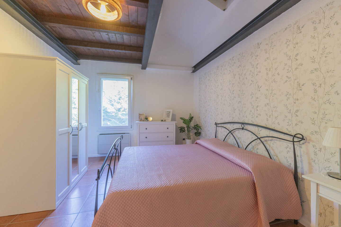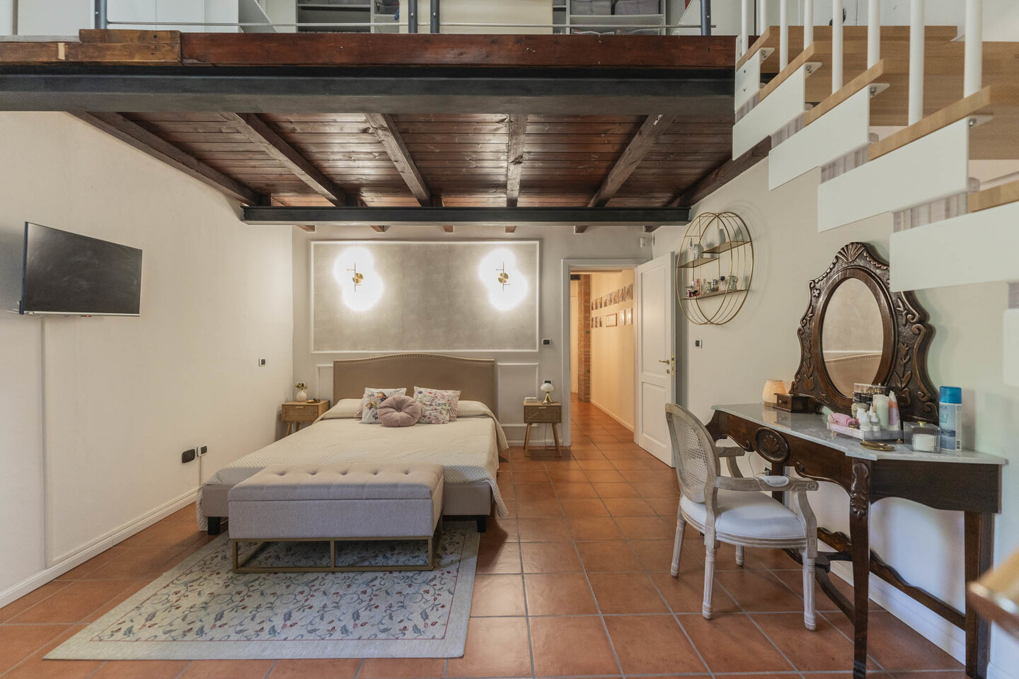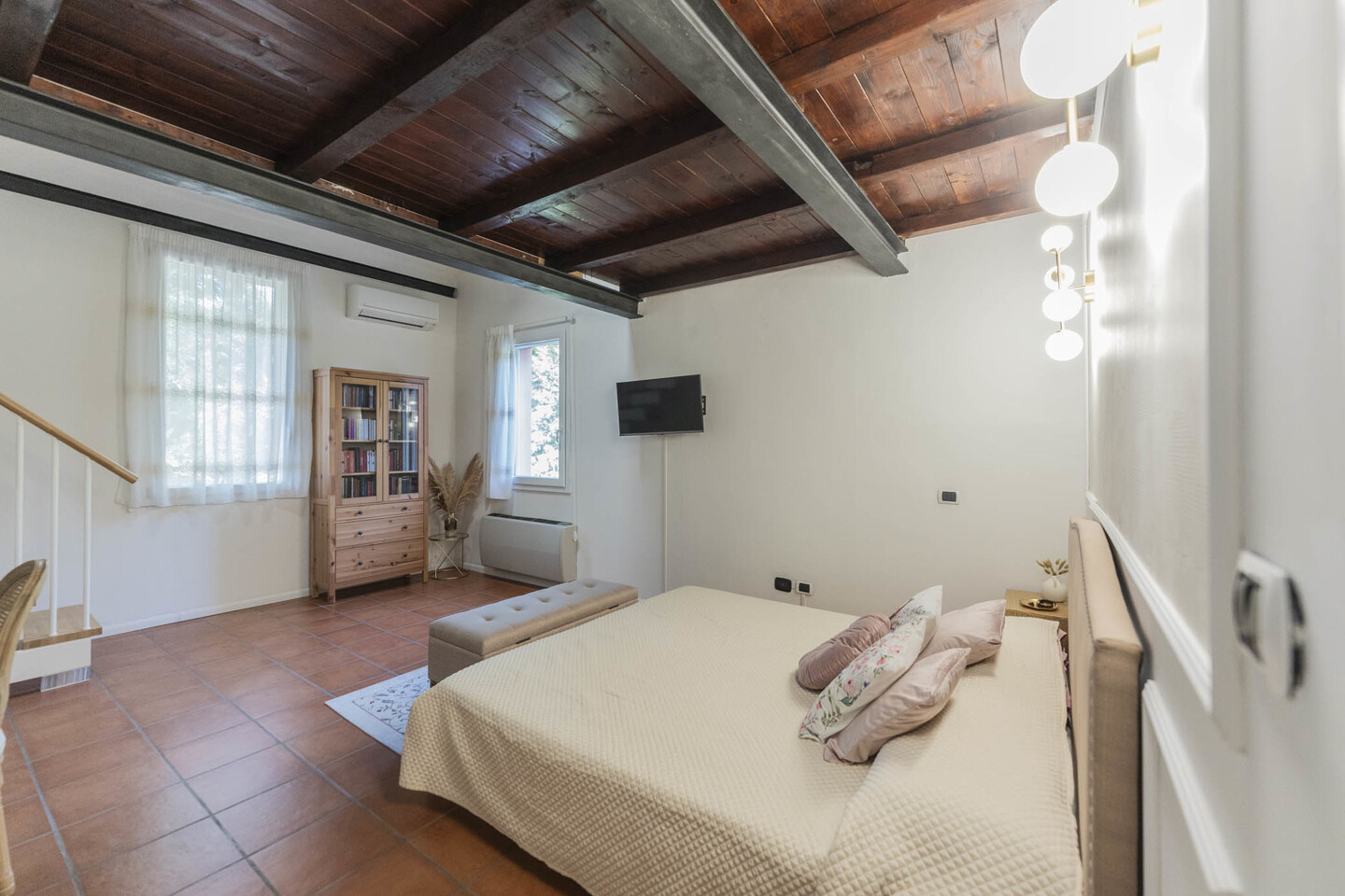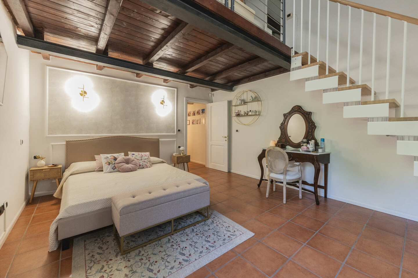 La scala interna conduce al primo piano con due camere matrimoniali: la principale con soppalco e cabina armadio su misura, la seconda ampia e ben organizzabile. Completano il livello un secondo bagno e un ulteriore ripostiglio.