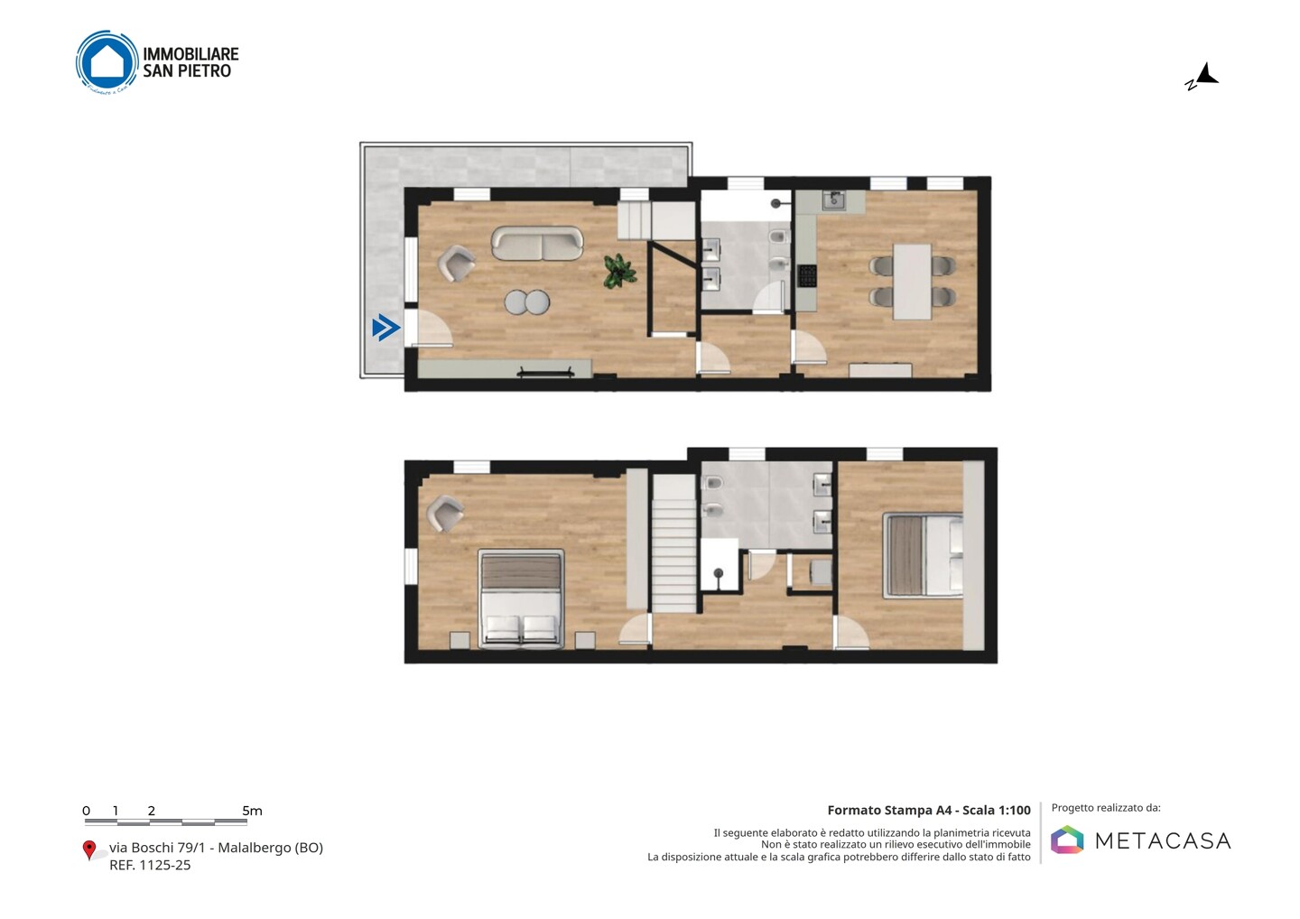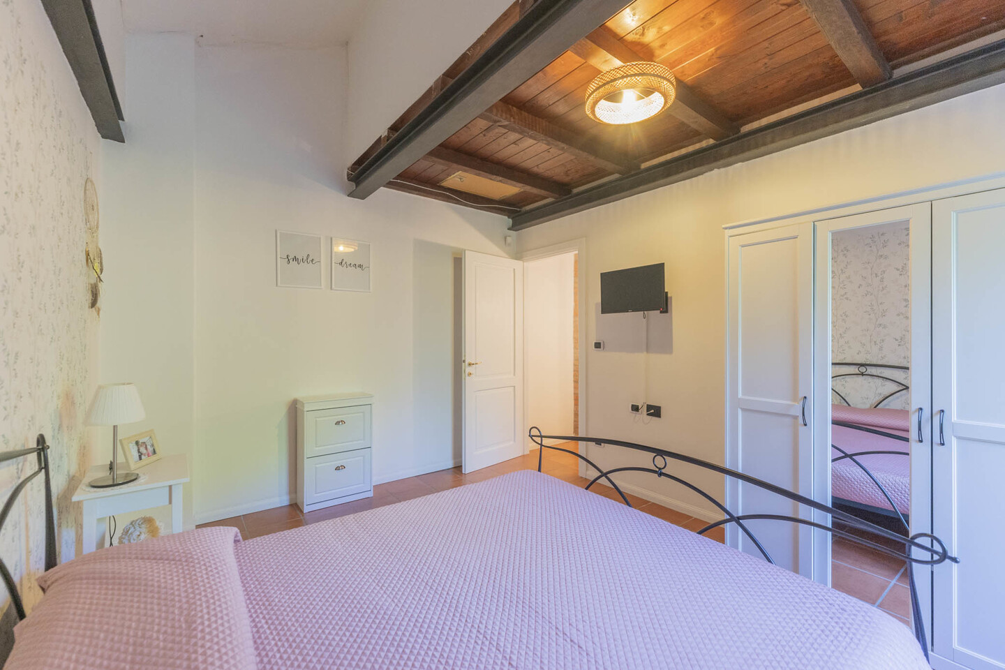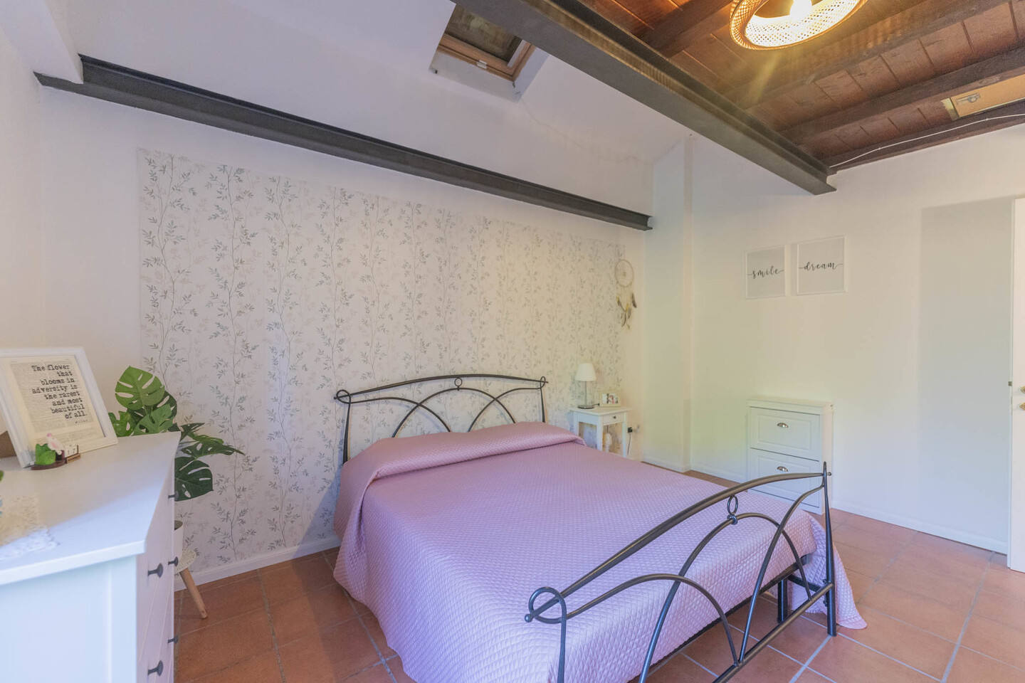 La scala interna conduce al primo piano con due camere matrimoniali: la principale con soppalco e cabina armadio su misura, la seconda ampia e ben organizzabile. Completano il livello un secondo bagno e un ulteriore ripostiglio.