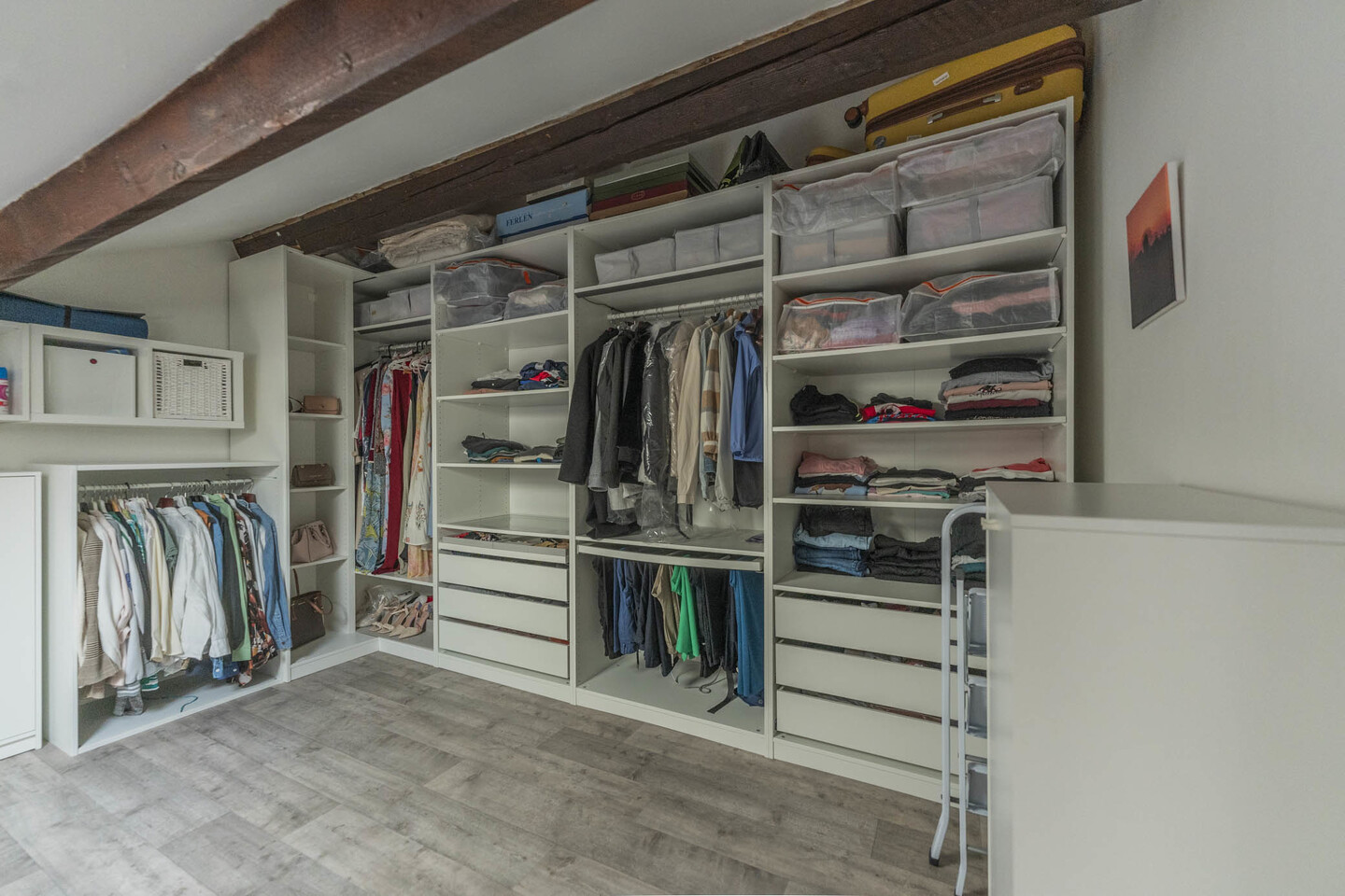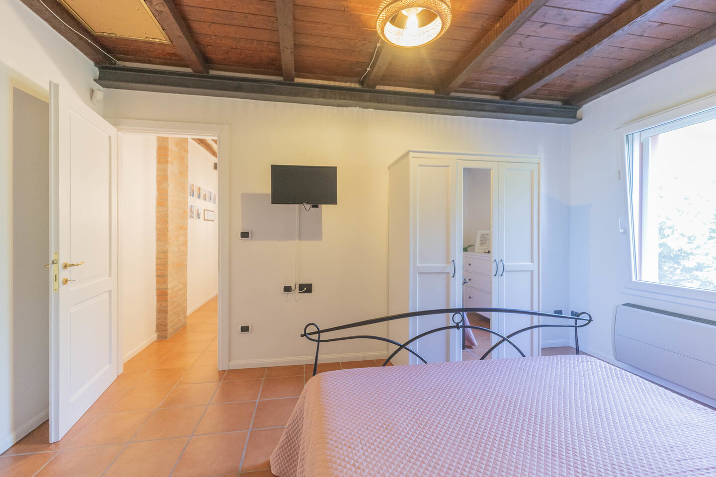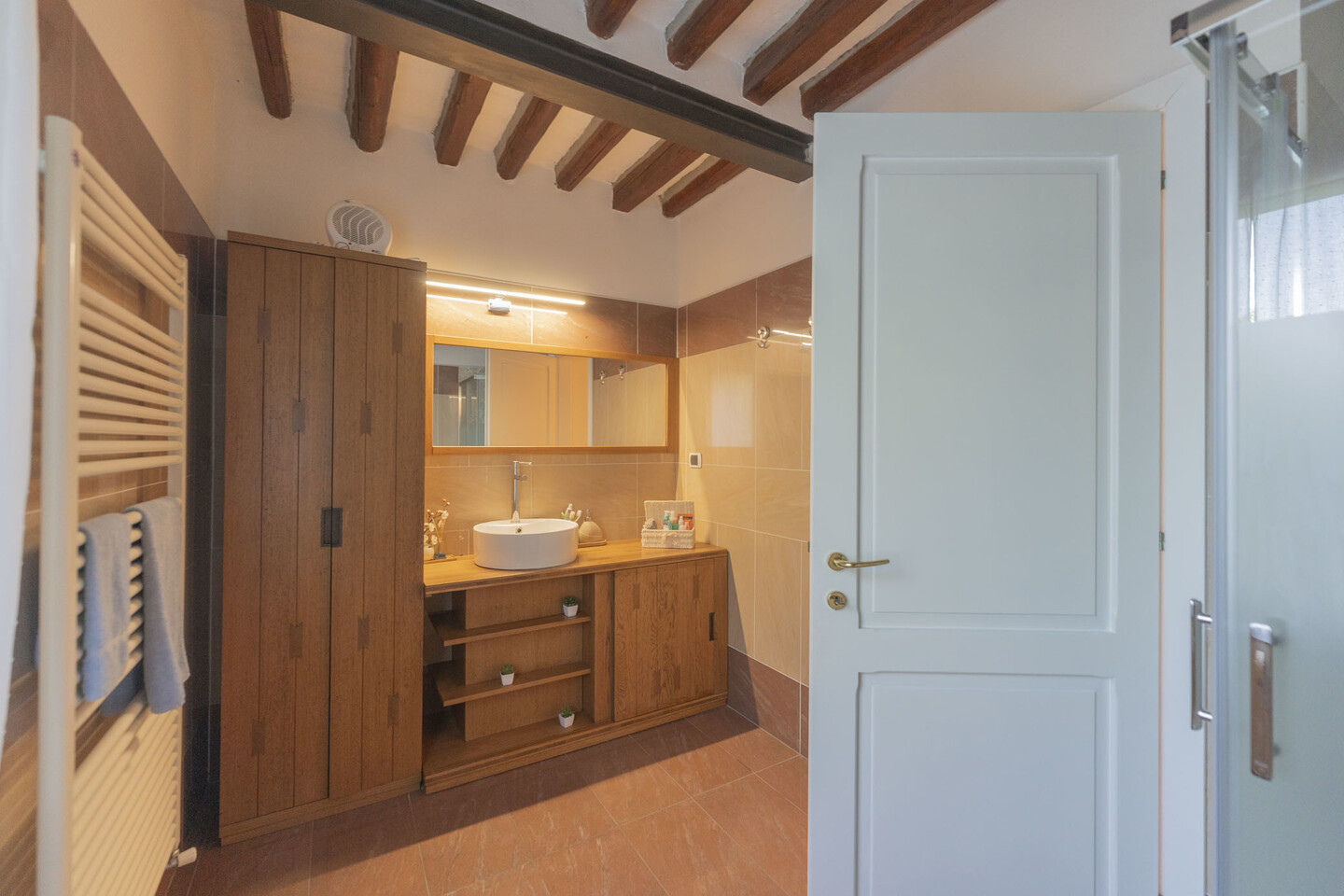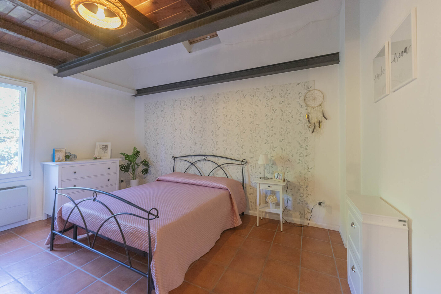 La scala interna conduce al primo piano con due camere matrimoniali: la principale con soppalco e cabina armadio su misura, la seconda ampia e ben organizzabile. Completano il livello un secondo bagno e un ulteriore ripostiglio.
