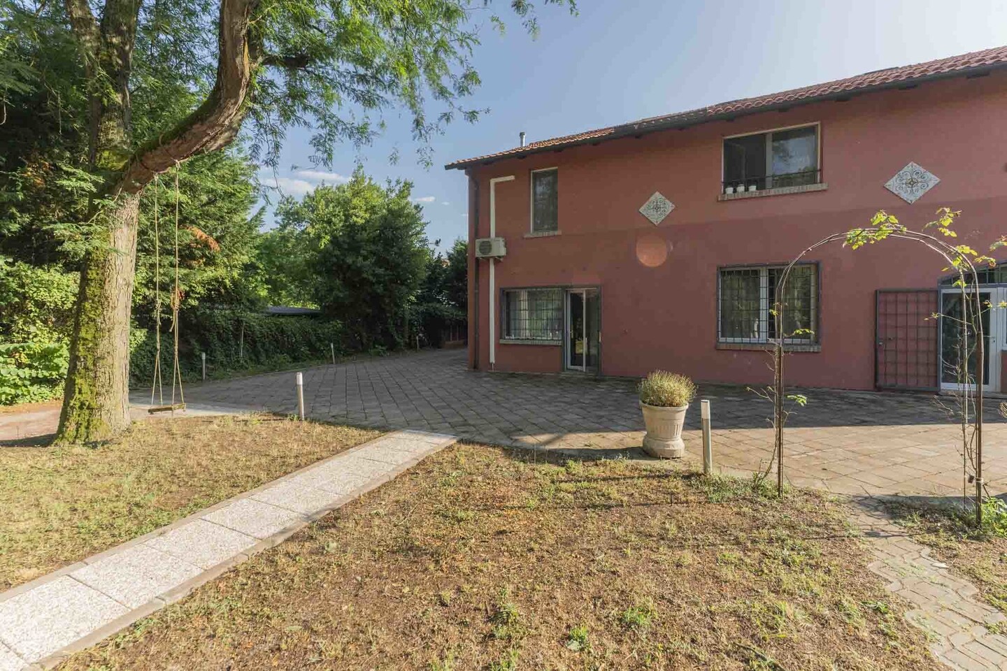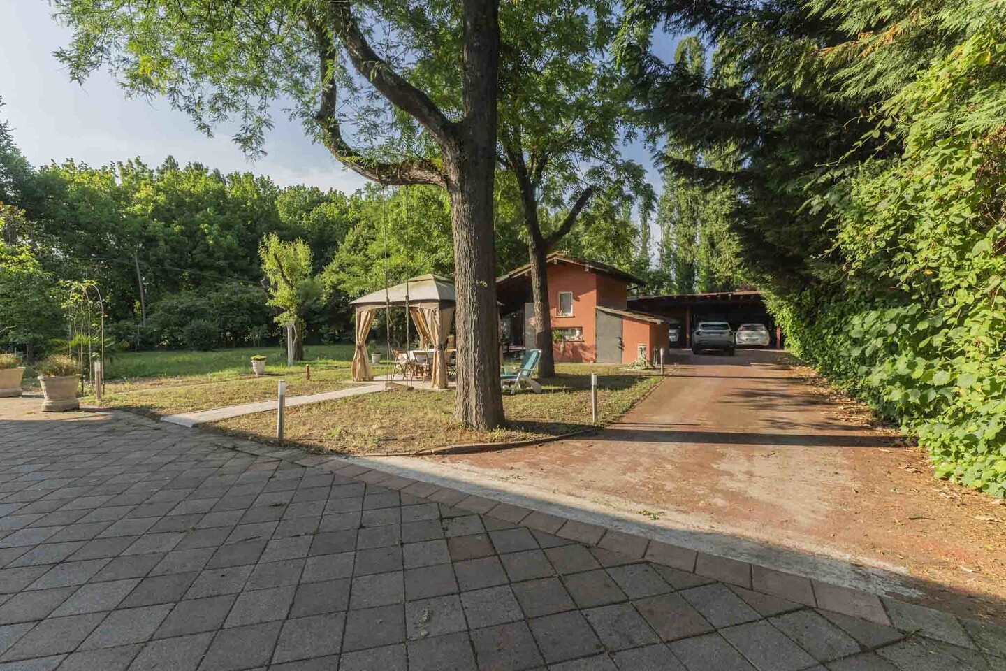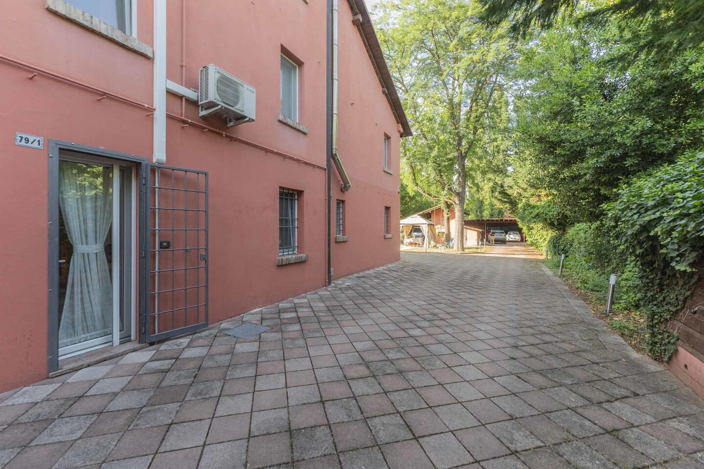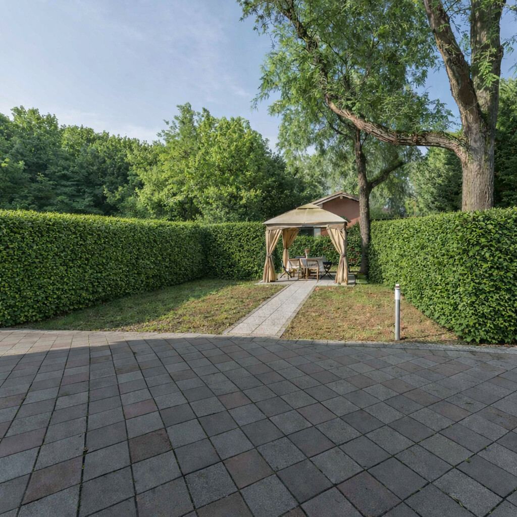 All’esterno, corte esclusiva di circa 110 mq, ideale per relax e zona pranzo. Presente anche un posto auto coperto per due vetture e una zona pavimentata comune (corsello carraio e area di manovra) condivisa in modo ordinato con l’altra unità.