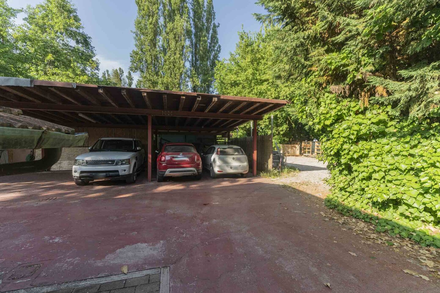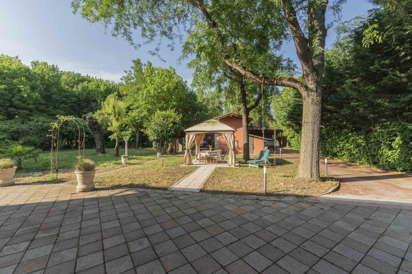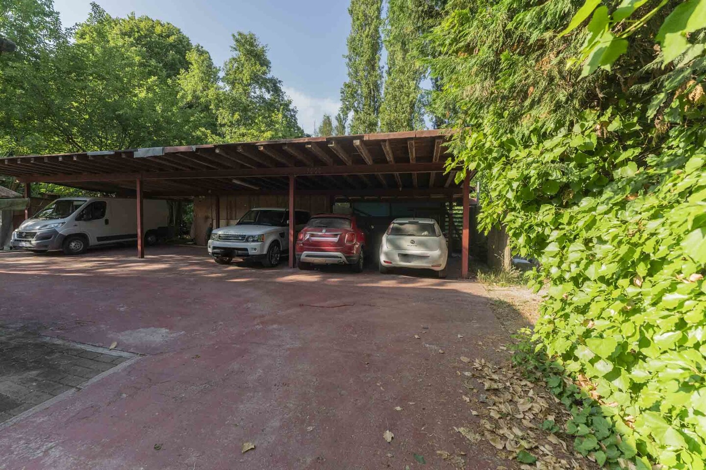All’esterno, corte esclusiva di circa 110 mq, ideale per relax e zona pranzo. Presente anche un posto auto coperto per due vetture e una zona pavimentata comune (corsello carraio e area di manovra) condivisa in modo ordinato con l’altra unità.