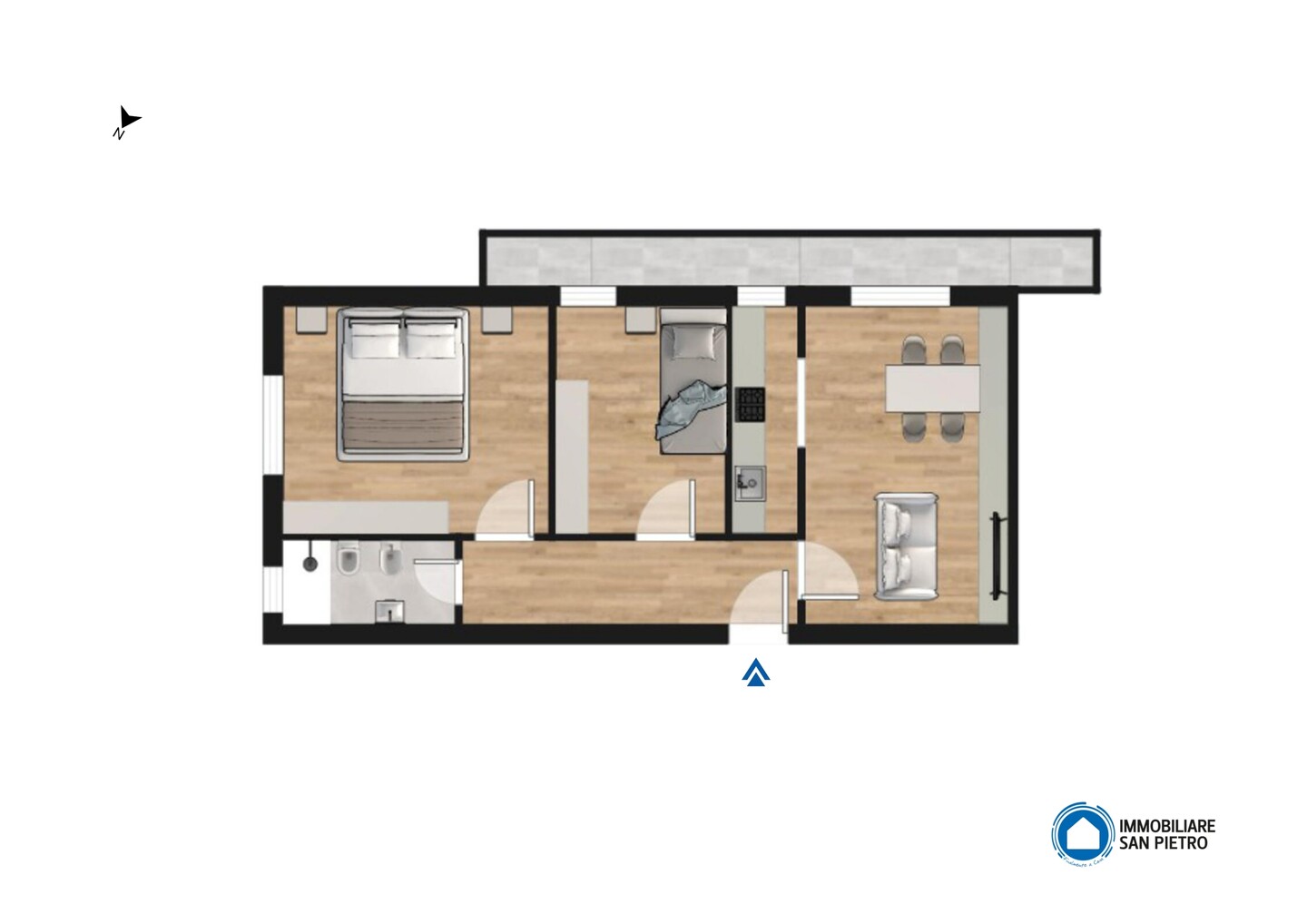 Appartamento al primo ed ultimo piano composto da ingresso, soggiorno con angolo cottura e balcone, disimpegno, 2 camere da letto, bagno e cantina al piano terra.
