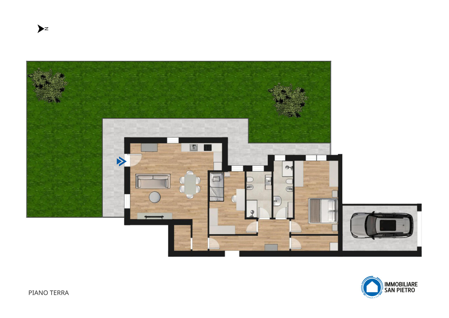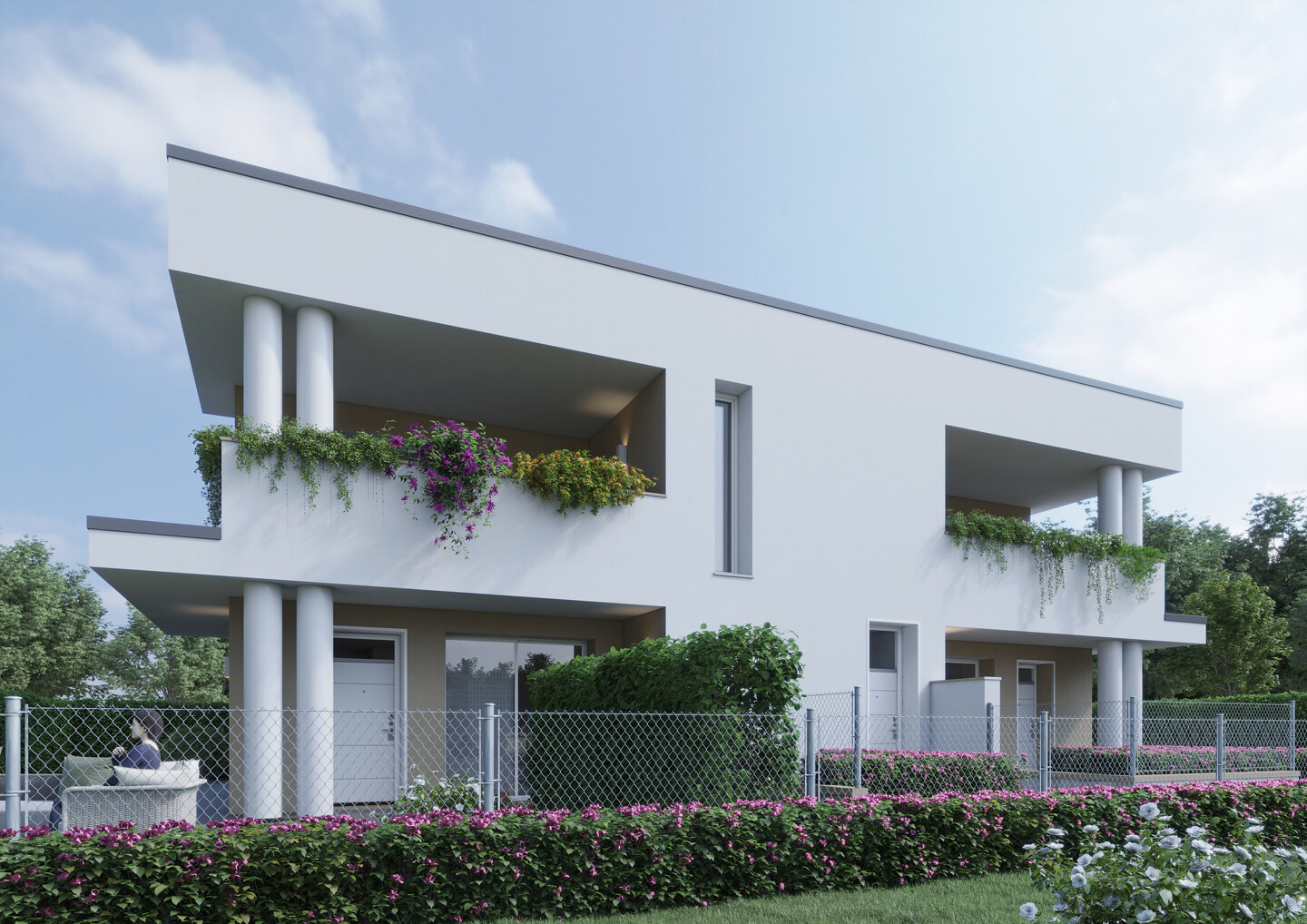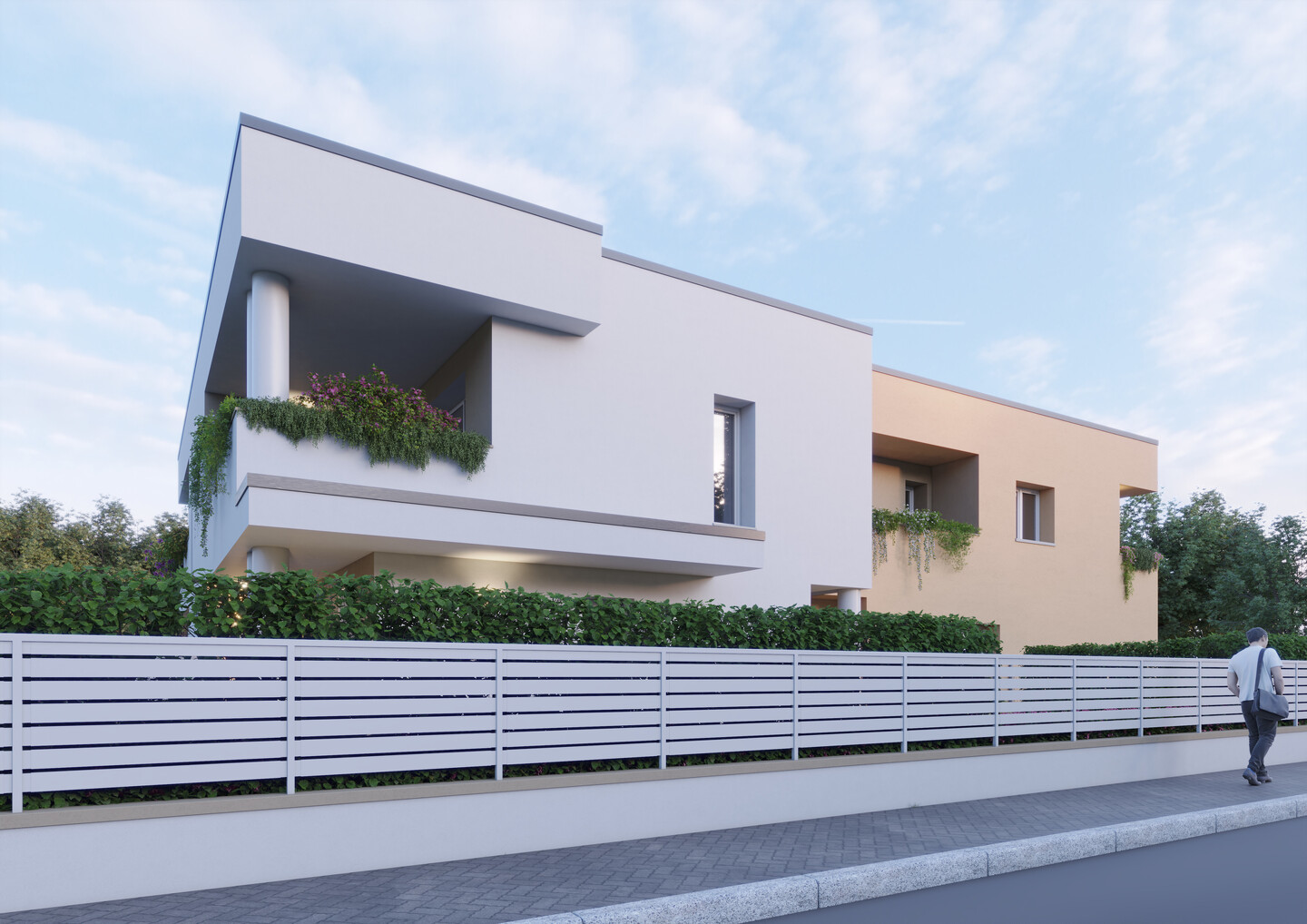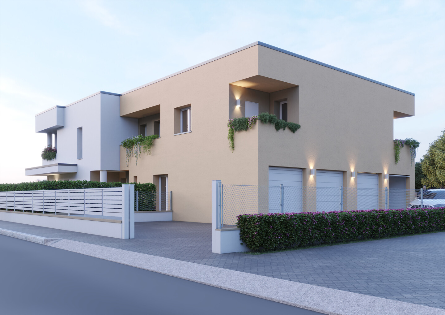 Appartamento posto al piano terra con giardino privato, così composto: ingresso indipendente su zona living con cucina a vista, vano tecnico, disimpegno, camera matrimoniale, camera doppia e 2 bagni.