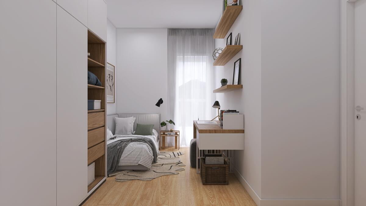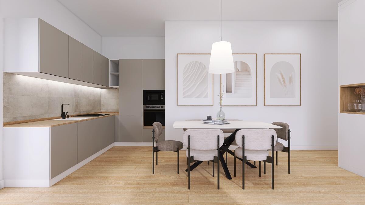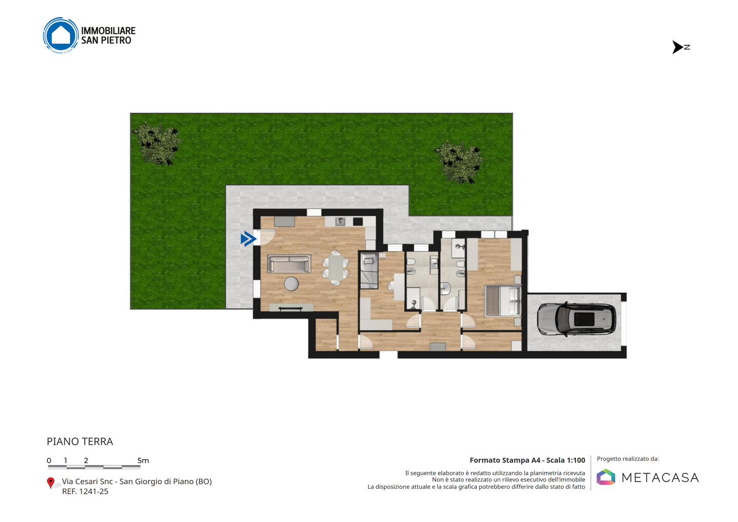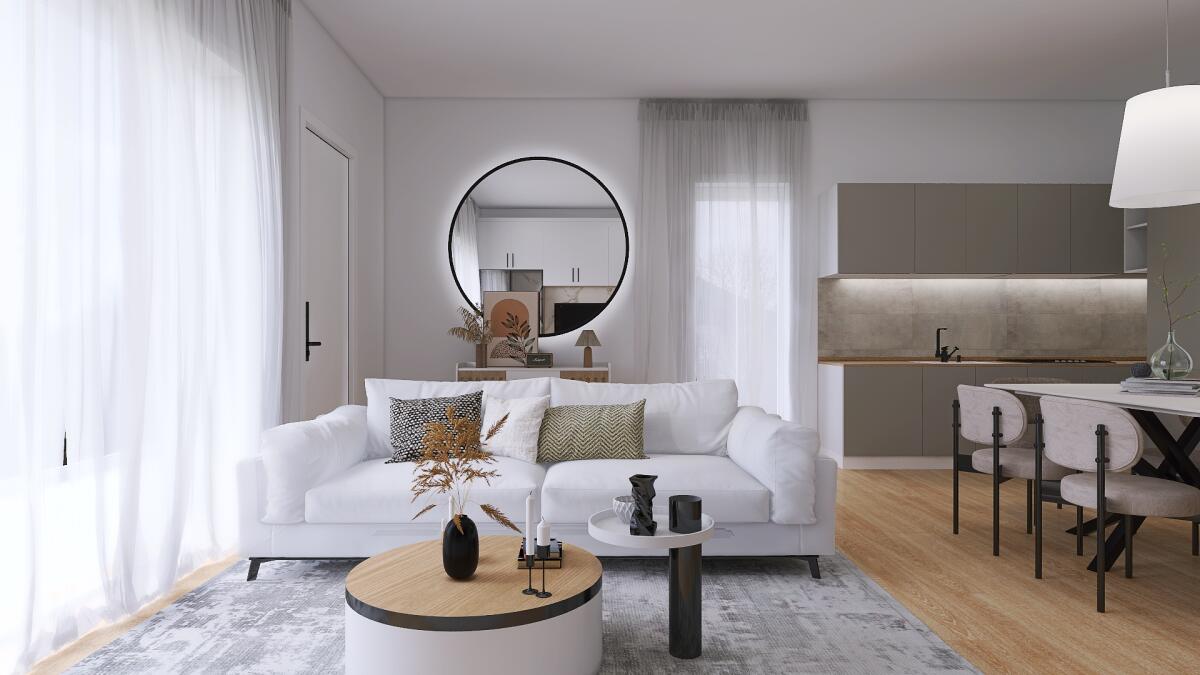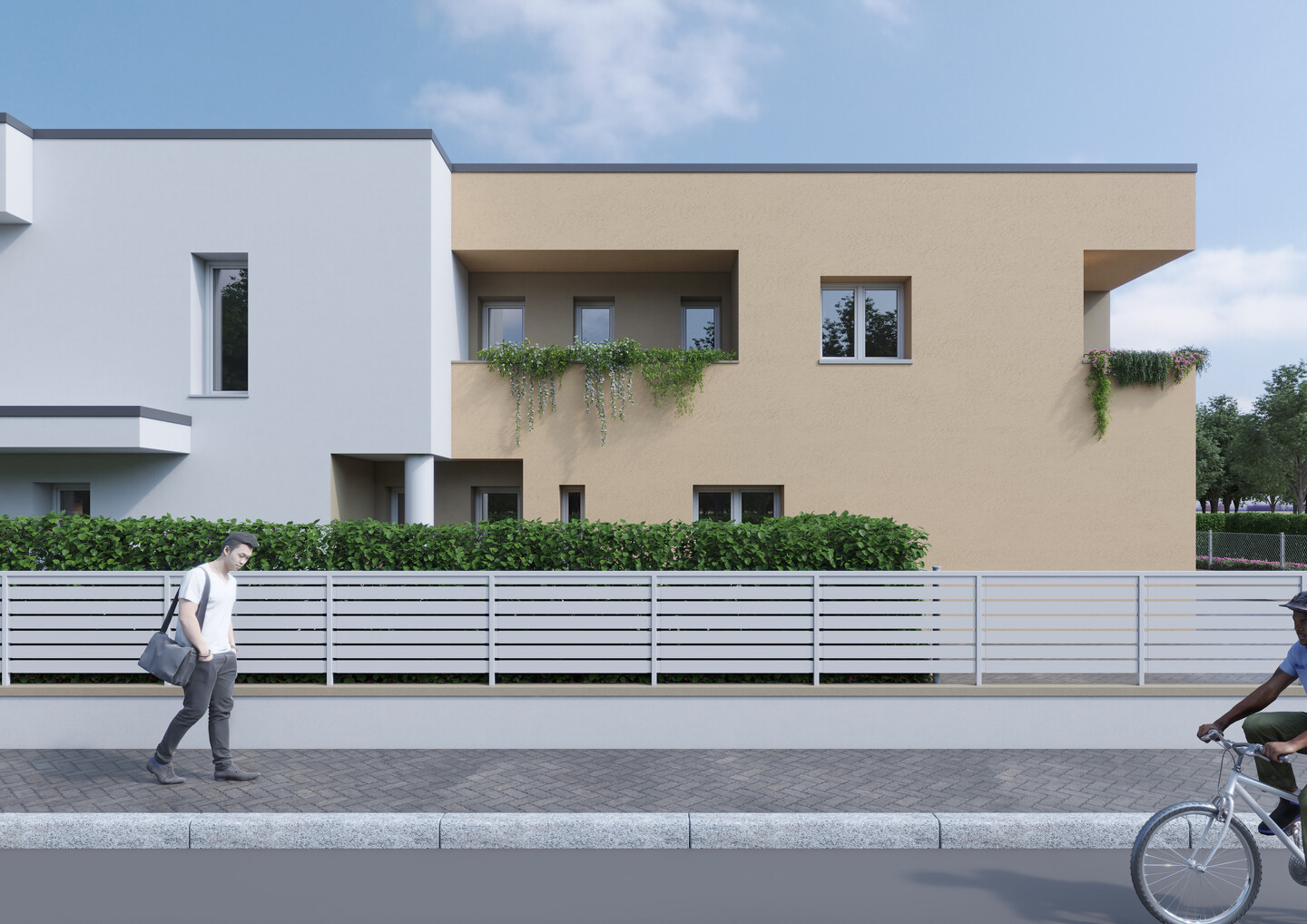 Appartamento posto al piano terra con giardino privato, così composto: ingresso indipendente su zona living con cucina a vista, vano tecnico, disimpegno, camera matrimoniale, camera doppia e 2 bagni.