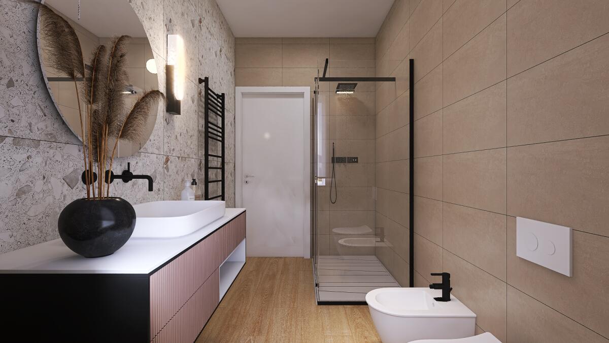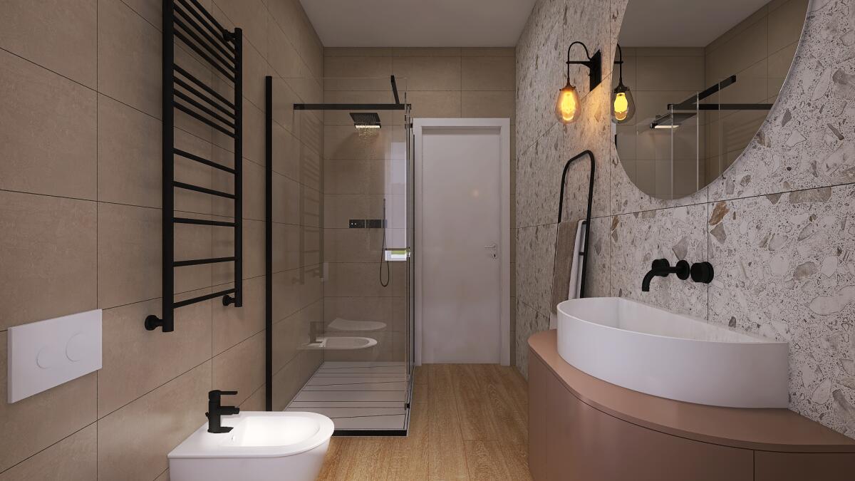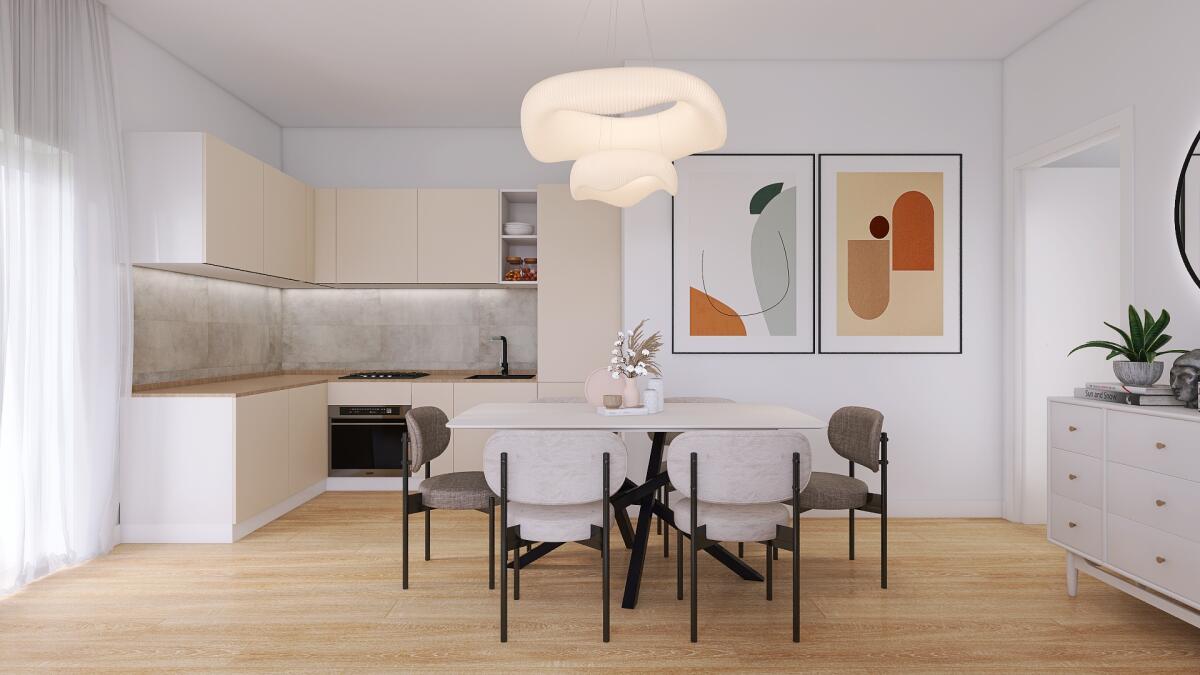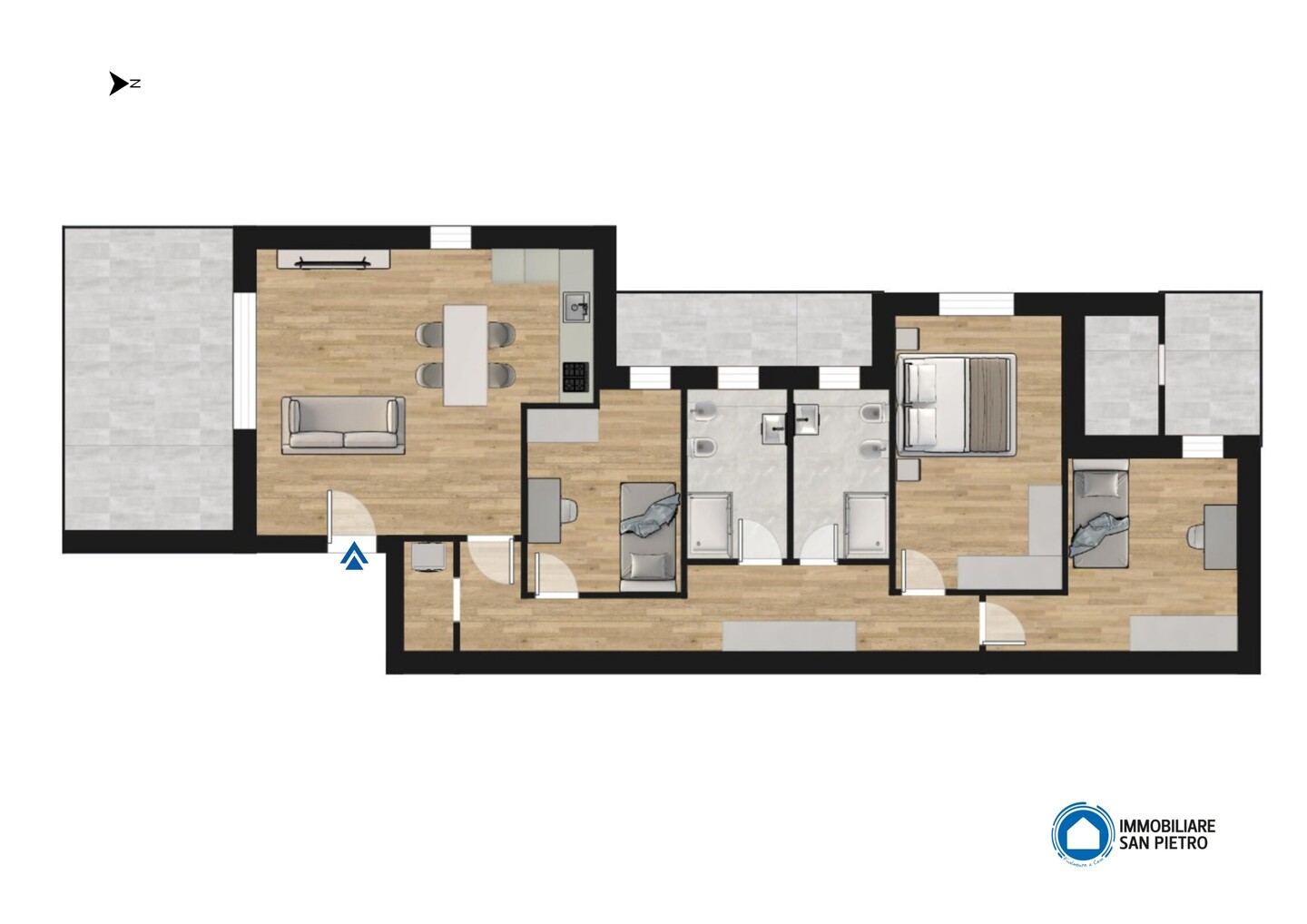 Appartamento posto al piano primo servito da ascensore, così composto: ingresso su zona living con cucina a vista ed accesso ad una terrazza abitabile, ripostiglio, disimpegno, camera matrimoniale, camera da letto doppia, camera da letto singola, 2 bagni, cantina ed ulteriori due terrazze. Autorimessa al piano terra