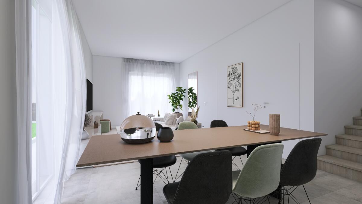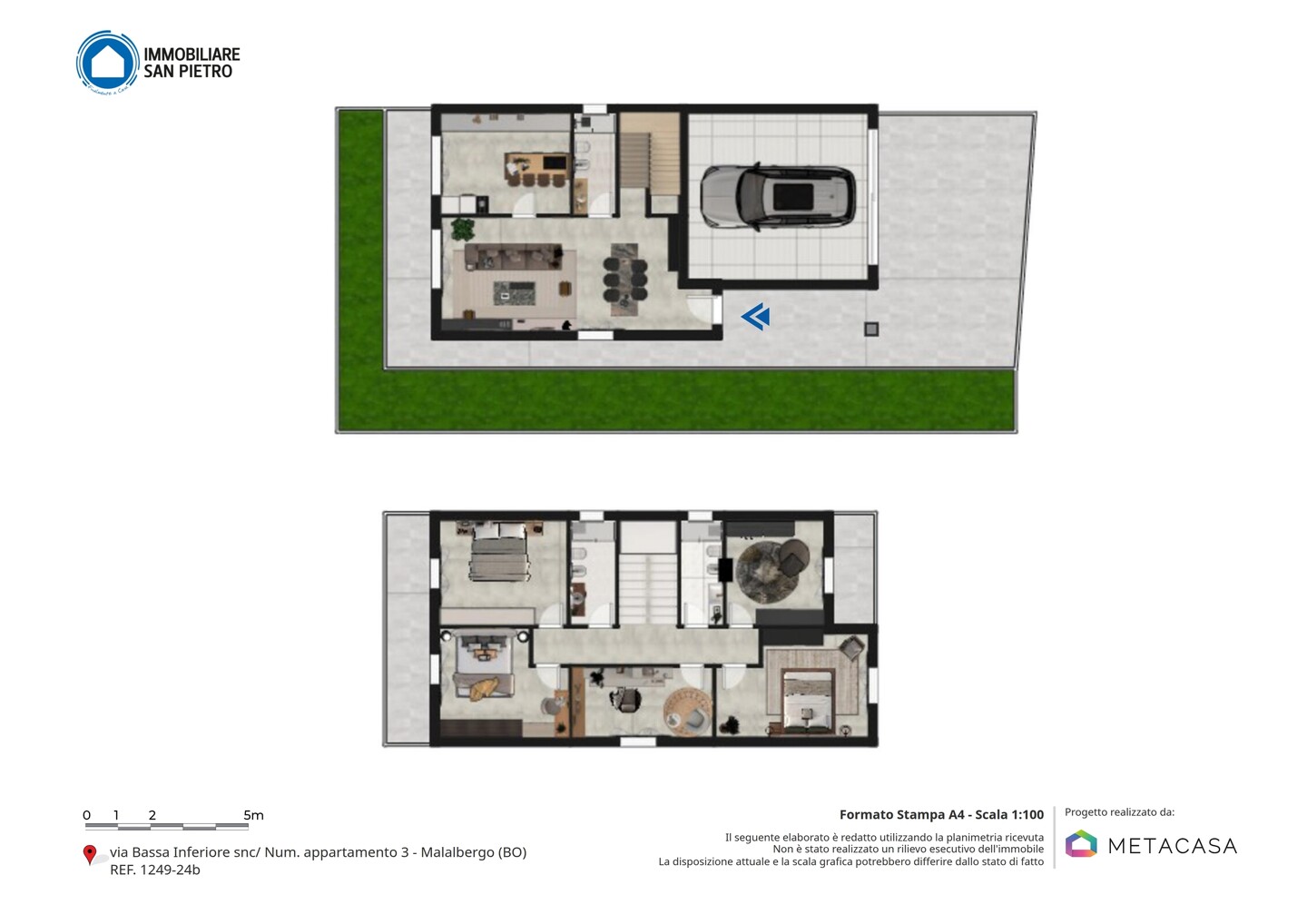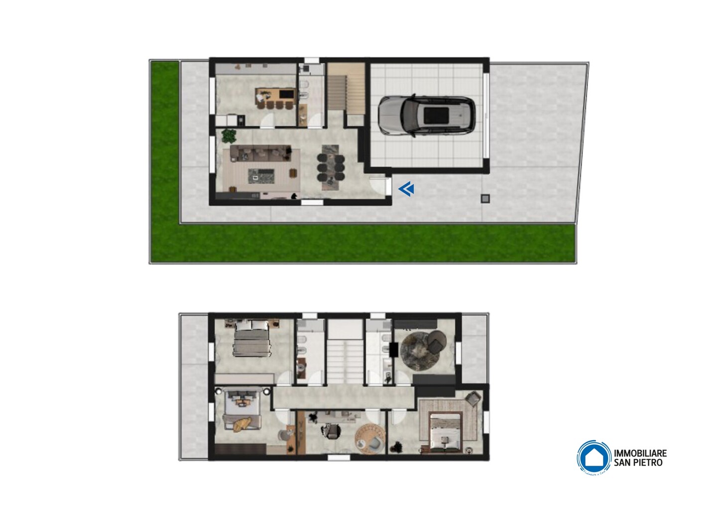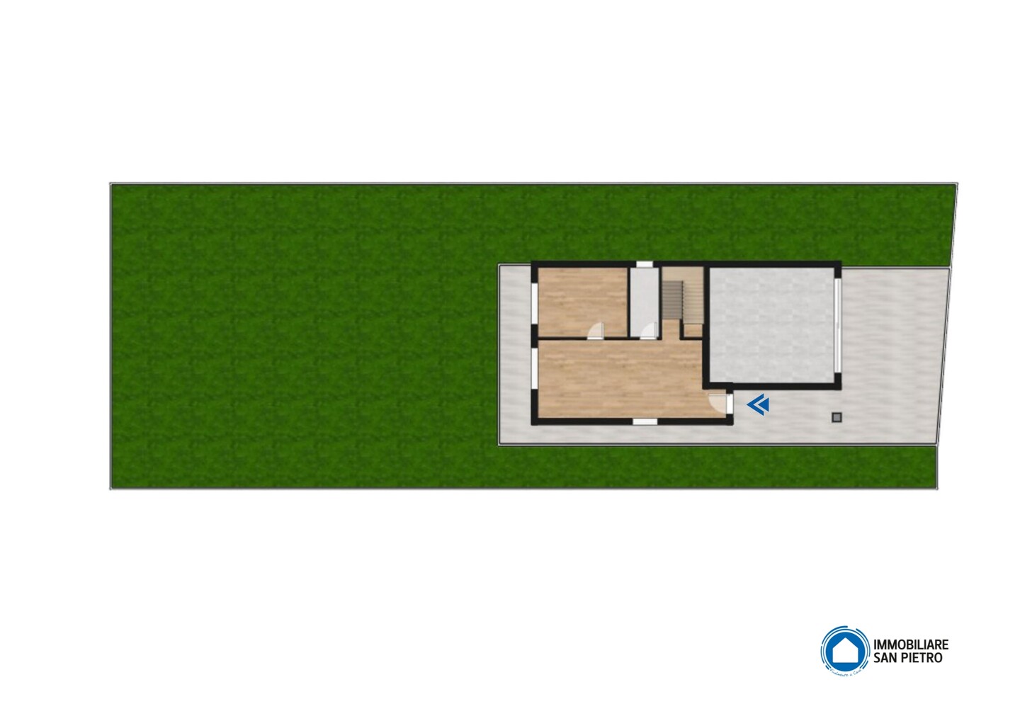 E’ sviluppata su due livelli e così strutturata: al piano terra ingresso su soggiorno, cucina abitabile di ampia metratura e bagno. Una scala conduce al primo piano dove troviamo 2 camere matrimoniali, grande cabina armadio, una camera doppia, uno studio, 2 bagni e 2 balconi. Completano la proprietà autorimessa doppia e giardino privato.