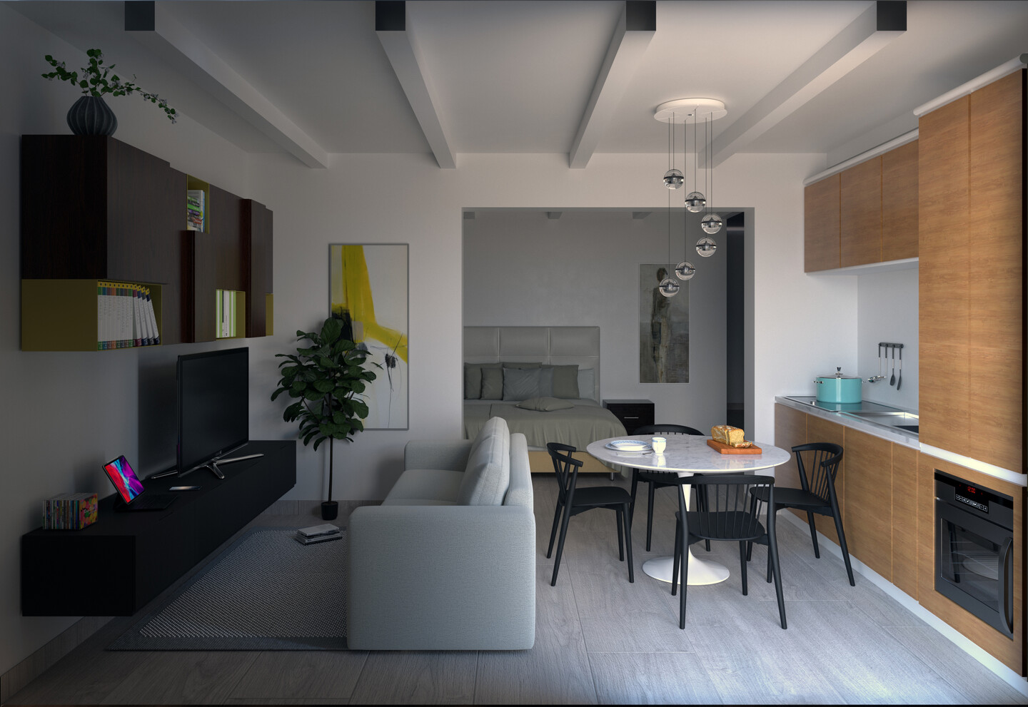 Appartamento bilocale sviluppato su 2 livelli e così composto: al piano terra ingresso indipendente su una zona giorno con angolo cottura di 28 mq, antibagno e bagno. Una scala conduce al piano superiore dove troviamo un sottotetto dov’è possibile ricavare una camera da letto ed è presente una lavanderia.