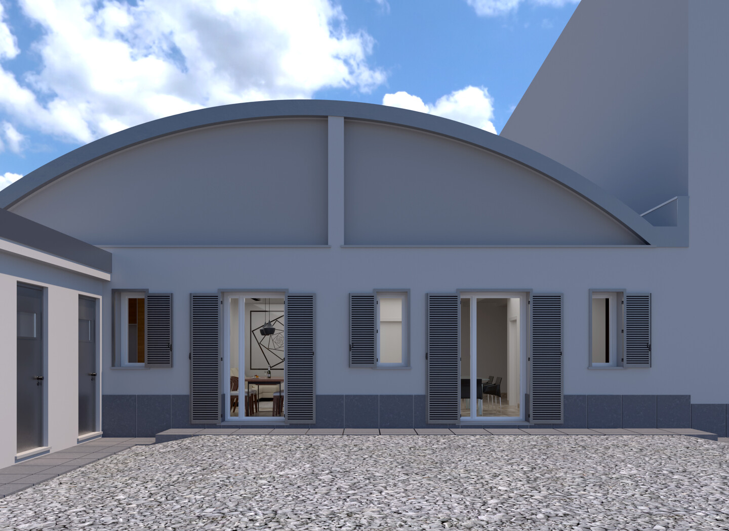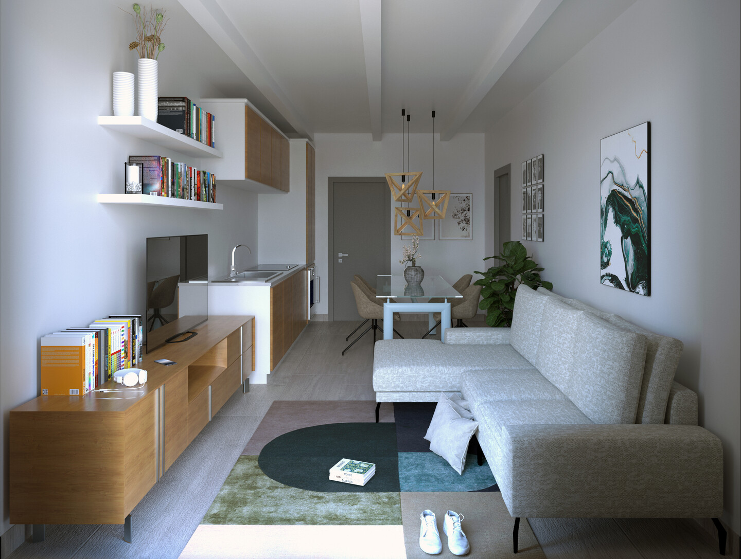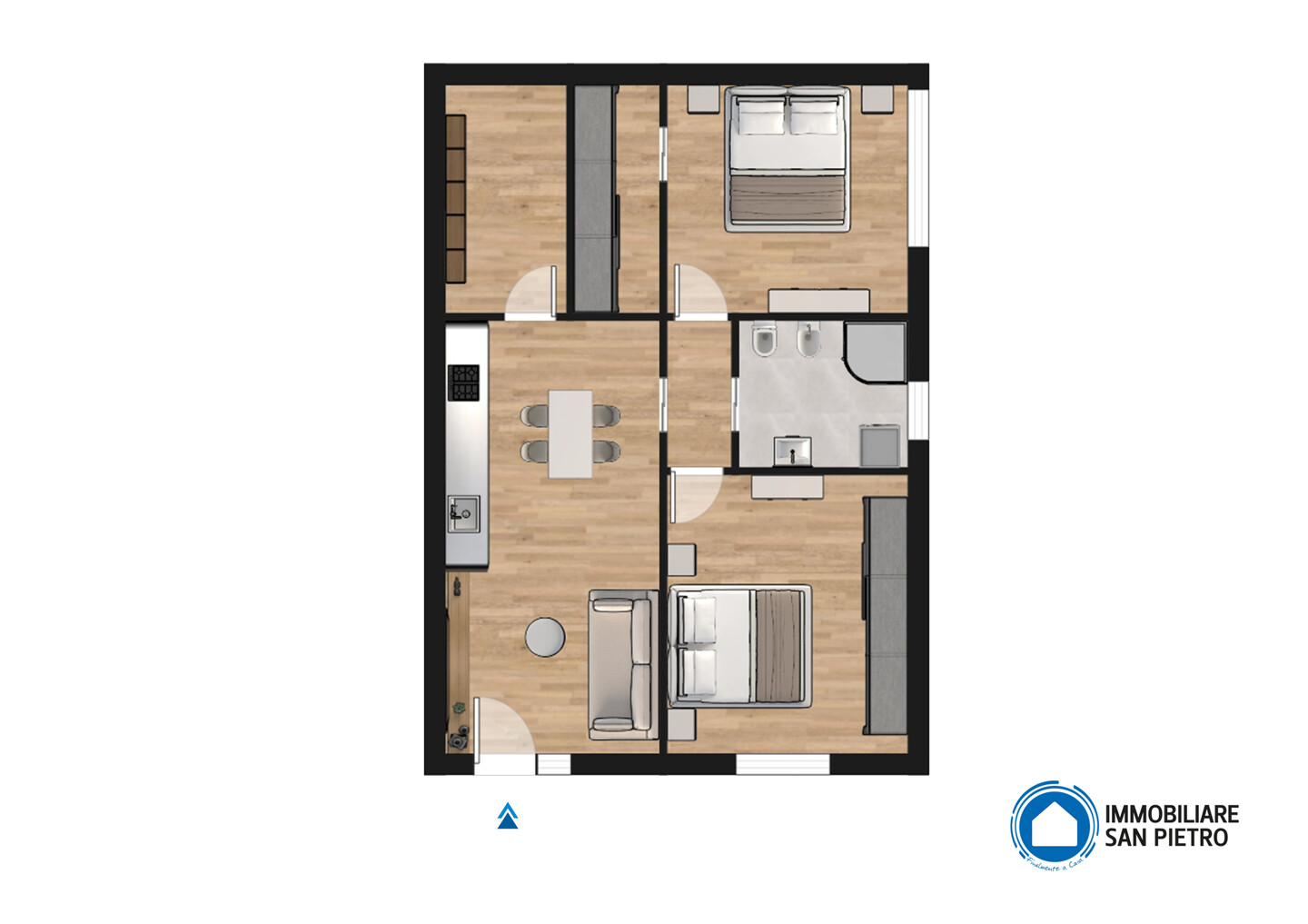 Appartamento trilocale sviluppato interamente al piano terra e così composto: ingresso indipendente su soggiorno con angolo cottura, un disimpegno notte divide 2 camere matrimoniali (di cui una con cabina armadio), un ampio ripostiglio e bagno.