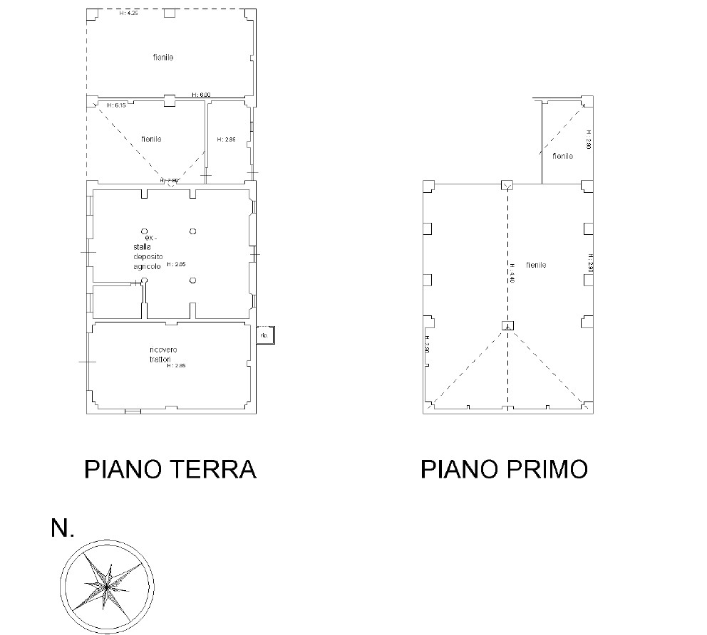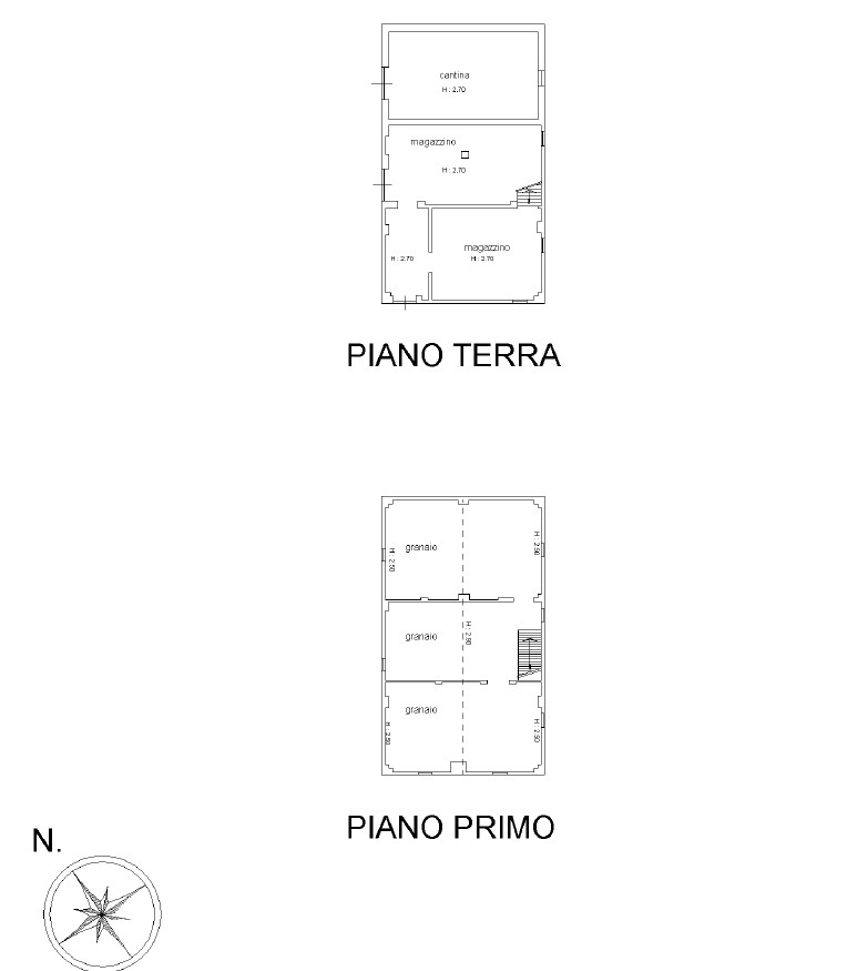 L’immobile principale si sviluppa su due livelli: al piano terra troviamo l’ingresso sul soggiorno, una cucina abitabile separata, una camera utilizzabile anche come studio o stanza multiuso, ripostiglio e cantina. Al piano primo sono presenti tre ampie camere matrimoniali/doppie, un bagno e un comodo disimpegno. A completamento della proprietà vi sono un fienile con autorimessa disposto su due piani, e due locali deposito/magazzino anch’essi sviluppati su due livelli, tutti da ristrutturare integralmente sia all’interno che all’esterno.