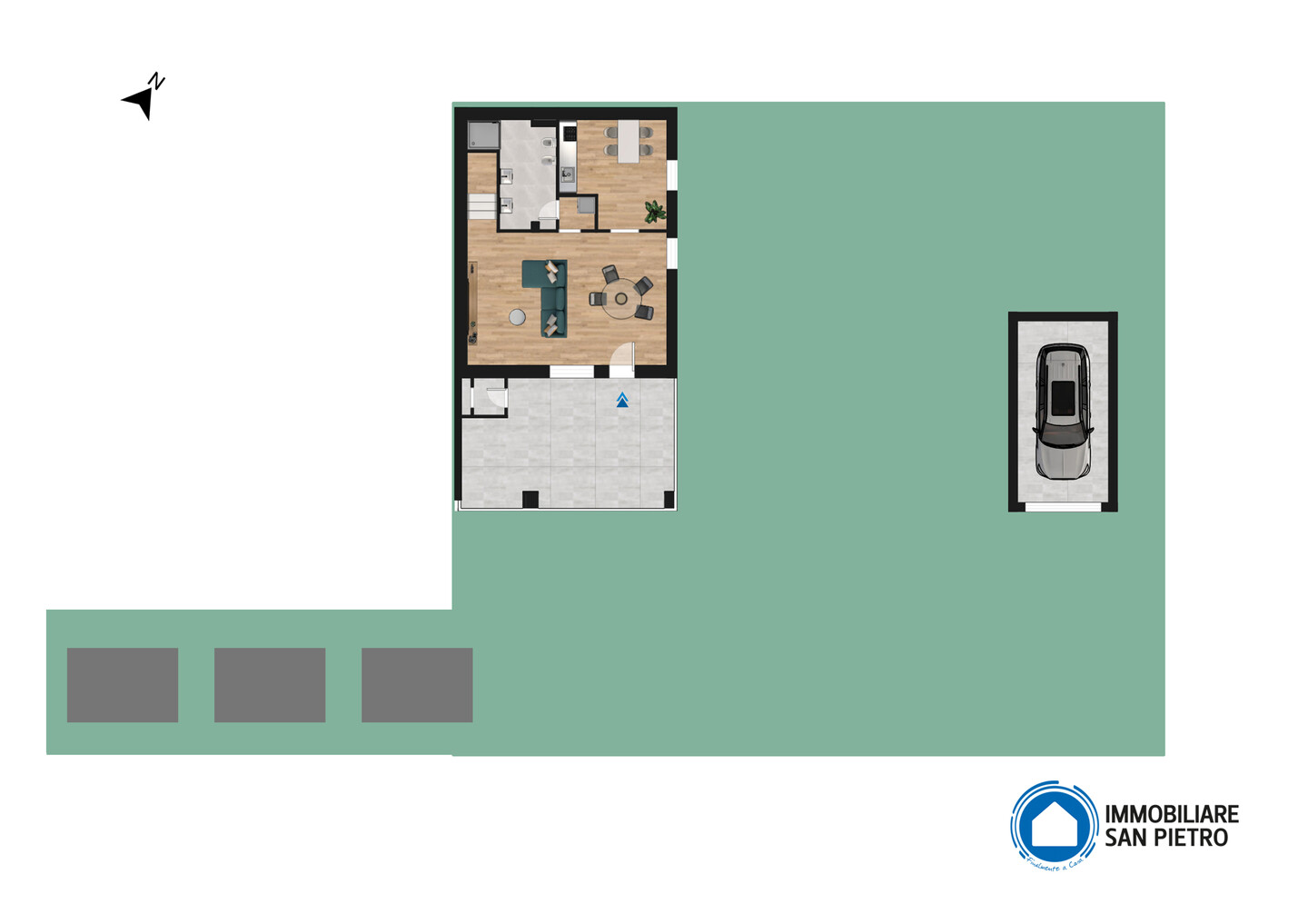 Ingresso da ampio portico su soggiorno, cucina separata ed abitabile, bagno/lavanderia, al piano terra. 2 camere da letto matrimoniali, cabina armadio e secondo bagno al piano primo. Mansarda completamente rifinita con terzo bagno al piano secondo. Garage con cantina e posto auto compresi.