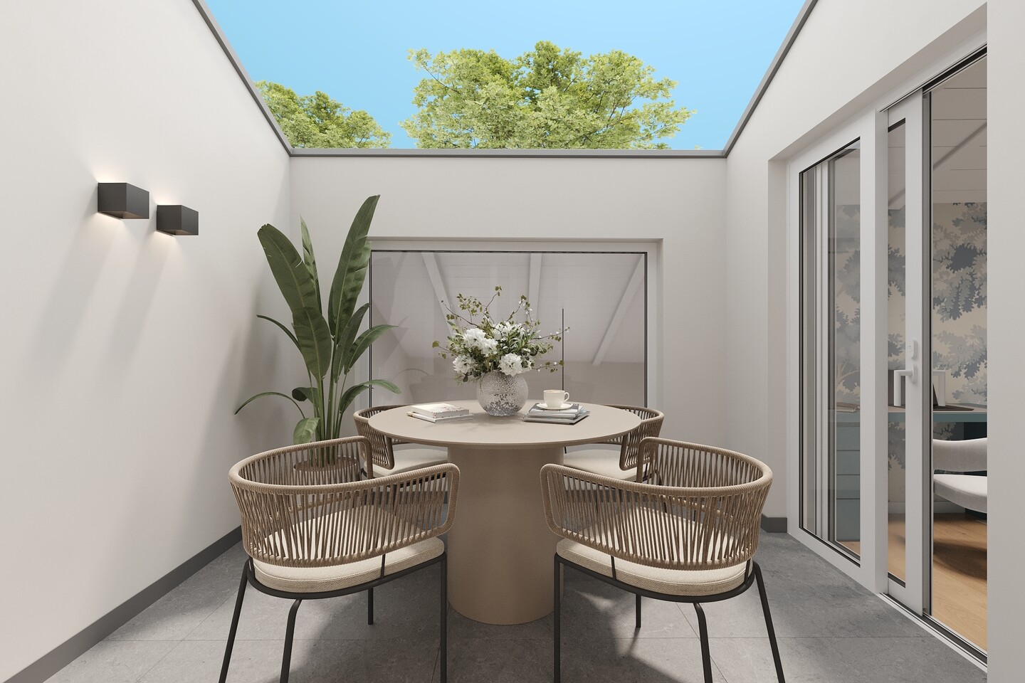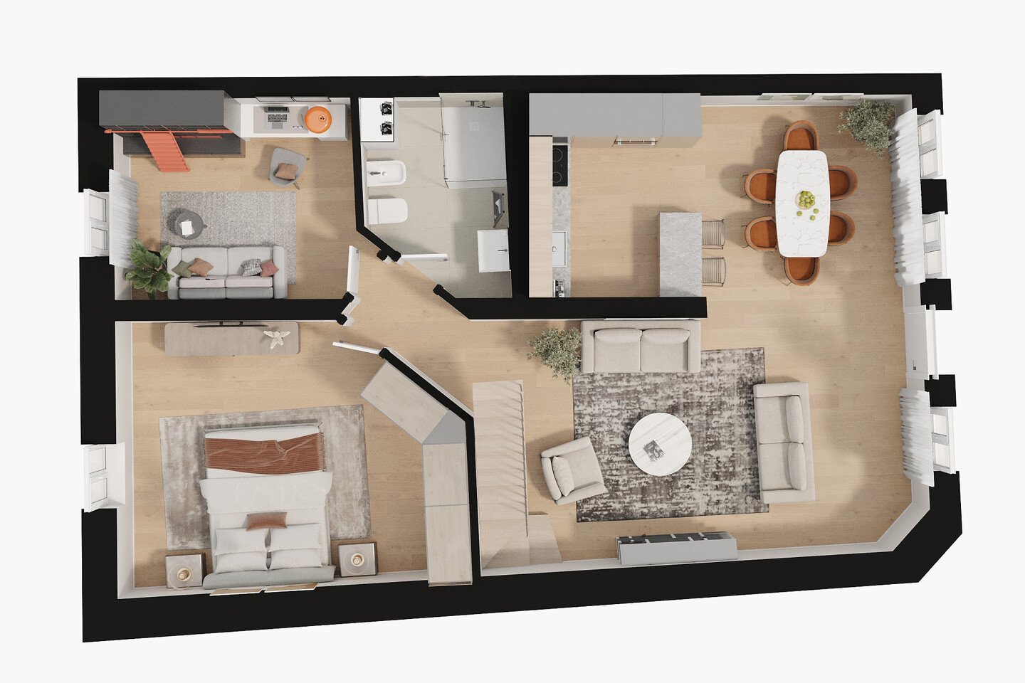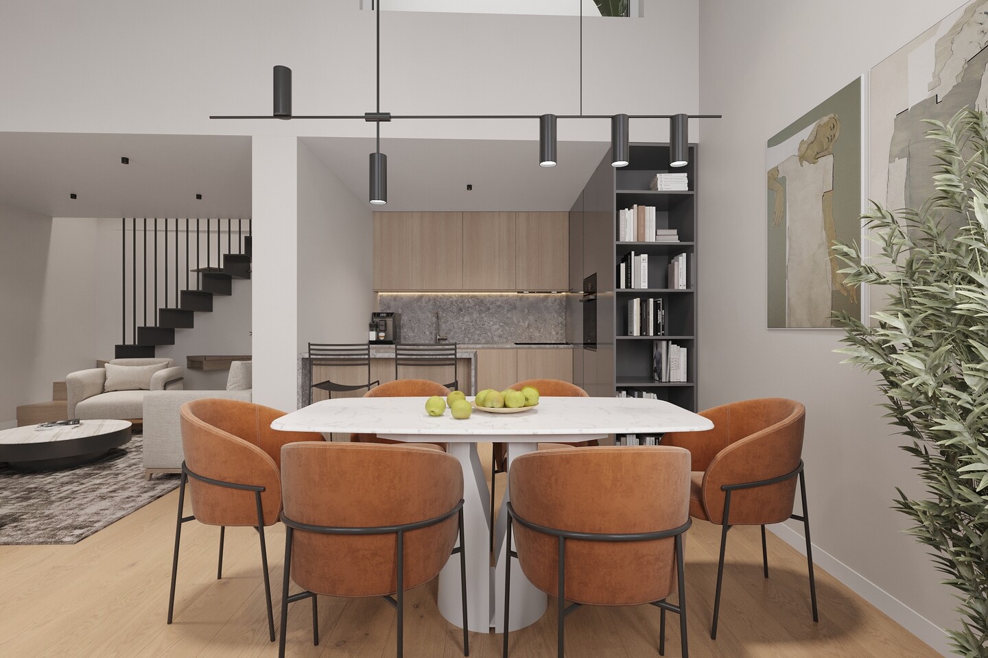 La villetta si sviluppa su 2 livelli per un totale di 120 mq ed è arricchita da una corte esterna privata di circa 7 mq all’ingresso e da un ampio terrazzo in falda al primo piano. Al piano terra troviamo l’ingresso su un ampio soggiorno con doppio volume e cucina a vista, che creano un ambiente moderno e luminoso, un bagno con piatto doccia e predisposizione per lavatrice, 1 camera matrimoniale e 1 camera singola ideale anche come studio, entrambe caratterizzate dal doppio volume. Il primo piano invece è composta da 1 camera matrimoniale dotata di accesso diretto alla terrazza, 1 camera singola e un secondo bagno con doccia e velux.