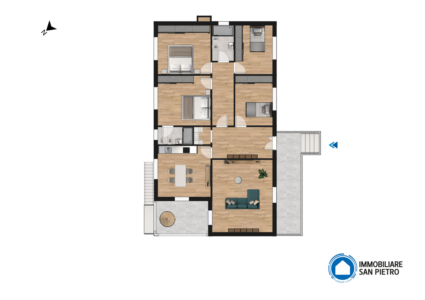Il primo piano è accessibile da due scale esterne: una conduce a una verandina collegata internamente tramite scala a chiocciola al piano terra, da cui si accede alla cucina abitabile e al soggiorno separato; l’altra apre su un disimpegno che distribuisce la zona giorno e la zona notte, composta da due camere matrimoniali, due camere singole e due bagni finestrati. Completa la proprietà una soffitta al secondo piano di circa 138 mq.