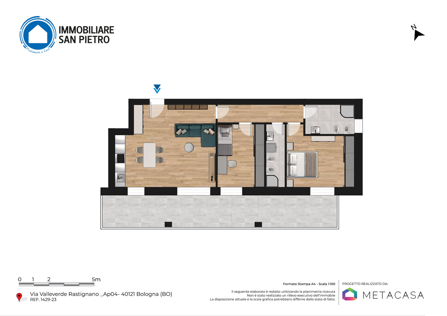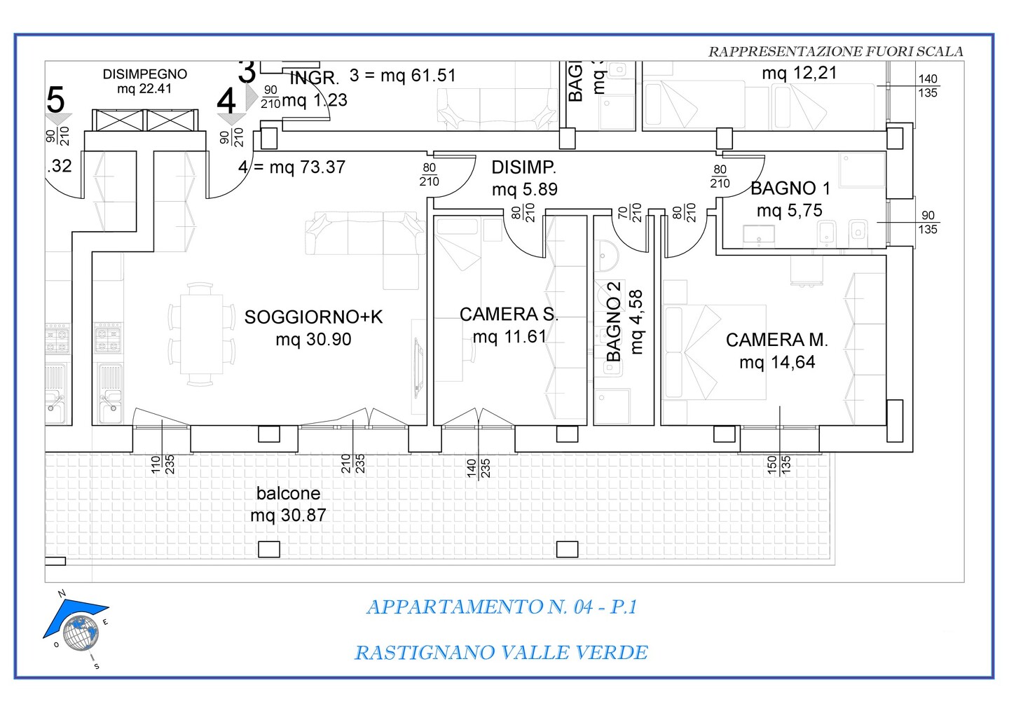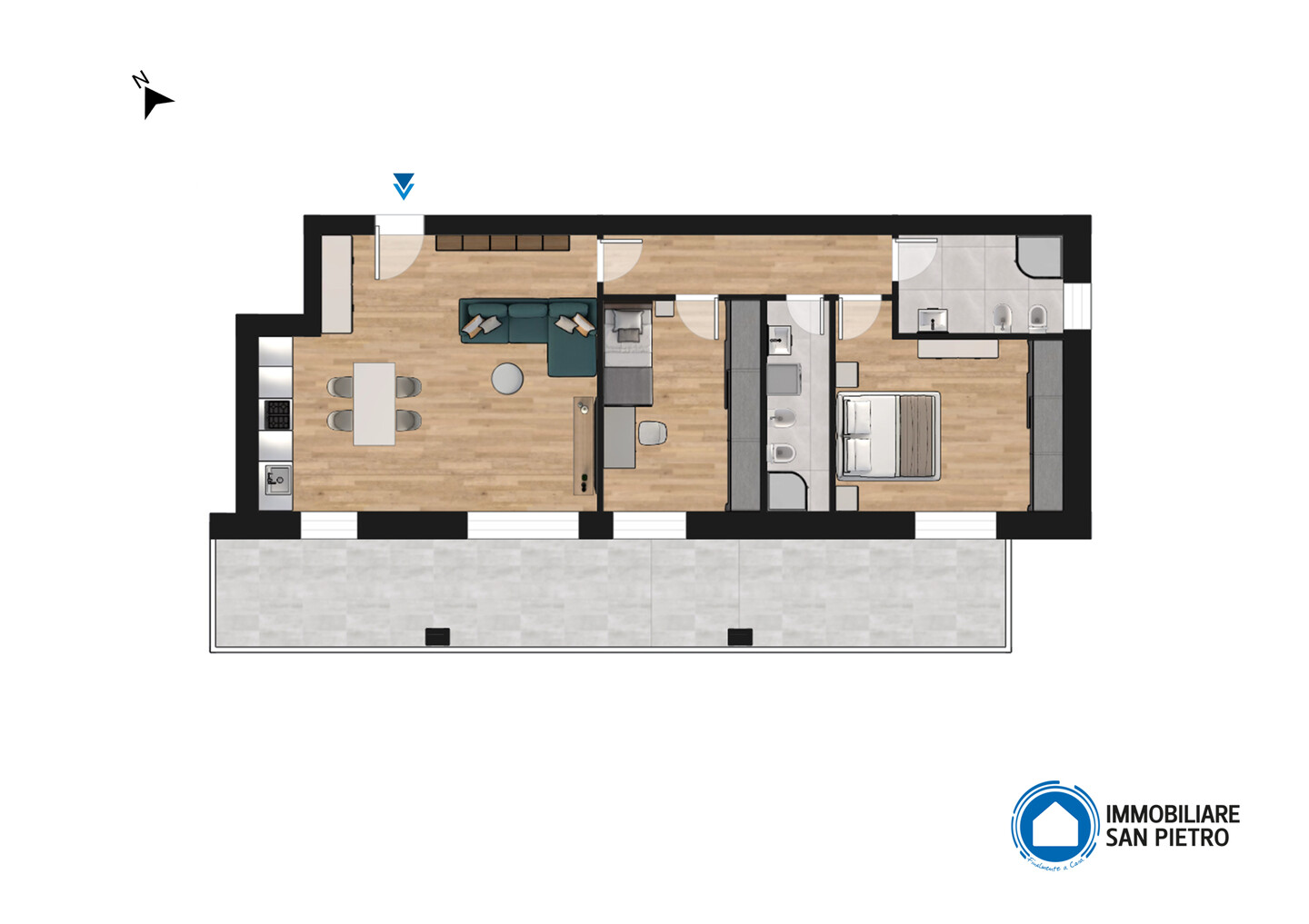 Appartamento 4: L’appartamento è composto da soggiorno con cucina a vista ed affaccio su ampio terrazzo che abbraccia anche la camera matrimoniale così come la camera singola, disimpegno, due bagni finestrati.