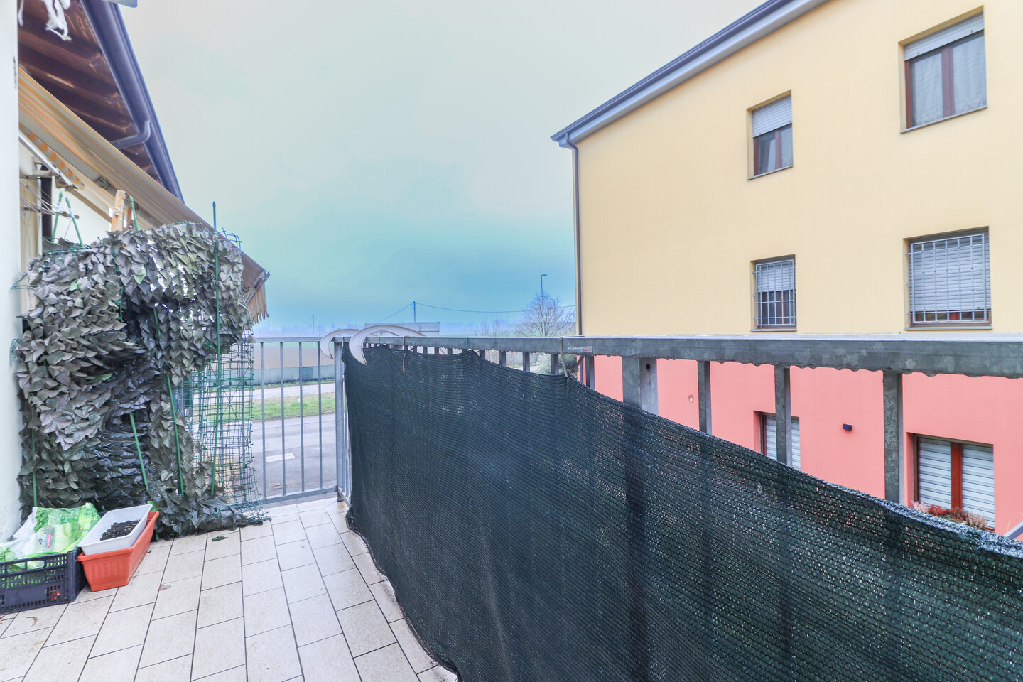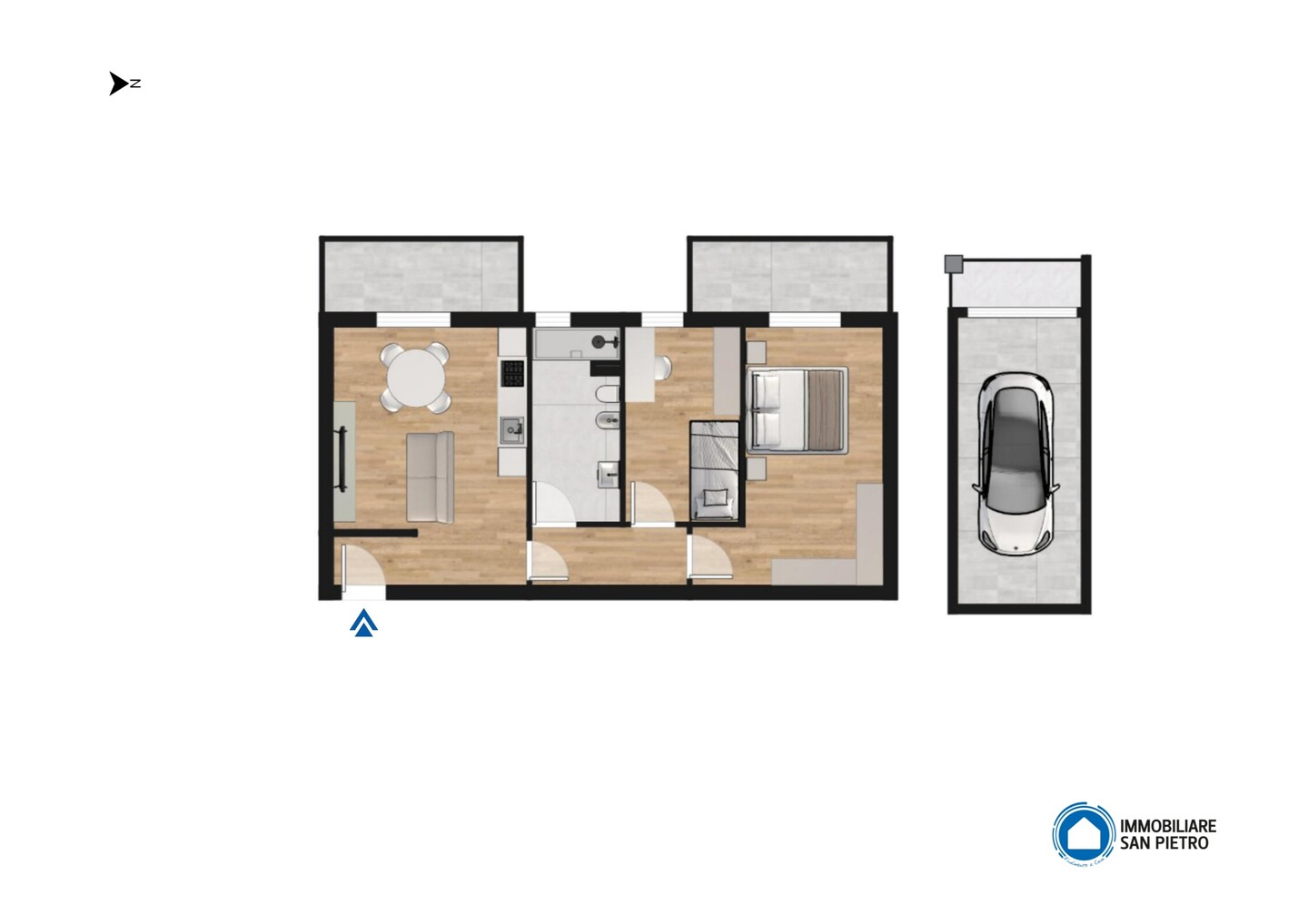 Ingresso su soggiorno con cucina a vista ed accesso al balcone, disimpegno, camera da letto matrimoniale con balcone, camera da letto singola e bagno. A completare la proprietà garage al piano terra.
