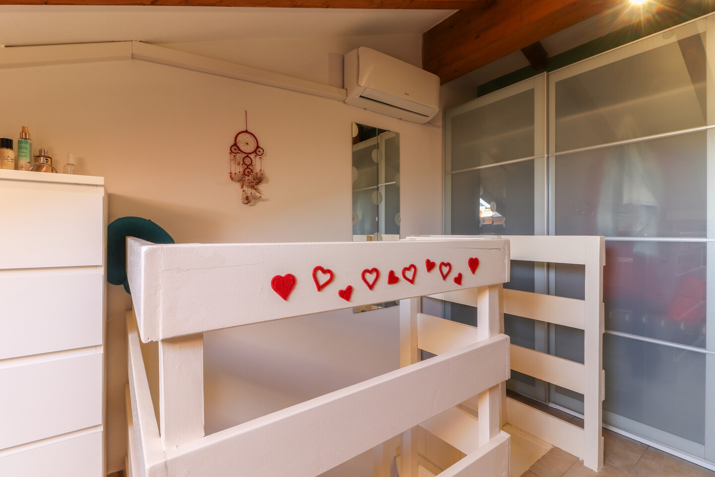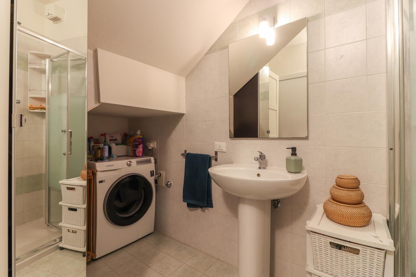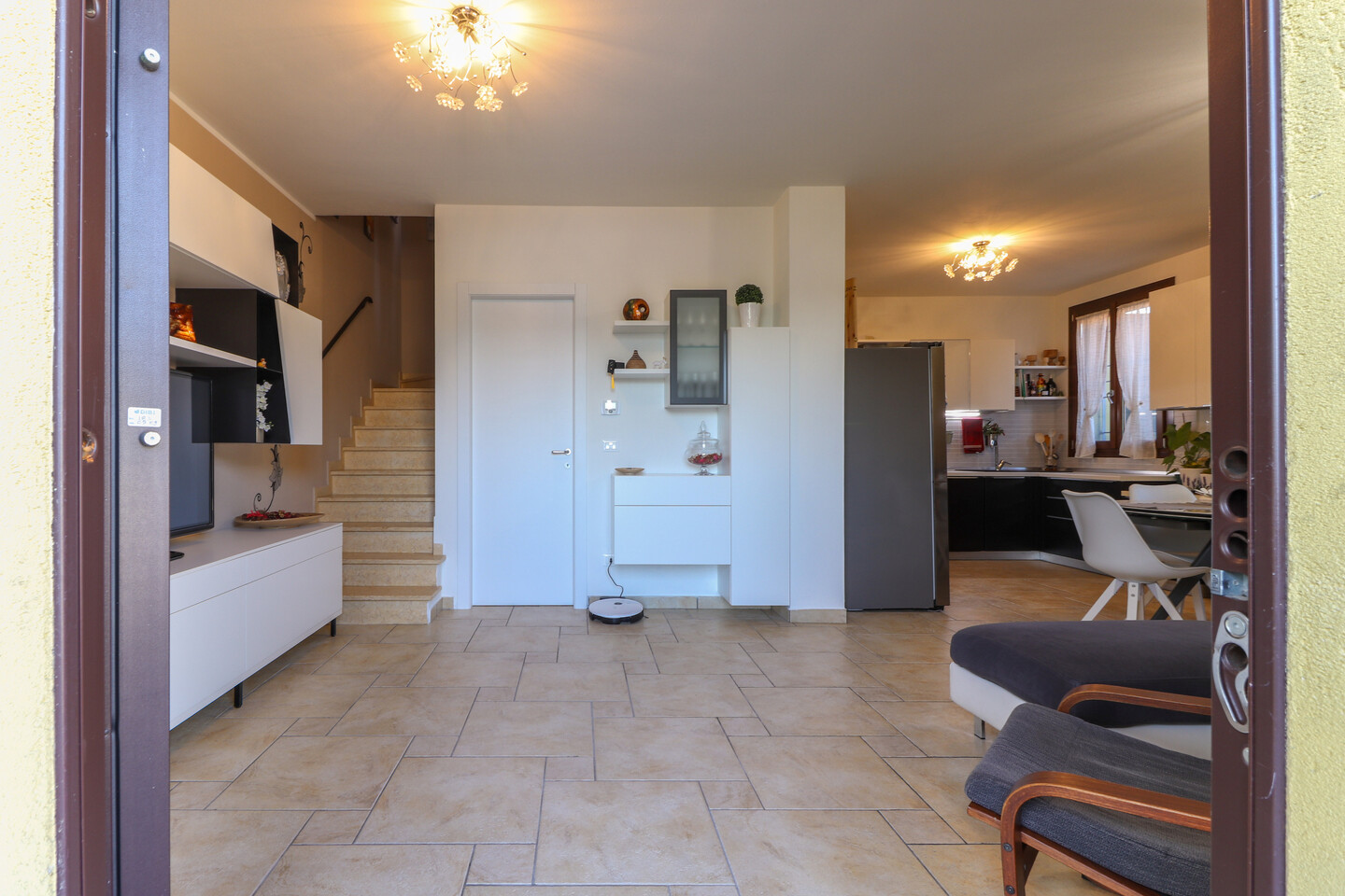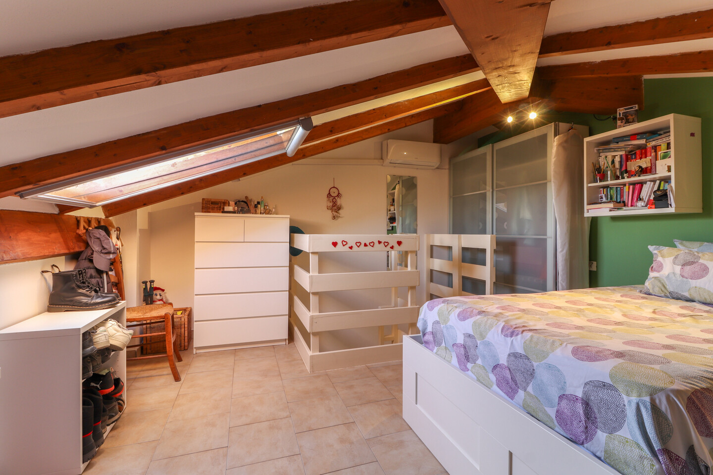 La casa è composta al piano terra da un ingresso su ampio soggiorno con cucina a vista e un bagno / lavanderia. Al primo piano troviamo il disimpegno notte, una spaziosa camera matrimoniale, una camera doppia e un secondo bagno. Completa la proprietà una mansarda al secondo piano, attualmente adibita a terza cameretta, perfetta come stanza aggiuntiva per ospiti o studio.