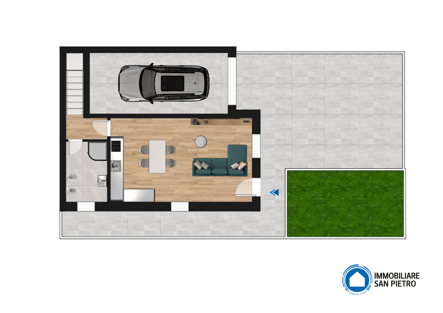 Al piano terra si sviluppa totalmente la zona giorno con sala con cucina a vista e ampie vetrate che danno accesso al giardino, disimpegno e comodo bagno finestrato. Tramite comoda scala si accede al primo piano con 3 camere da letto con 2 balconi, bagno e ampio ripostiglio / cabina armadio. Completa la proprietà l’autorimessa.