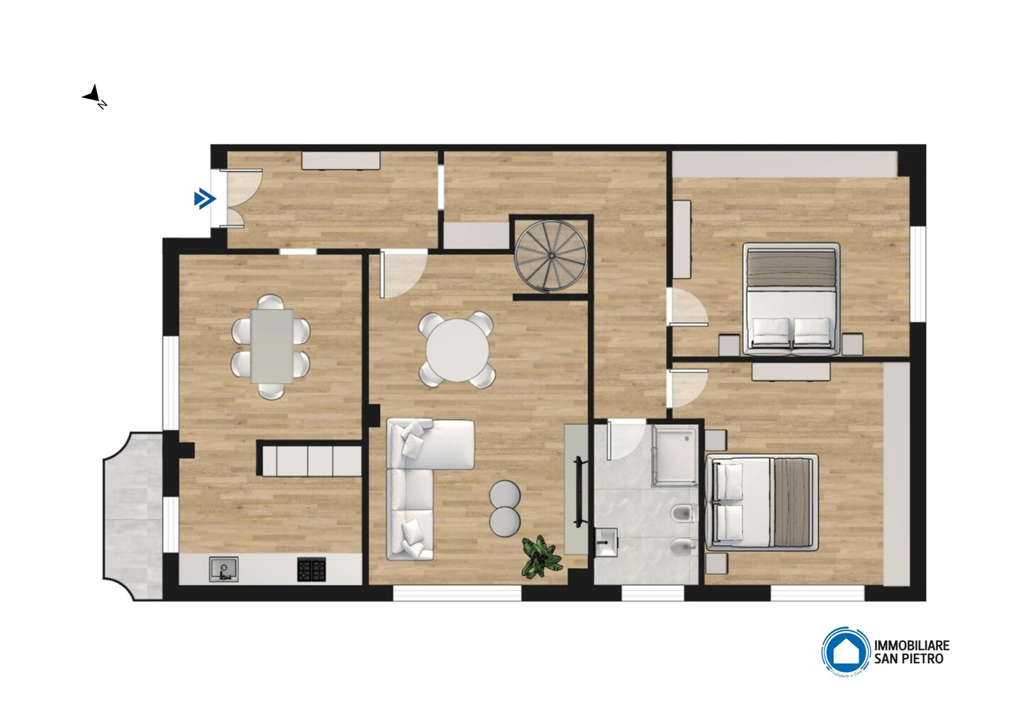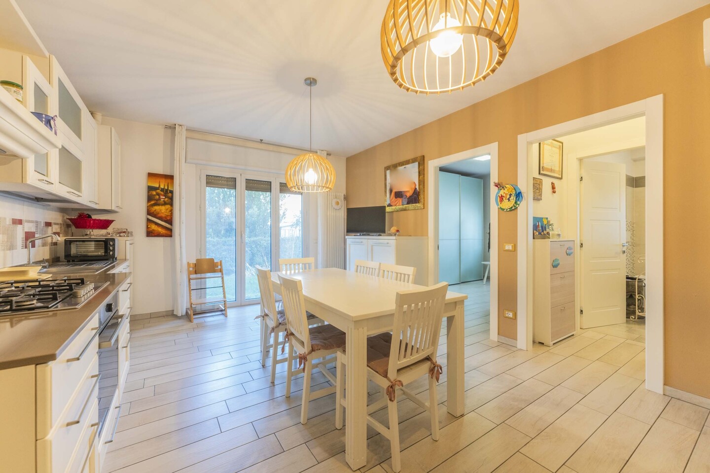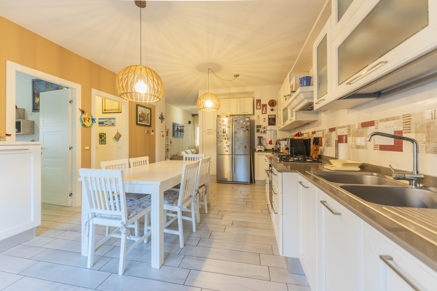 Il piano terra comprende un ingresso, una cucina abitabile, una camera da letto, un anti-bagno e un bagno. Al piano primo si trovano un ingresso su disimpegno, una sala da pranzo, un soggiorno, una cucina abitabile con accesso al balcone, due camere da letto e un bagno.
