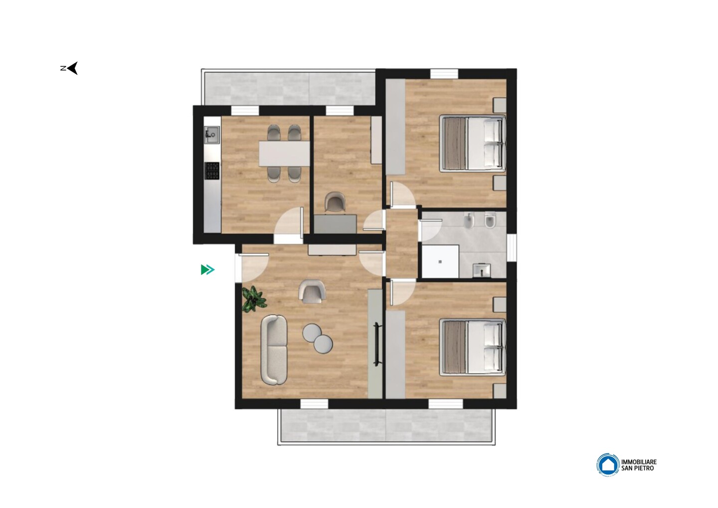 L’immobile è situato al secondo ed ultimo piano di una palazzina anni ’80 ed è così composto: ingresso su ampio soggiorno, cucina abitabile (dai quali è possibile accedere direttamente ai 2 terrazzi presenti nell’abitazione), 2 camere matrimoniali, una singola ed un bagno. Completano la proprietà il garage doppio ed il giardino condominiale.