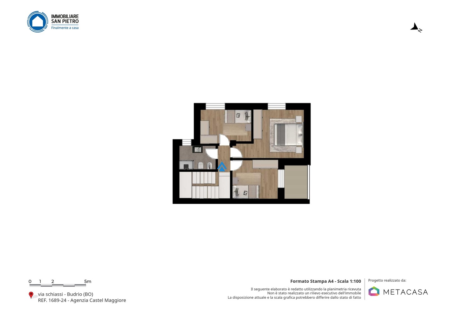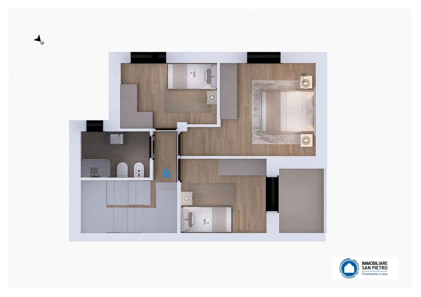 Al piano superiore, la zona notte comprende una camera matrimoniale, due camere singole e un secondo bagno, con spazi ben disimpegnati.
