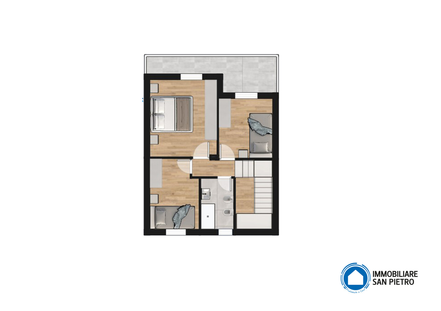 Al piano superiore, la zona notte comprende una camera matrimoniale, due camere singole e un secondo bagno, con spazi ben disimpegnati.