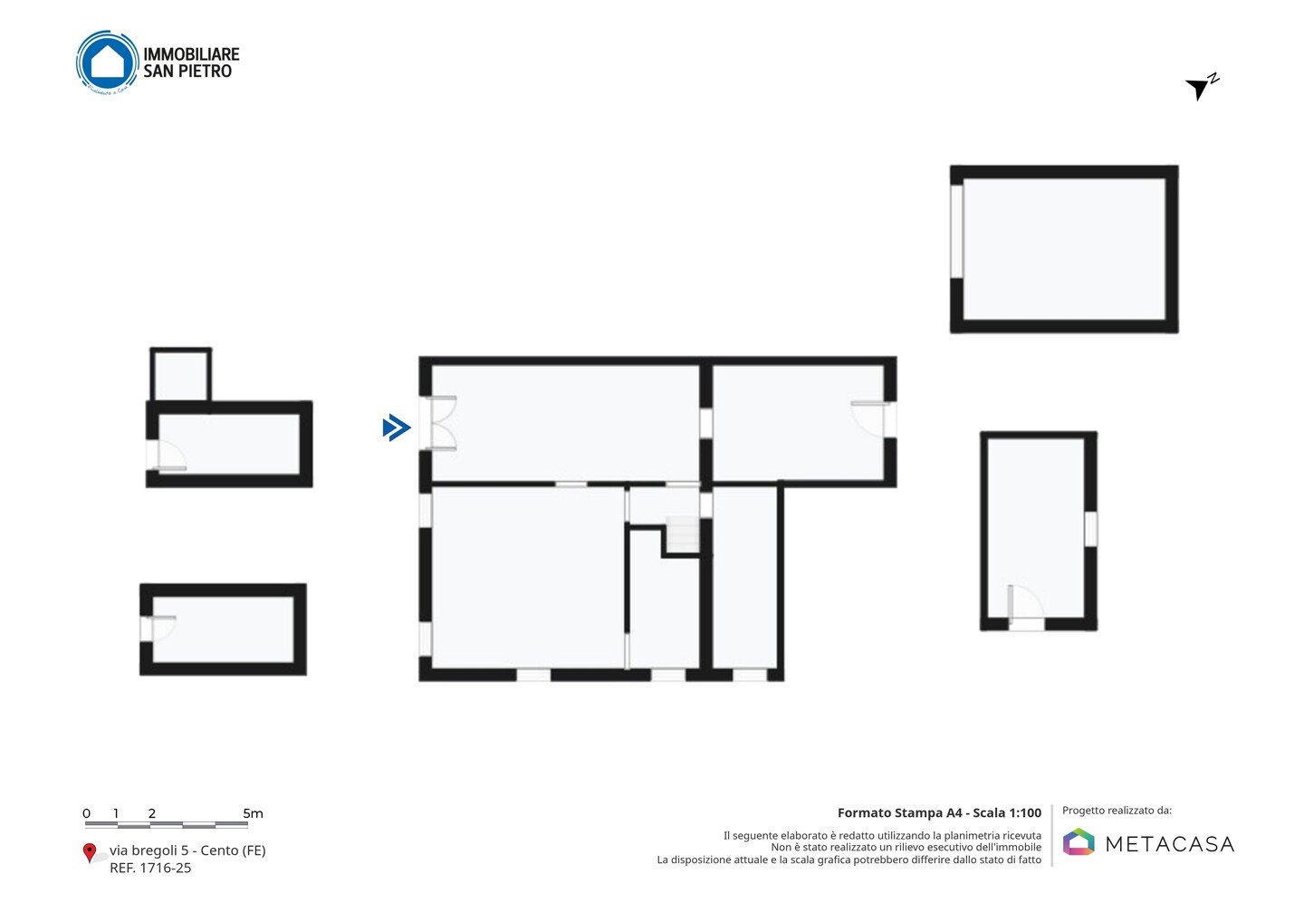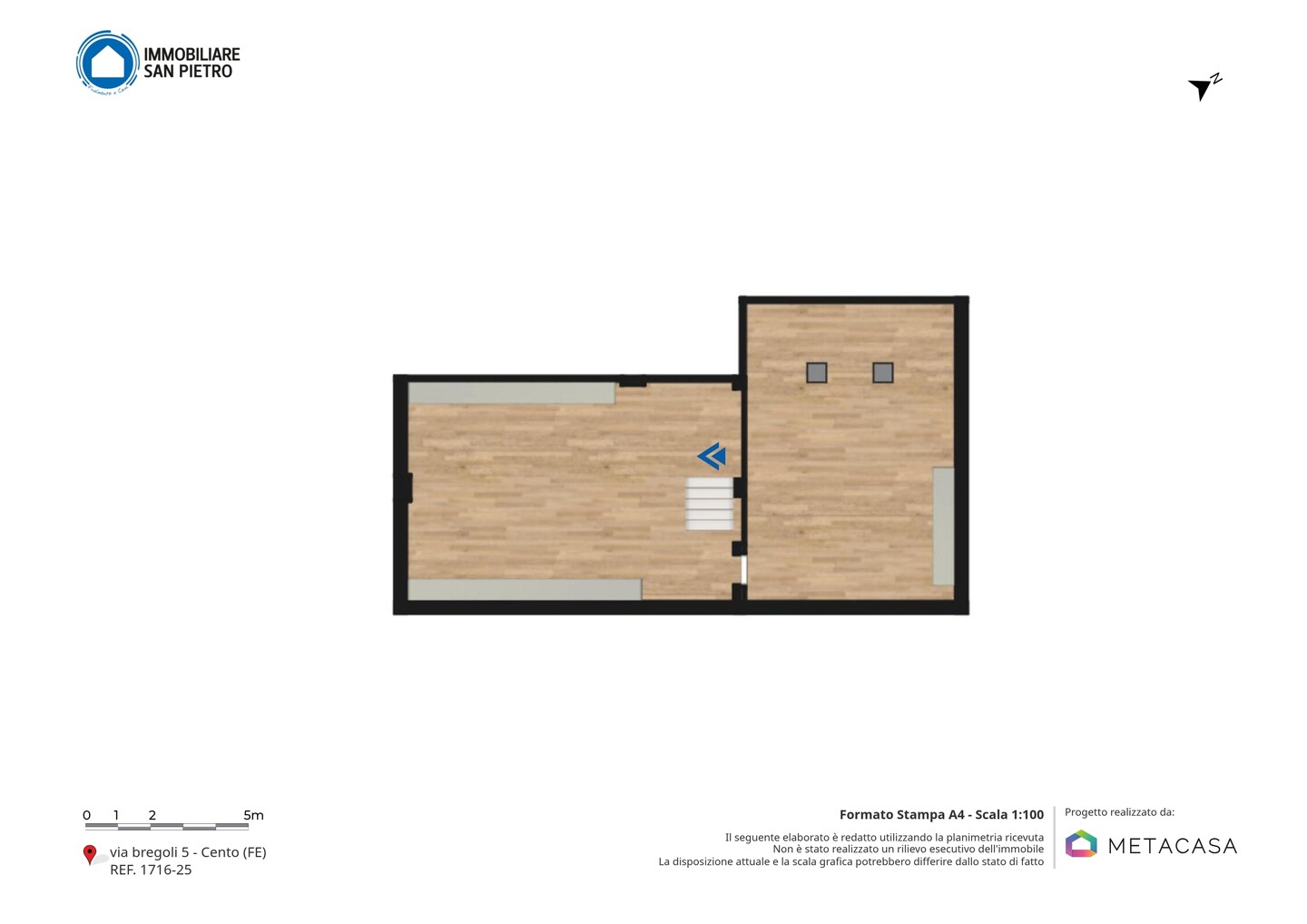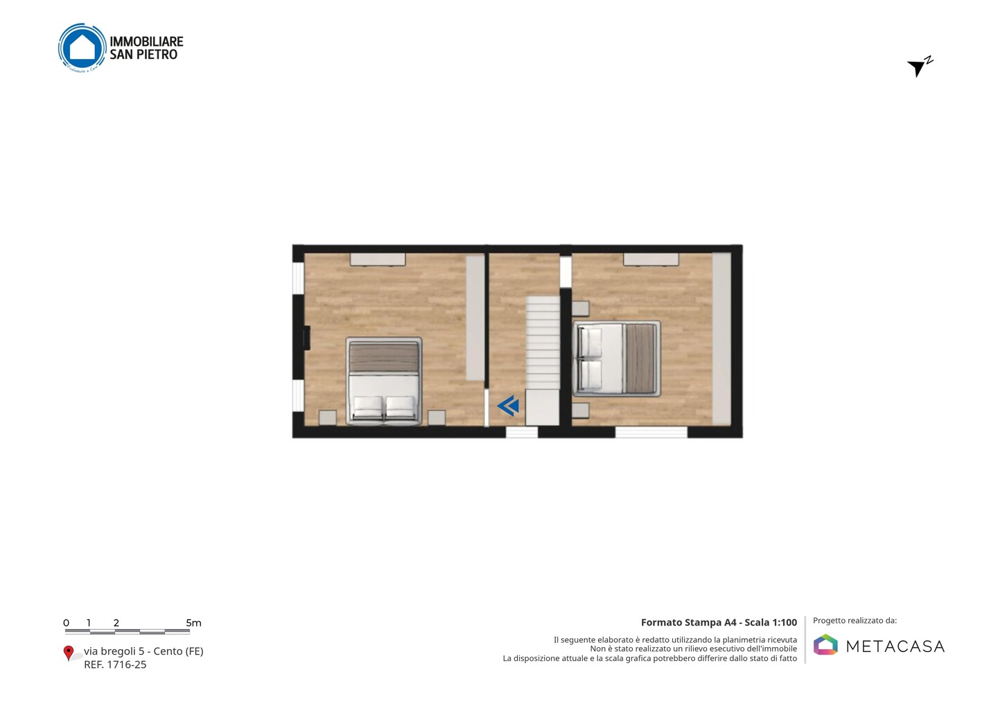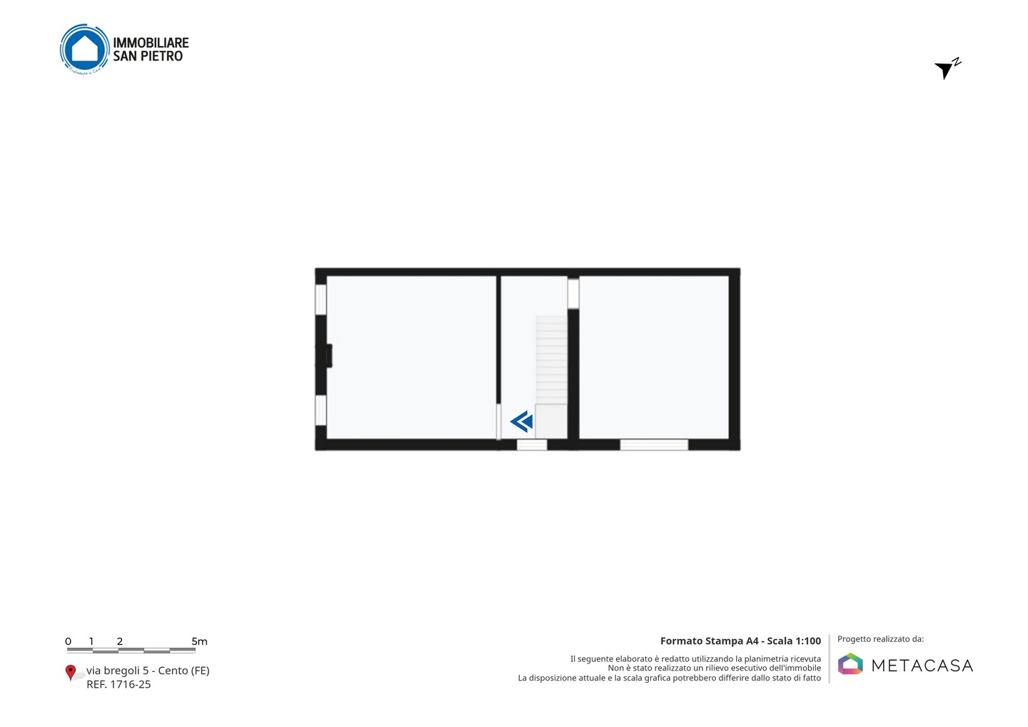Porzione di bifamiliare composta da ingresso arredabile, soggiorno con cucinotto, bagno, cantina e centrale termica. Scala interna che porta al primo piano composto da 2 camere matrimoniali ed accesso ad un sottotetto grezzo ad uso soffitta. Giardino in condivisione con l’altro confinante, il tutto di proprietà della partecipanza agraria di Cento al quale viene riconosciuta una piccola somma annuale.