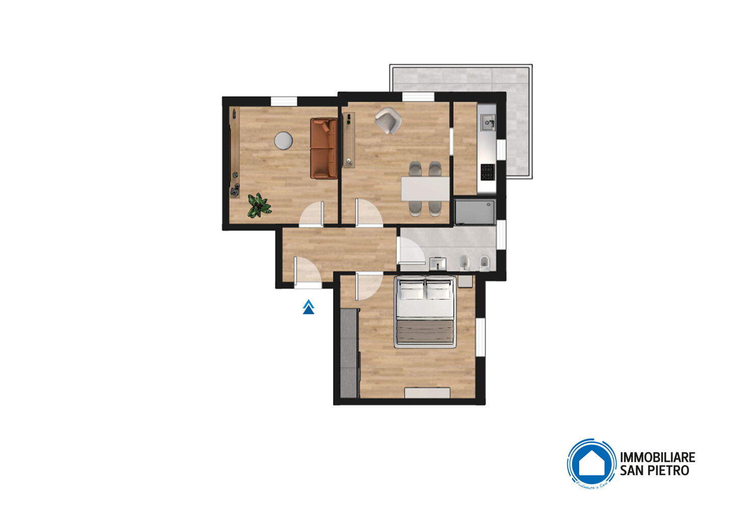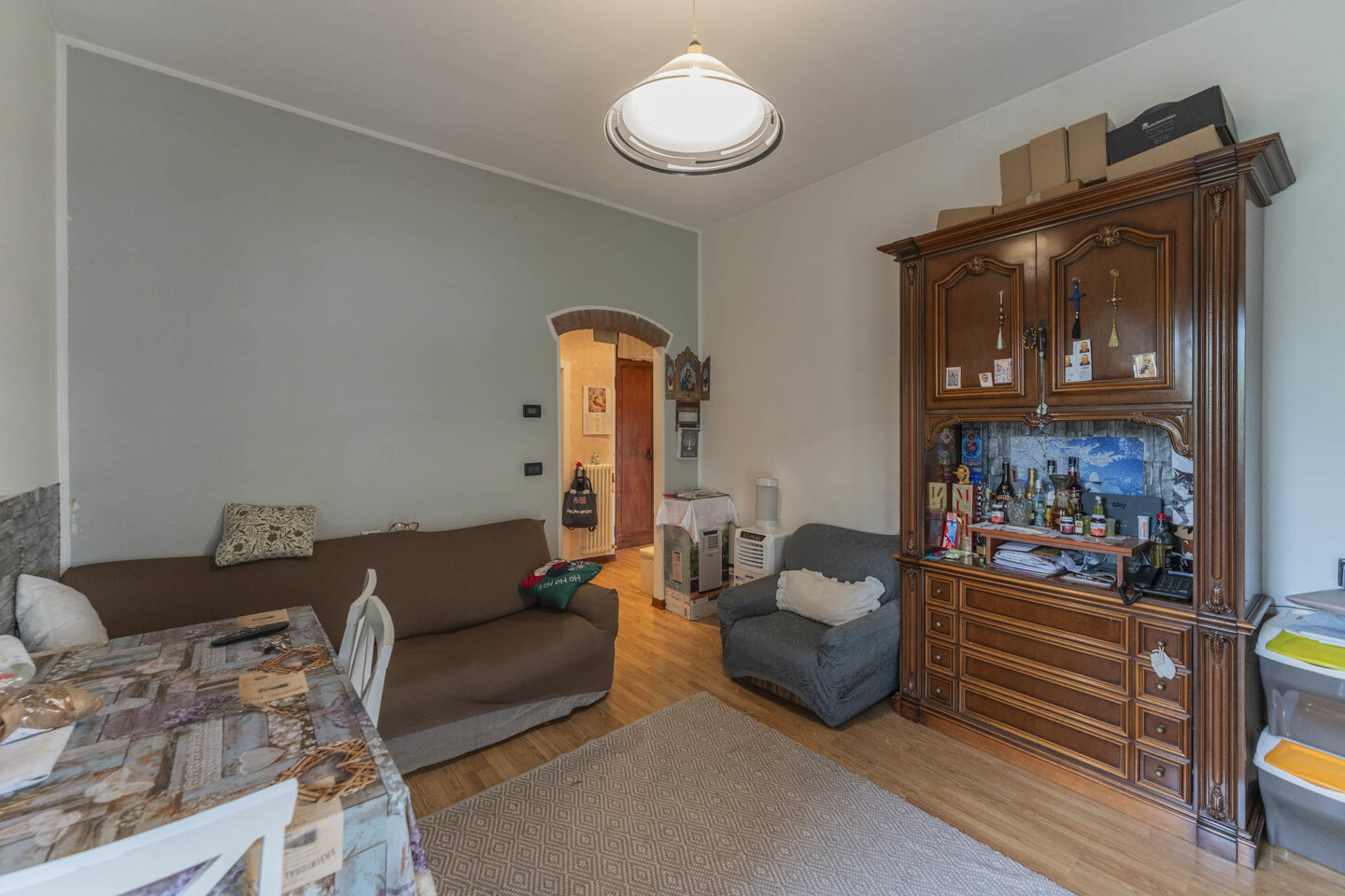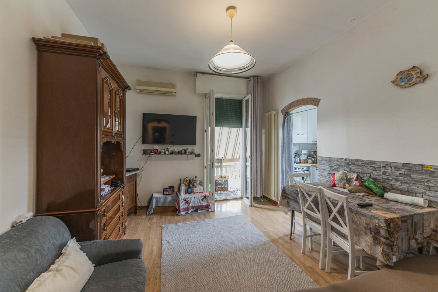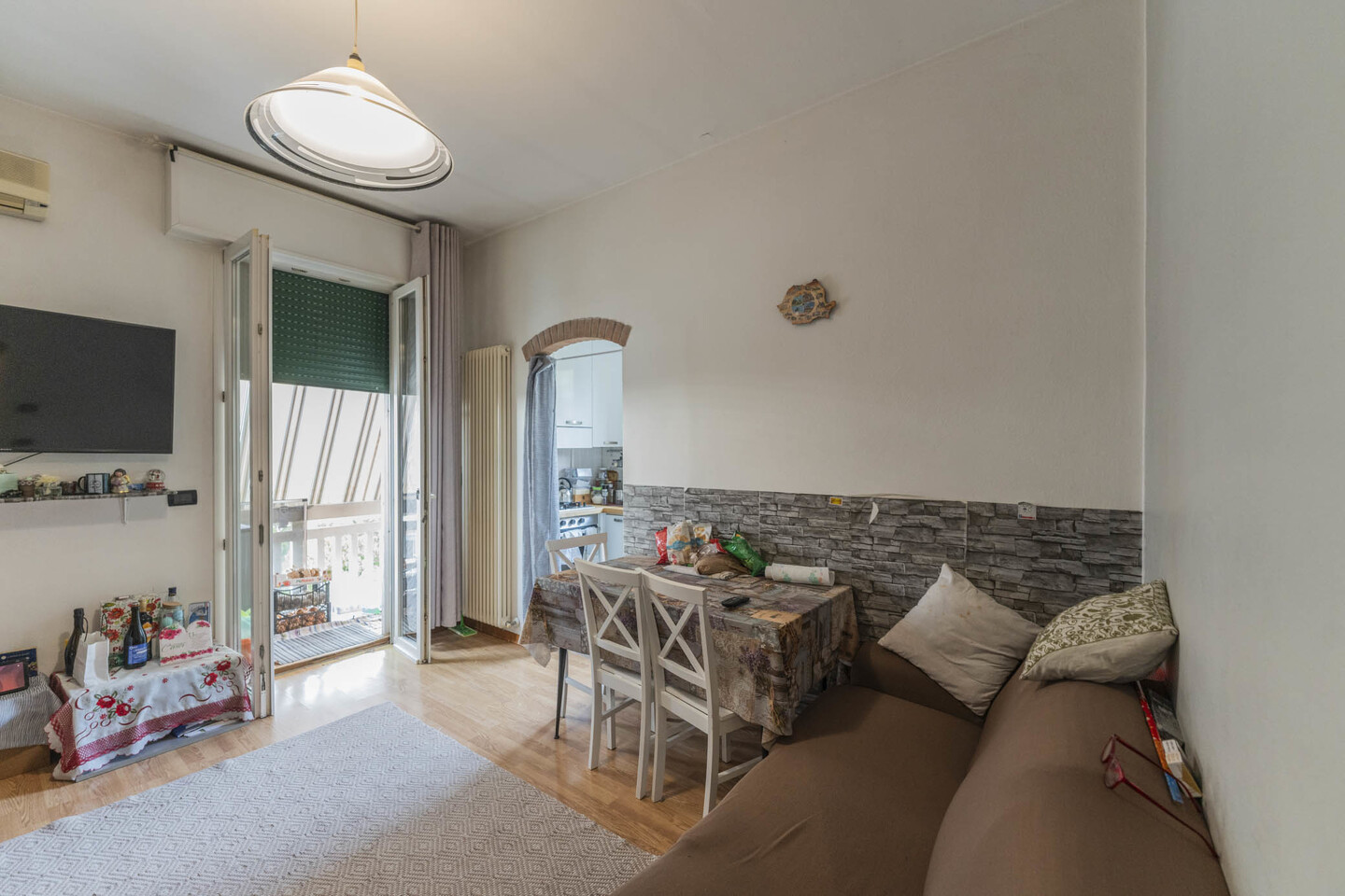 L’immobile è situato al terzo piano e così composto: ingresso, soggiorno con cucinotto (dai quali è possibile accedere direttamente al balcone), camera matrimoniale, camera doppia e bagno. Completano la proprietà soffitta, garage e cantina.