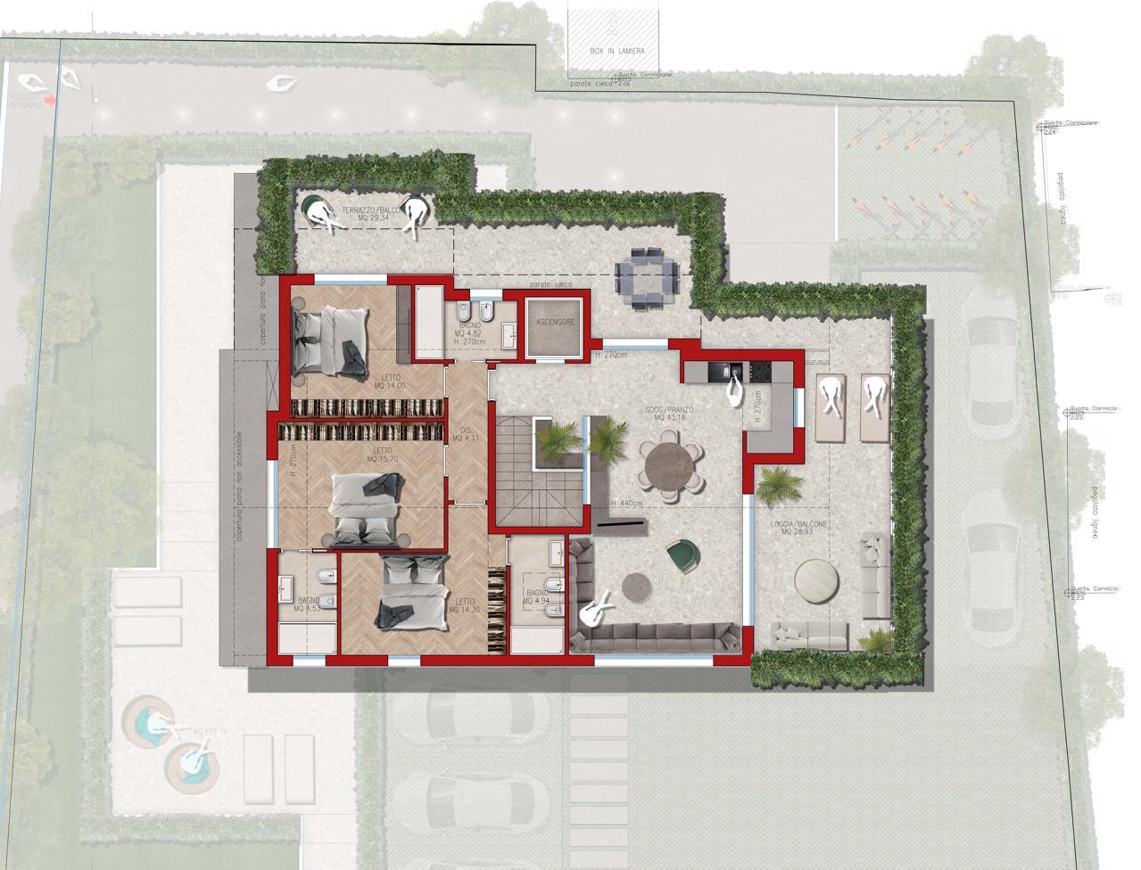 La zona notte è composta da tre ampie camere matrimoniali, di cui due con bagno interno, oltre a un terzo bagno padronale, garantendo privacy e funzionalità.