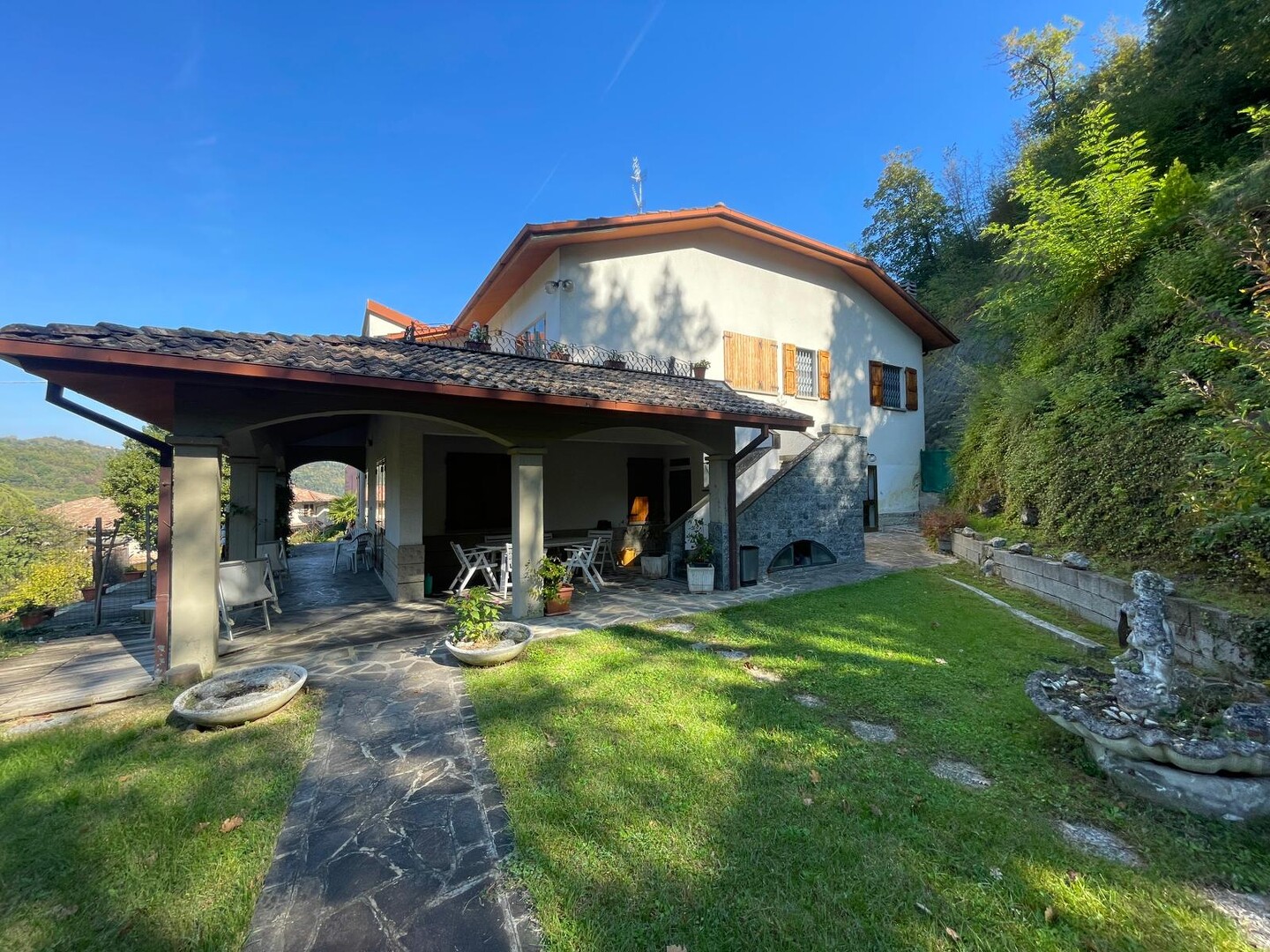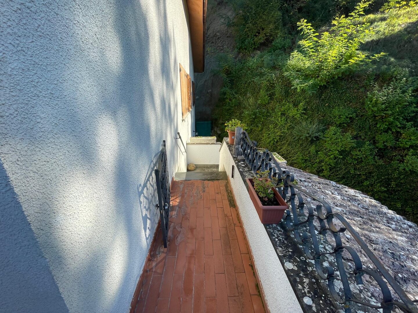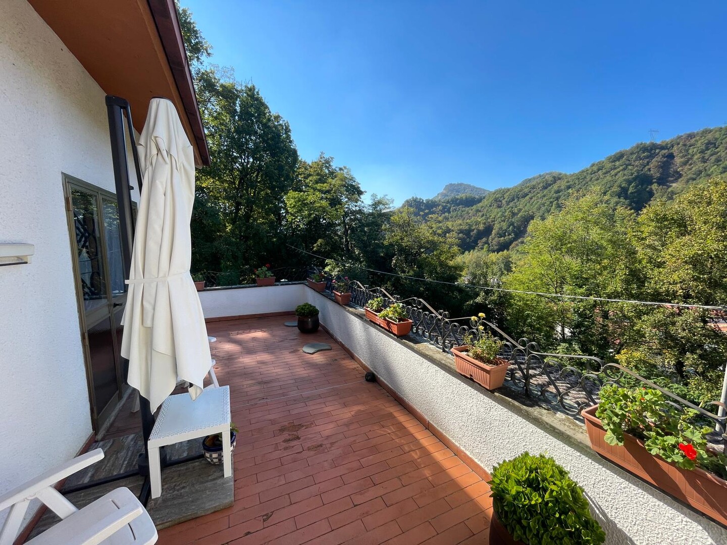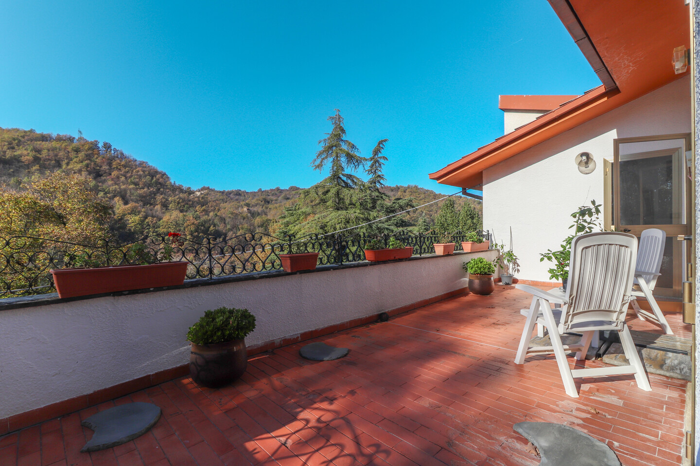 Risalendo dal giardino privato, attraverso la scala che conduce al primo piano, si arriva a un terrazzo abitabile che sembra sospeso sulla vallata: è da qui che si entra in casa, ed è qui che si percepisce subito la bellezza di questo luogo. L’appartamento si apre con un ingresso che accompagna verso un salone luminoso, ampio, ideale per vivere momenti di vera quotidianità. La cucina, grande e accogliente, è pensata per chi ama la convivialità, mentre la zona notte offre tre camere da letto che trasmettono tranquillità e spazi generosi. I due bagni completano una distribuzione comoda e funzionale. Completa l’abitazione due cantine ed un ampio laboratorio. È una casa che unisce privacy, panorama e ambienti caldi, dove ogni stanza racconta la sensazione di vivere in alto, in un punto privilegiato del paesaggio.