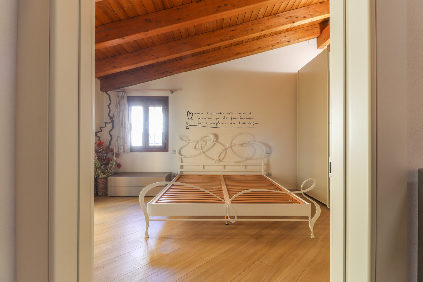 Il piano terra accoglie un ampio e luminoso soggiorno con angolo cottura, perfettamente organizzato per vivere la zona giorno in modo pratico e contemporaneo, un bagno con doccia e un comodo ripostiglio ricavato nel sottoscala. Al primo piano si sviluppa la zona notte tutta con bellissimi soffitti mansardati in legno, composta da un disimpegno, 2 camere matrimoniali, 1 camera singola e un secondo bagno finestrato sempre con doccia.