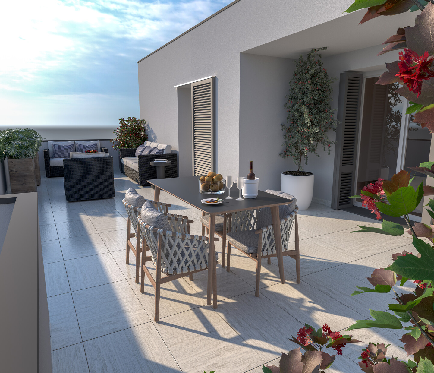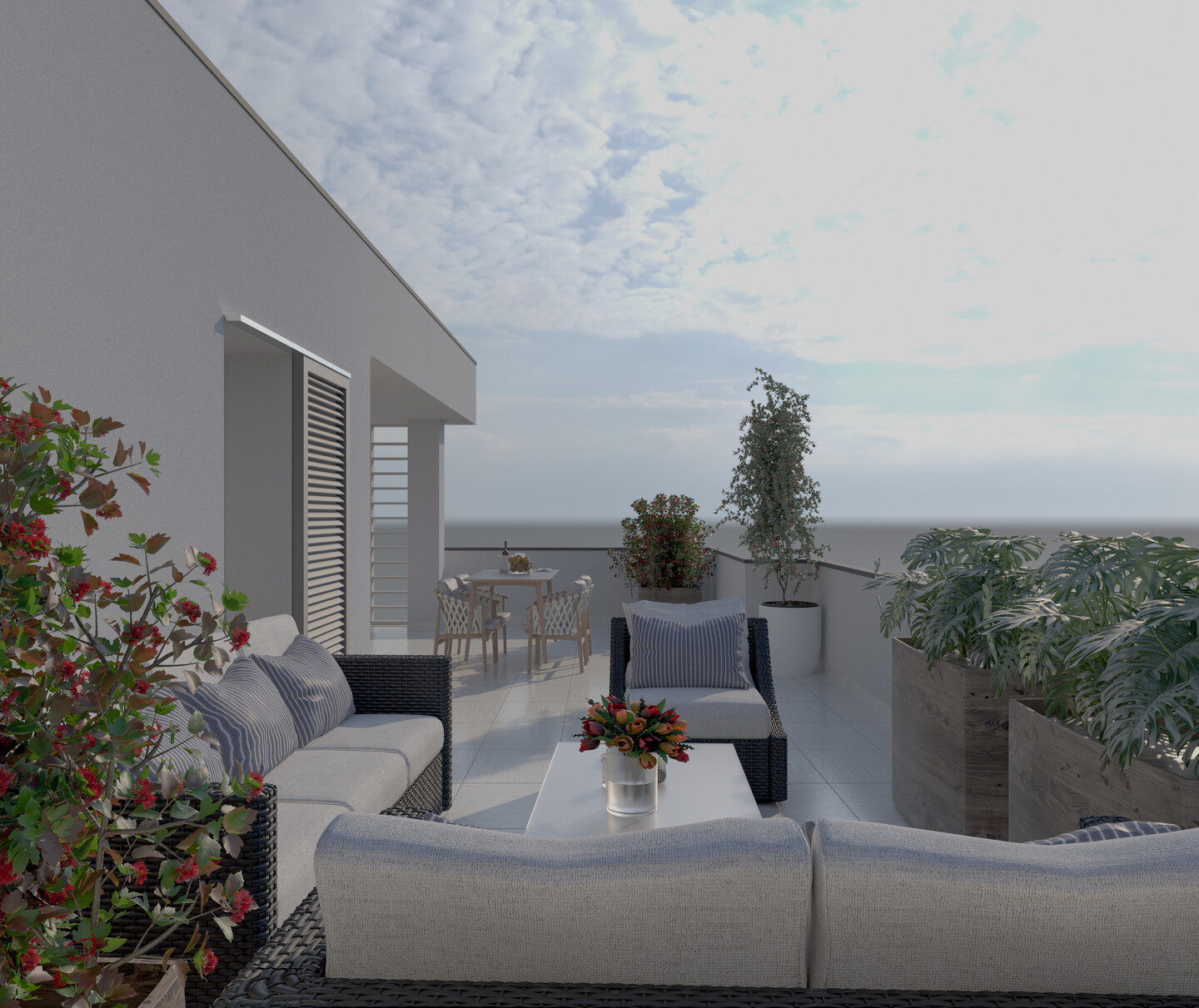 LOTTO 2 Appartamento 15 sito al terzo ed ultimo piano con quadri affaccio, composto da ampio soggiorno con cucina a vista ed affaccio su splendido terrazzo dove poter organizzare aperitivi e bbq con amici nelle calde serate estive, disimpegno zona notte, 1 camera matrimoniale con affaccio sull’ampio terrazzo, 1 camera doppia ed una terza camera con affaccio su ulteriore balcone, due bagni entrambi finestrati, 1 stanza cabina armadio.