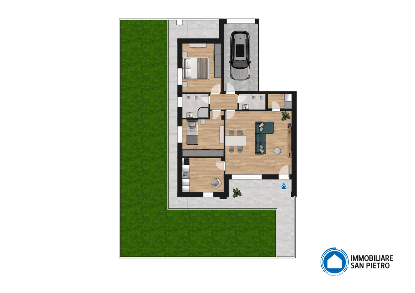 Ingresso su un ampio soggiorno con accesso al portico ed al giardino privato, cucina abitabile, 2 camere da letto matrimoniali, 2 bagni, vano tecnico.
