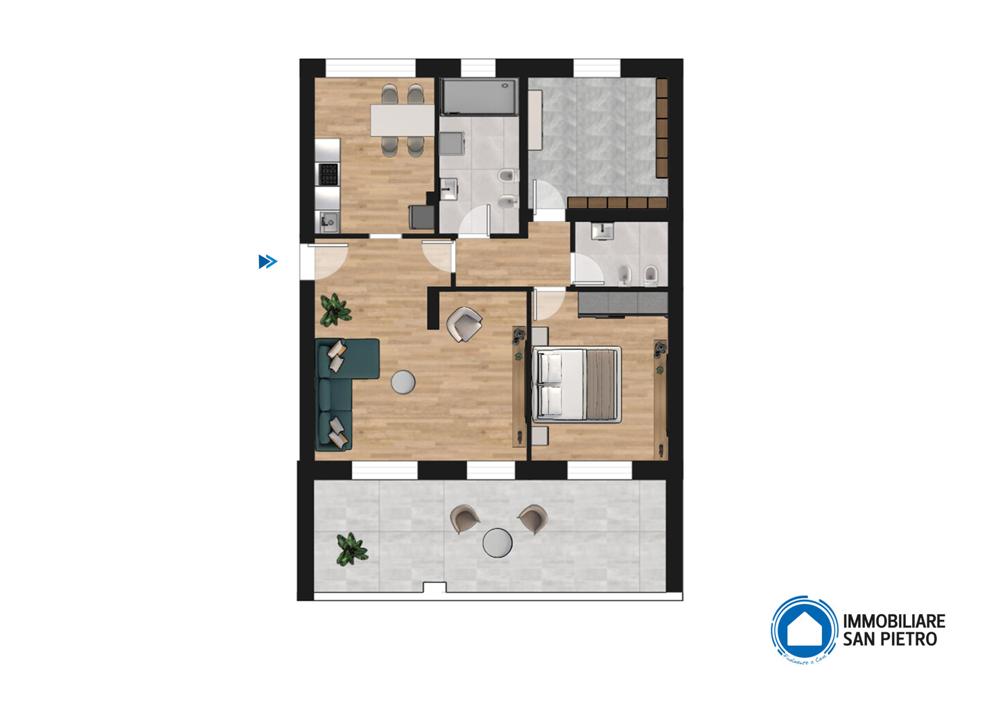 L’appartamento è composto da ingresso su zona giorno di 26 mq, cucina abitabile, due bagni, due camere matrimoniali e terrazzo di 21 mq. Per completare la proprietà sono presenti garage e posto auto.