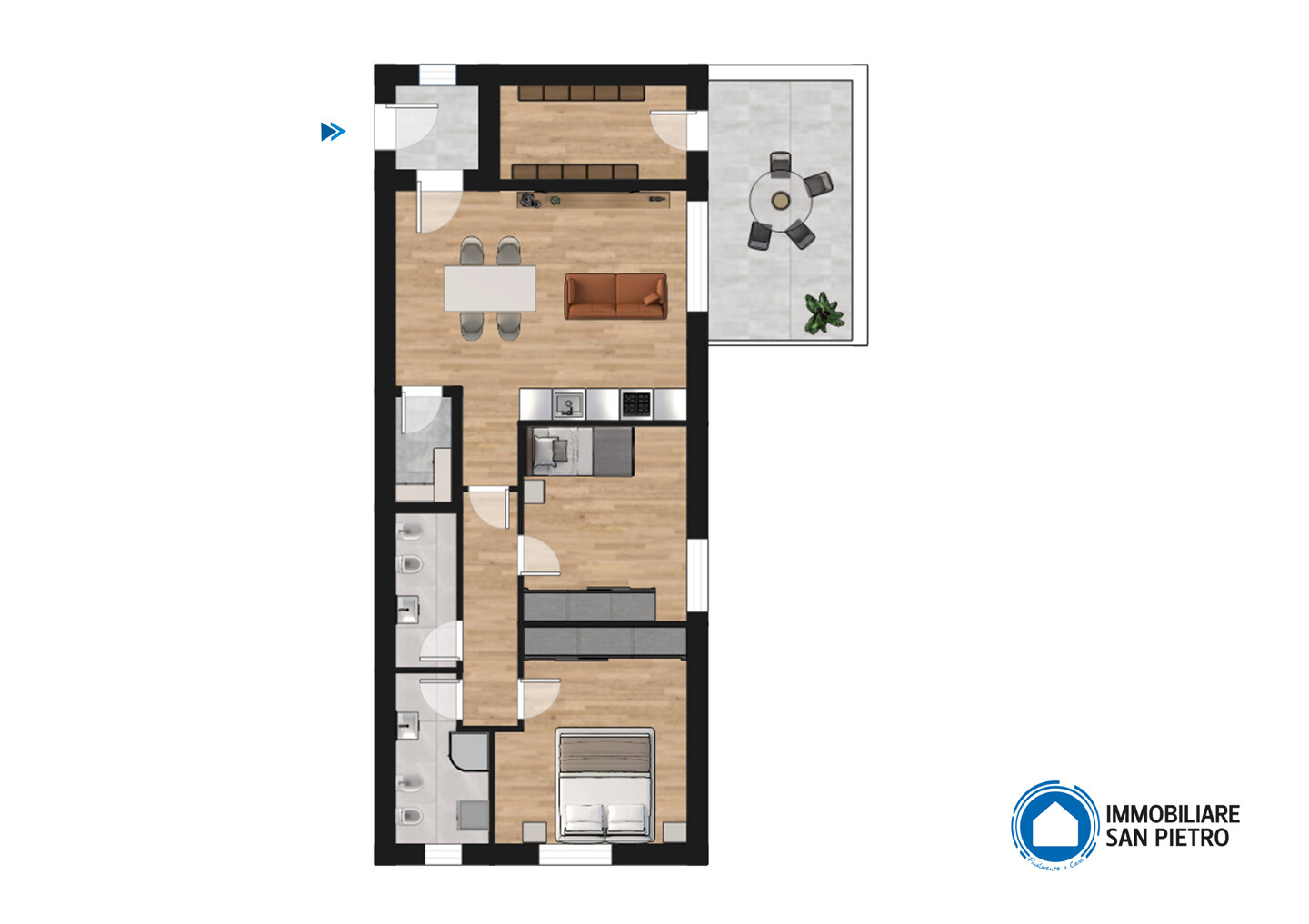 L’appartamento è composto da ingresso su zona giorno con angolo cottura e terrazzo, camera matrimoniale, camera doppia e due bagni. A completare la proprietà sono presenti una cantina al piano, autorimessa e posto auto.