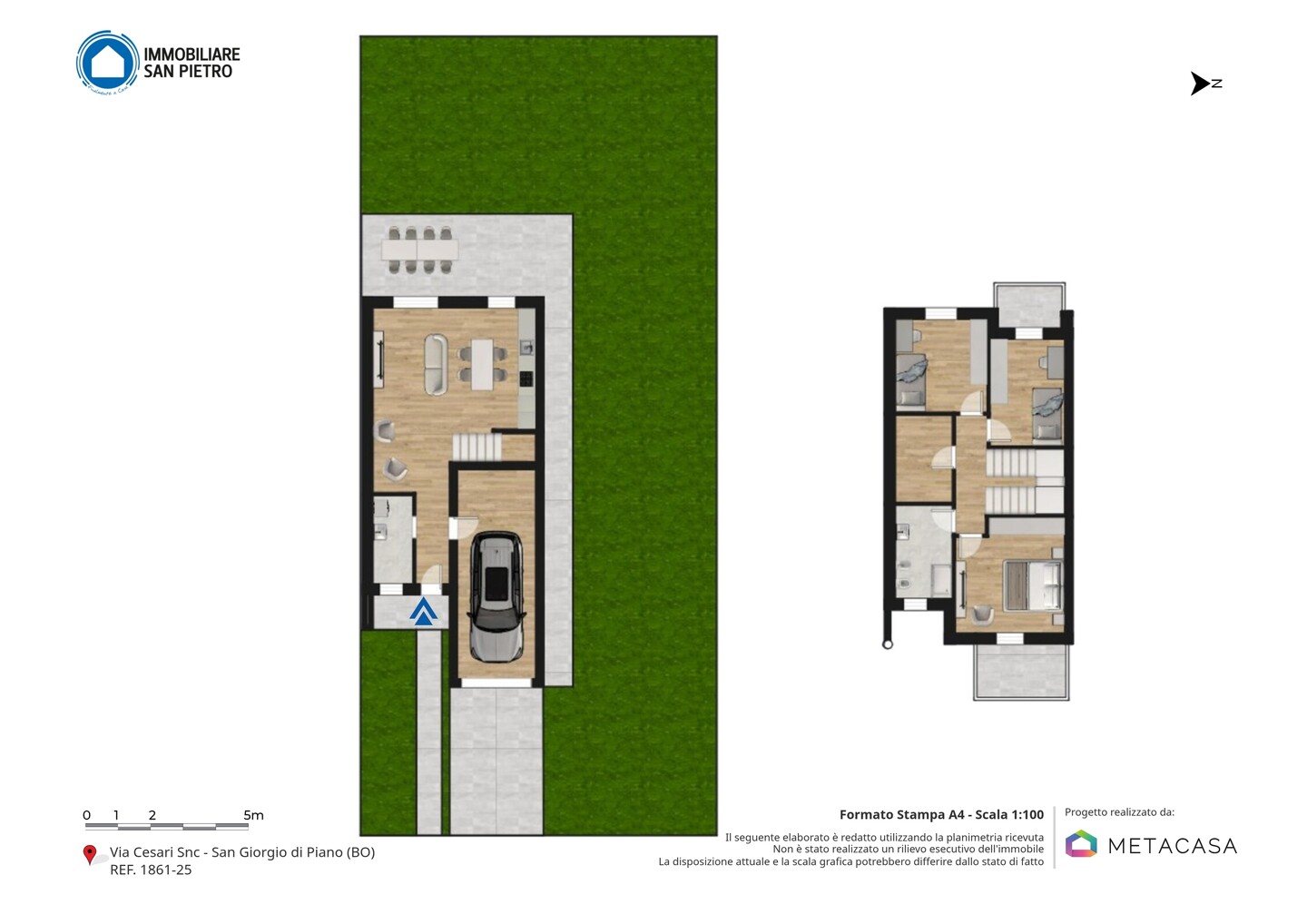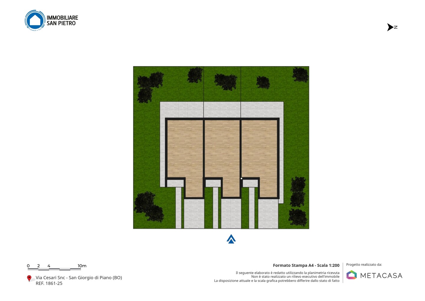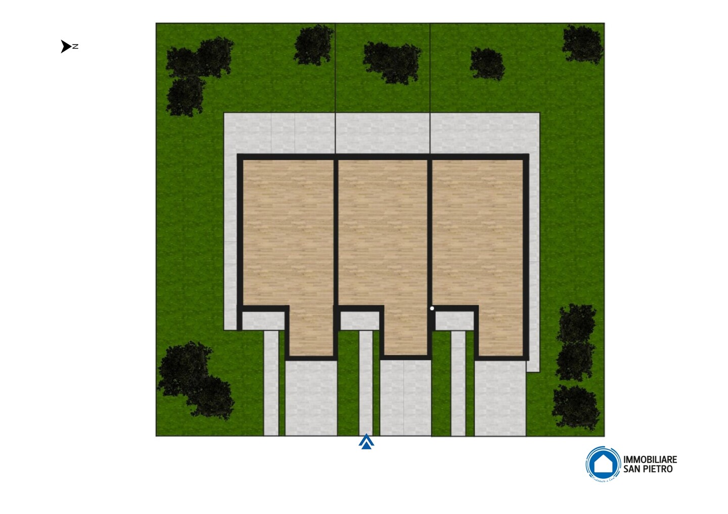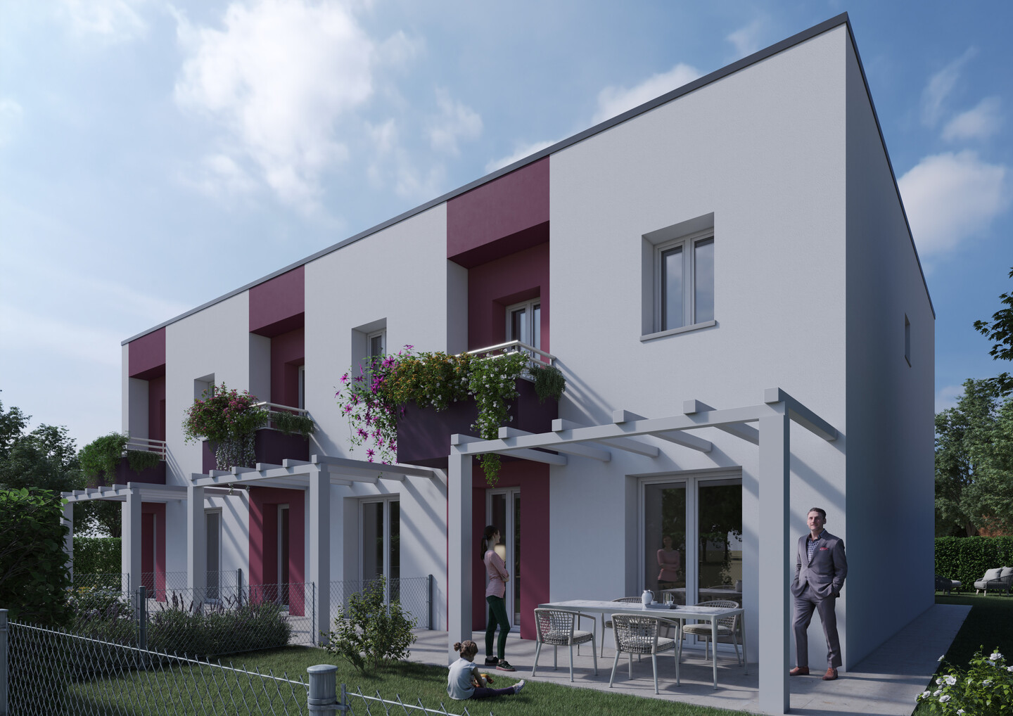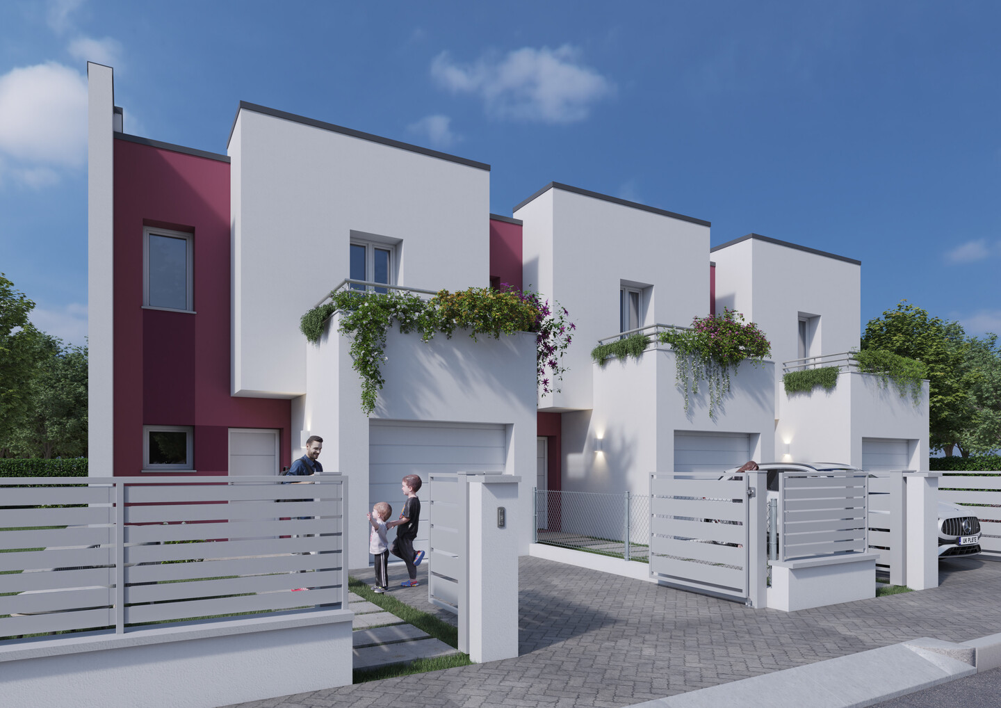 Porzione di trifamiliare disposta su due livelli con giardino privato ed ingresso indipendente. Al piano terra abbiamo ingresso su disimpegno, soggiorno con cucina a vista, lavanderia ed accesso diretto al garage; al piano superiore 3 camere da letto, vano tecnico, bagno e due balconi.