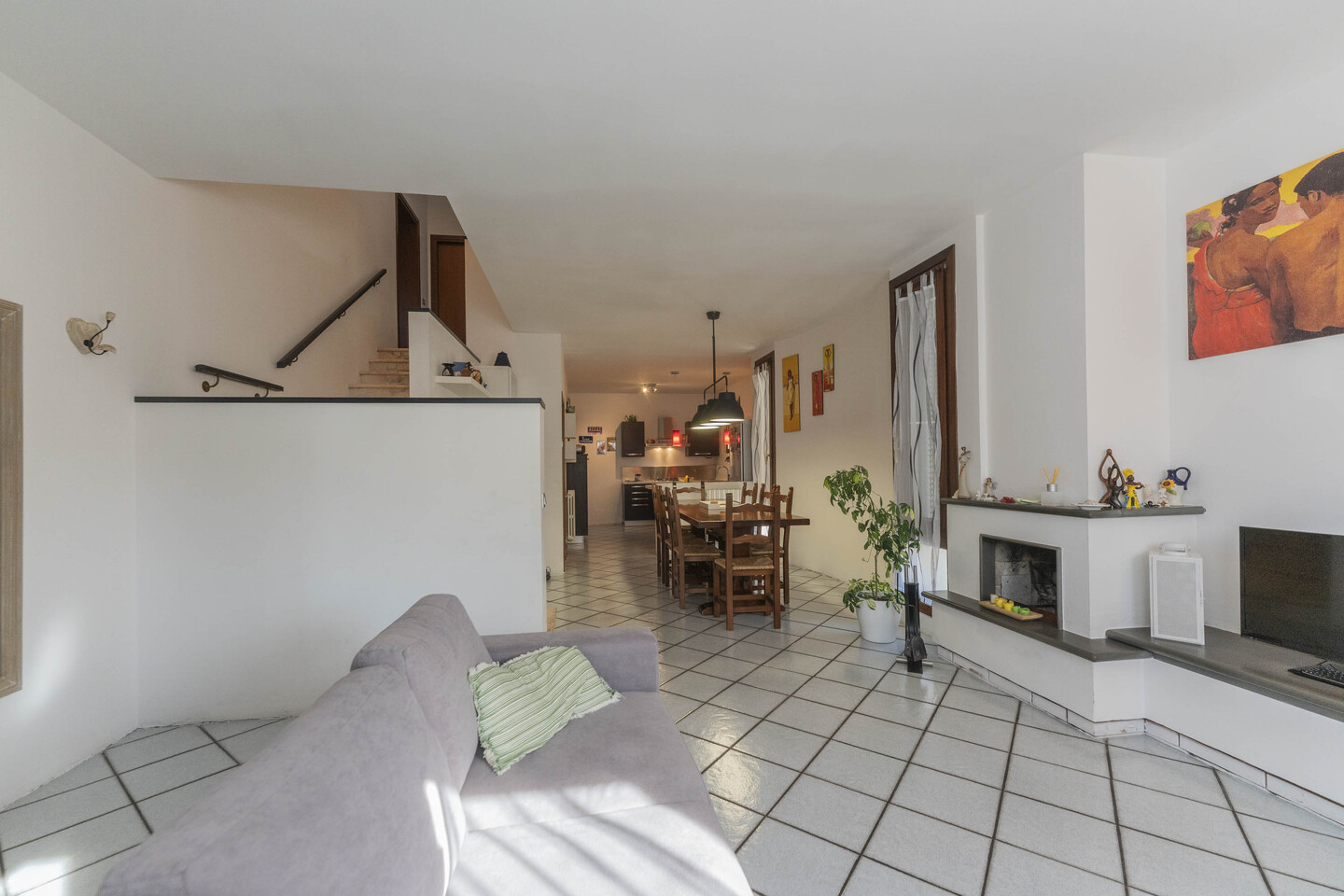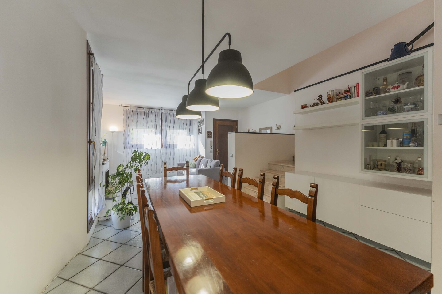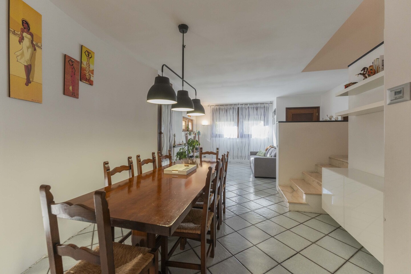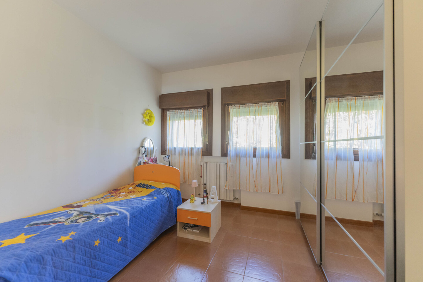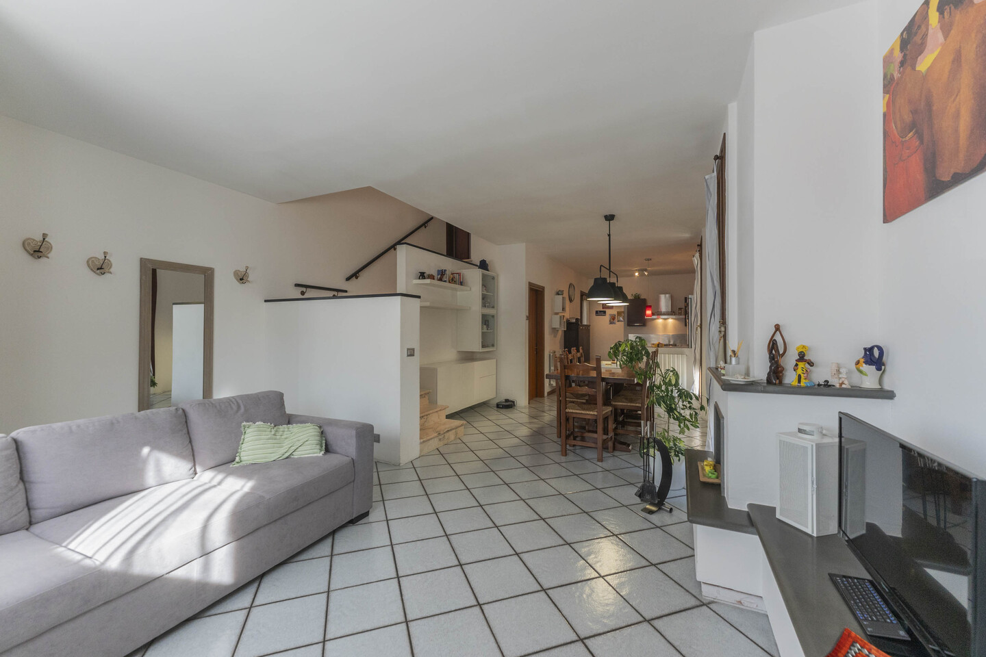 L’immobile è sviluppato su due livelli e così composto: al piano terra troviamo il soggiorno con annessa sala da pranzo, cucina abitabile ed il primo bagno. Una scala conduce al secondo piano dove sono presenti 3 camere da letto (matrimoniale, doppia e singola) divise da un disimpegno dal quale è possibile accedere direttamente al balcone ed il secondo bagno. Completano la proprietà garage, cantina, posto auto scoperto, portico e giardino privato al pian terreno.